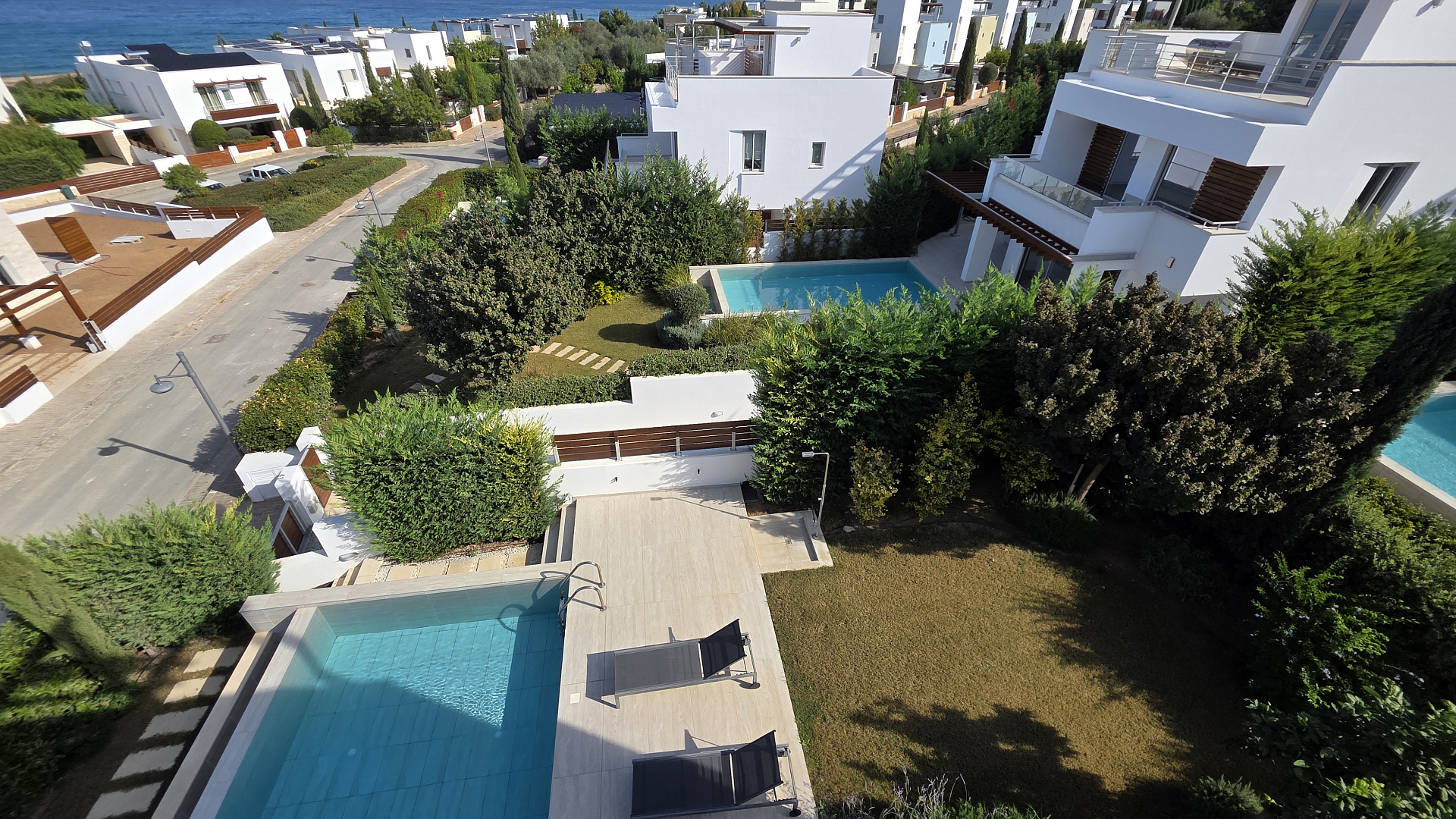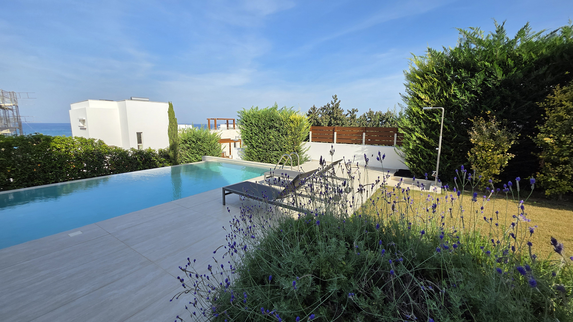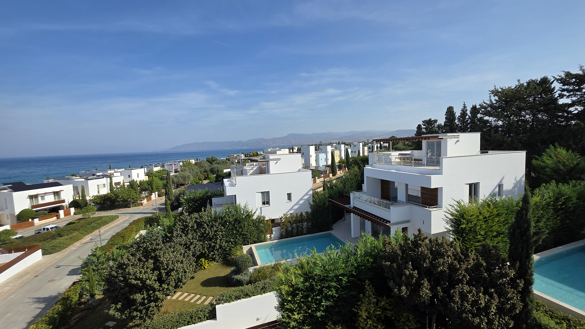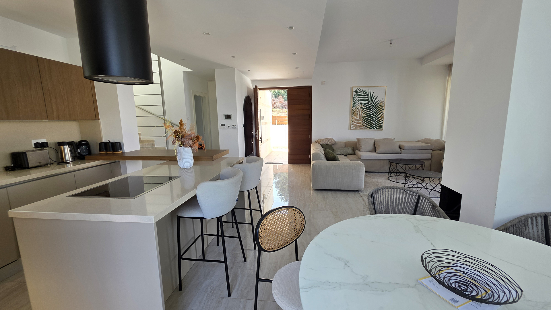 A four-bedroom villa with three bathrooms is available for rent in a residential complex ,200 meters from the beach. The house features panoramic windows, spacious terraces, a garden, and a private swimming pool, set on a large landscaped plot with sea and mountain views. The ground floor includes a living room with a fireplace and a fully equipped kitchen, while the second floor offers three bedrooms, one of which has an en-suite bathroom. The fourth bedroom with a window and its own bathroom is located on the lower ground level. The villa is equipped with a Smart Home system, VRV air conditioning, and underfloor heating. A covered parking space and a rooftop terrace are also available. The complex has 24-hour security.