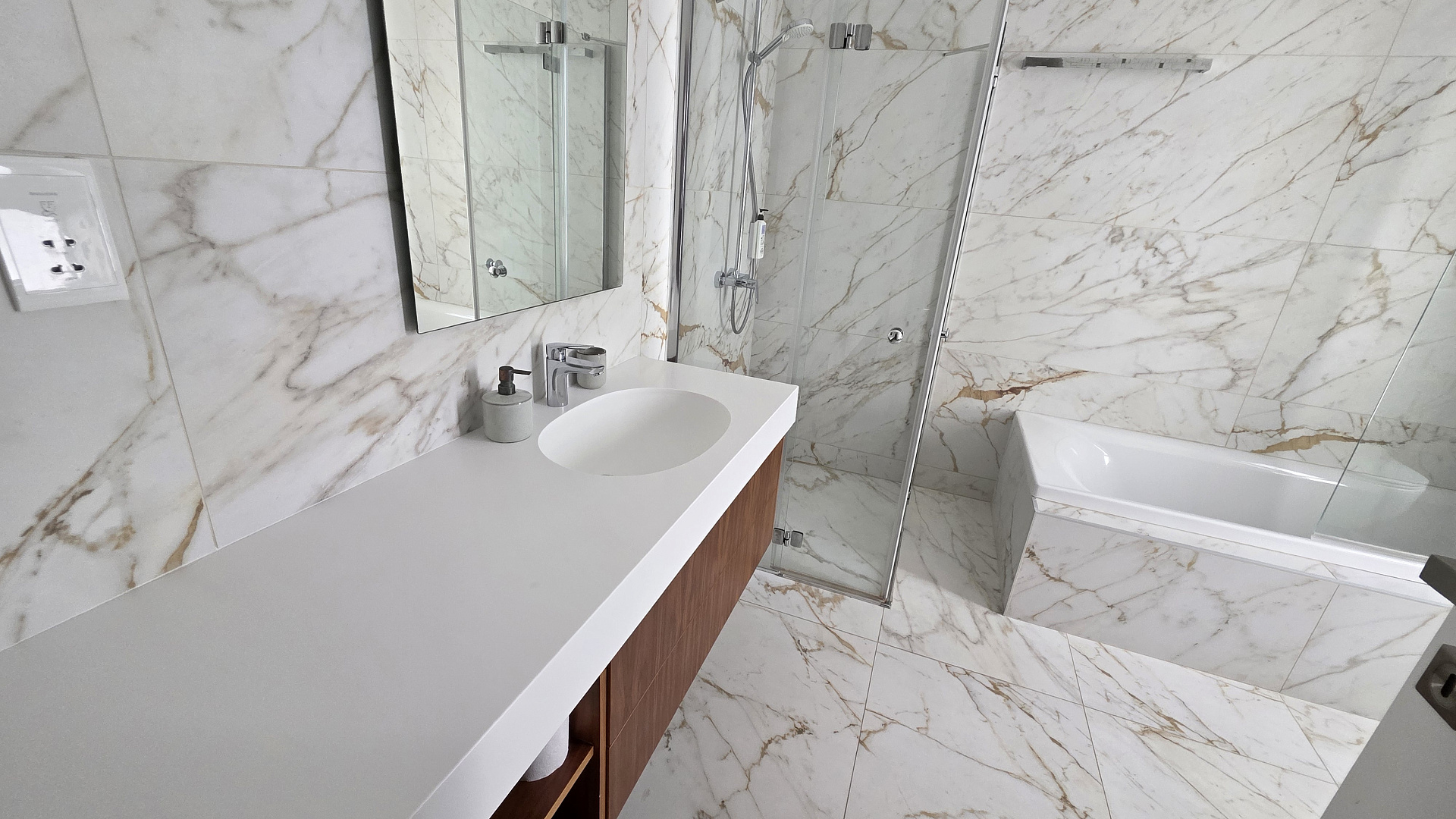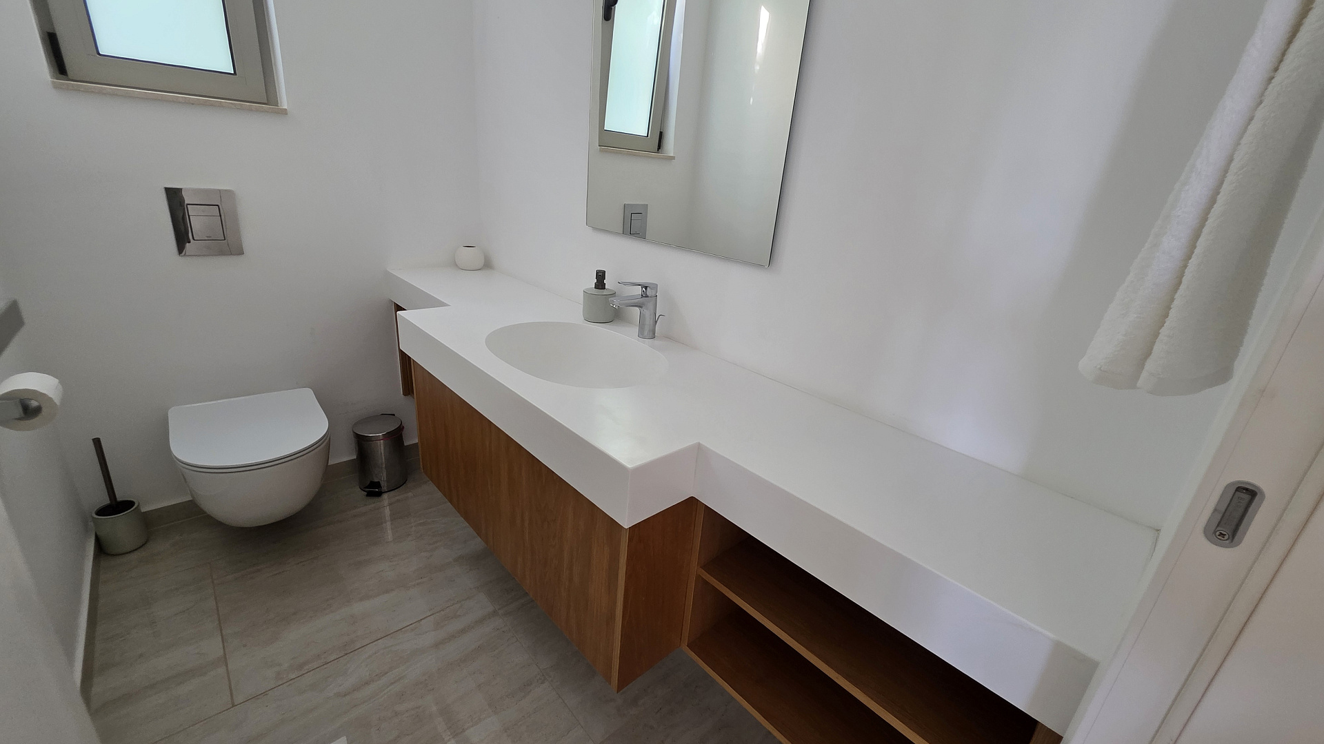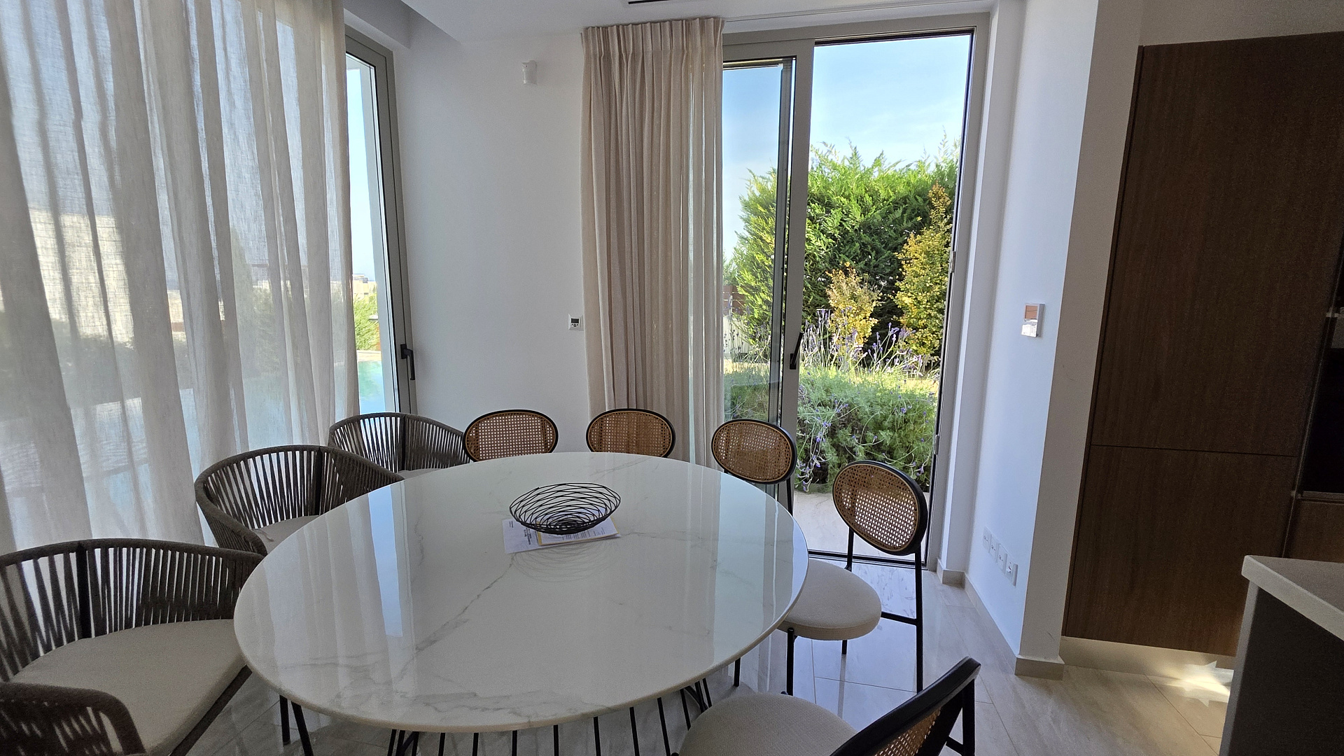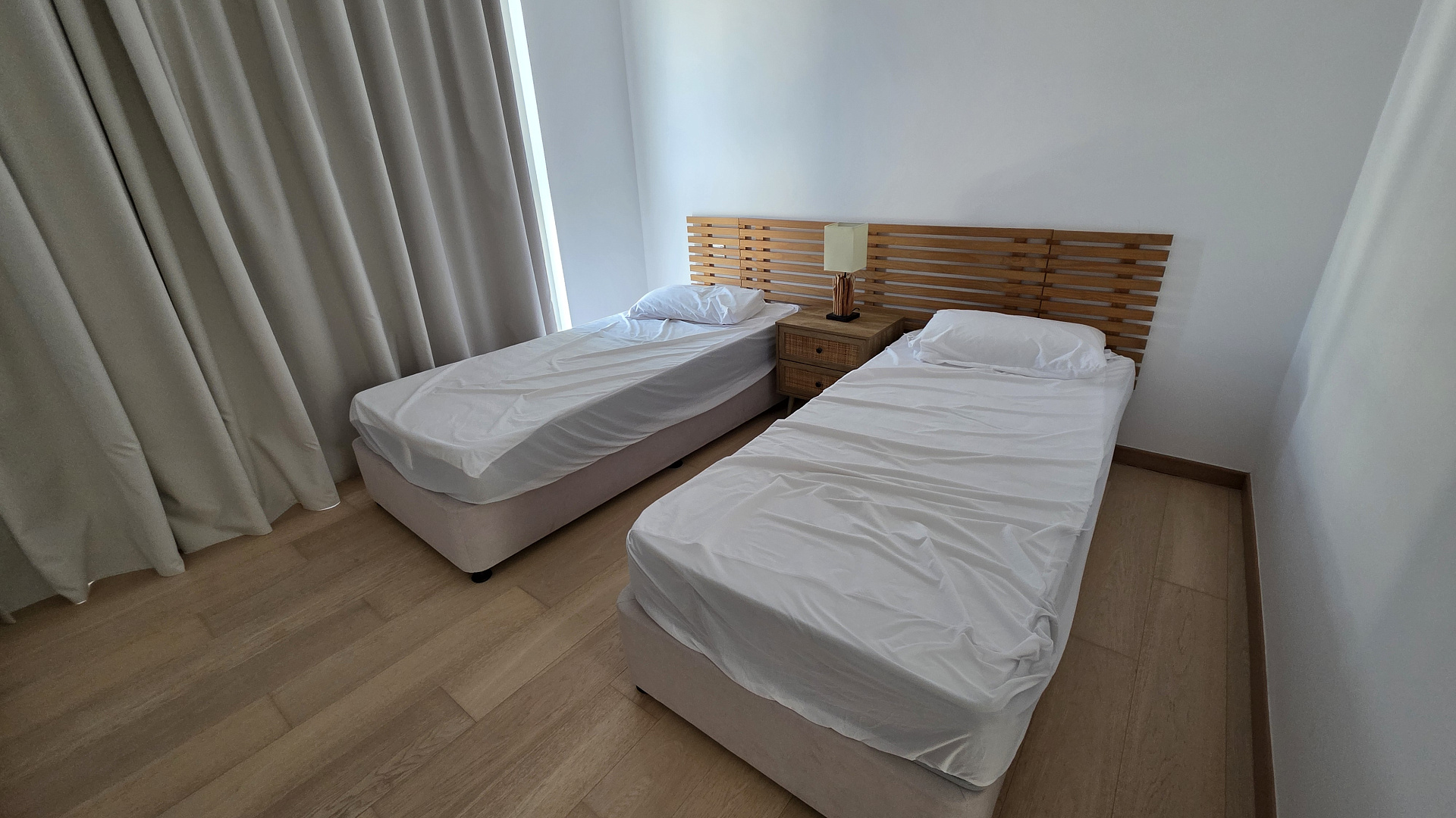 A four-bedroom villa with three bathrooms is available for rent in a residential complex ,200 meters from the beach. The house features panoramic windows, spacious terraces, a garden, and a private swimming pool, set on a large landscaped plot with sea and mountain views. The ground floor includes a living room with a fireplace and a fully equipped kitchen, while the second floor offers three bedrooms, one of which has an en-suite bathroom. The fourth bedroom with a window and its own bathroom is located on the lower ground level. The villa is equipped with a Smart Home system, VRV air conditioning, and underfloor heating. A covered parking space and a rooftop terrace are also available. The complex has 24-hour security.