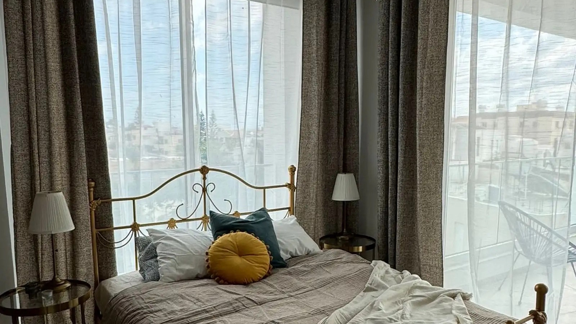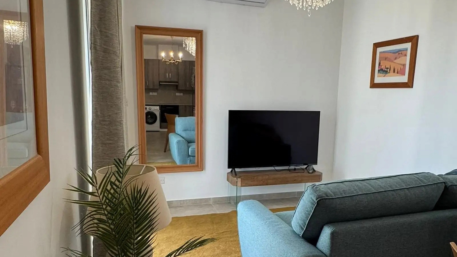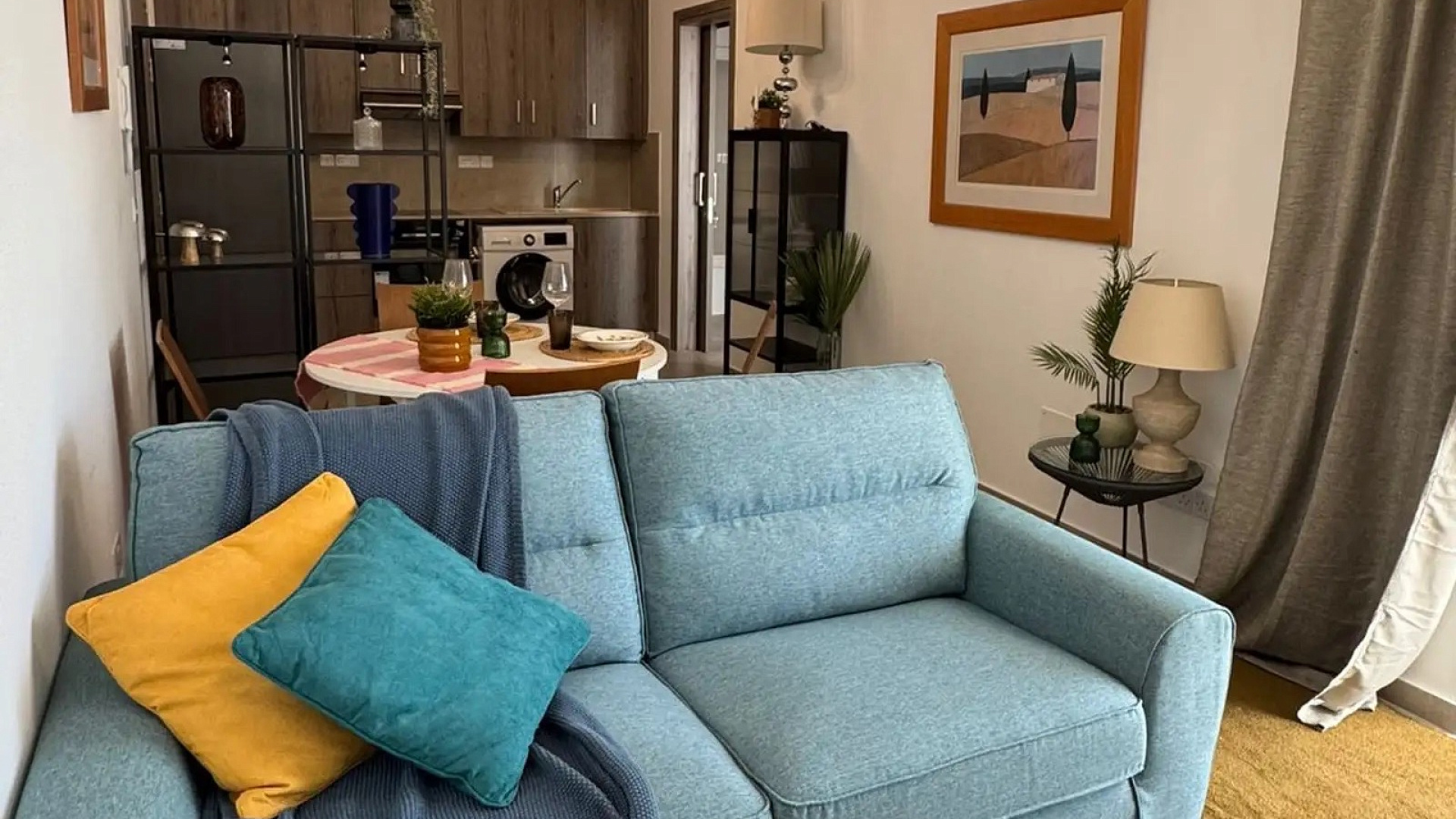 One-bedroom apartment of 65 m2 for rent in Kato Polemidia, Limassol. The apartment includes 1 bedroom, 1 bathroom, an open-plan kitchen, a living room, a balcony and a storage room, and has access to a communal garden and a rooftop pool. There is a barbecue area. The property is fully furnished and equipped with household appliances, including a complete air conditioning system in all rooms. The apartment is located on the 2nd floor. The complex is located in a convenient location next to Ikea, Jambo and Alphamega, with quick access to a transport interchange; the street is dead-end, which provides additional privacy. The residential complex is a new building built in 2025 with an elevator, covered parking and a storage room. There is an olive grove near the house.