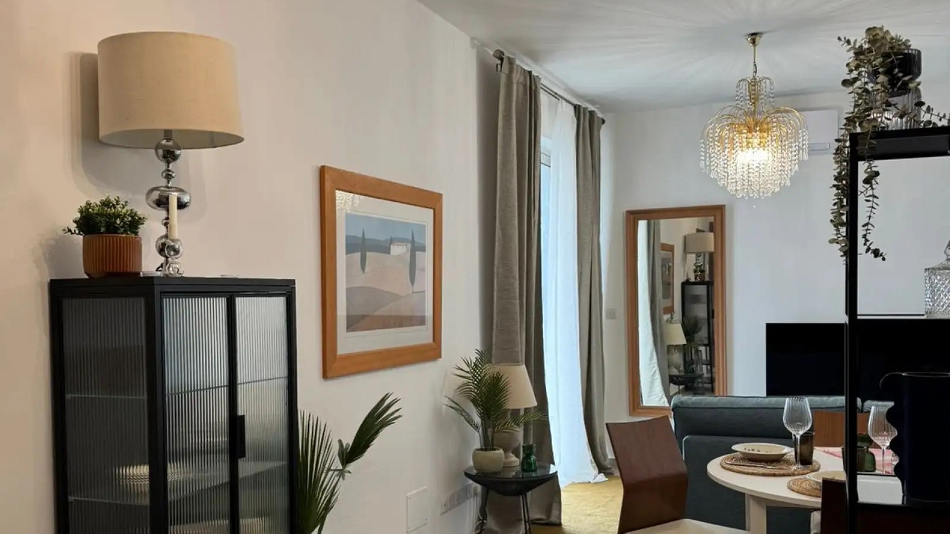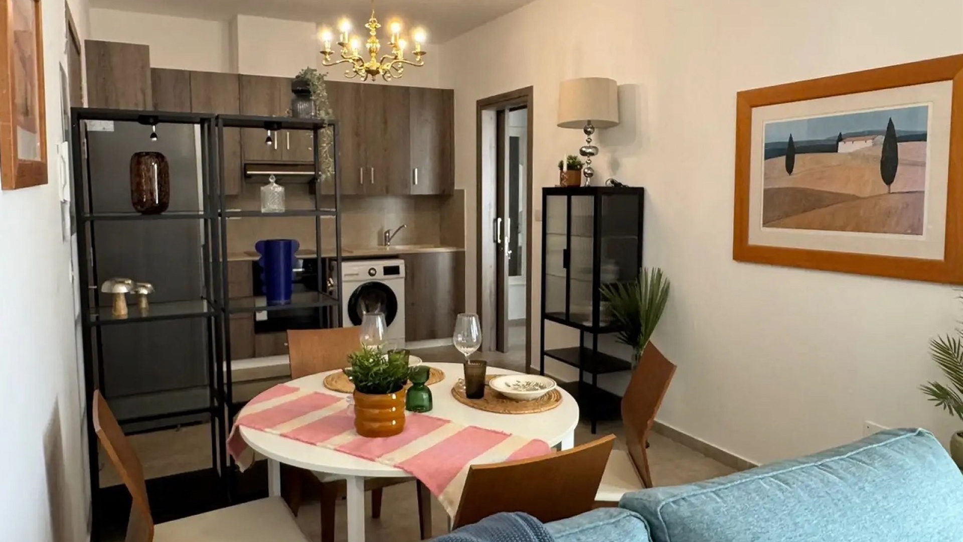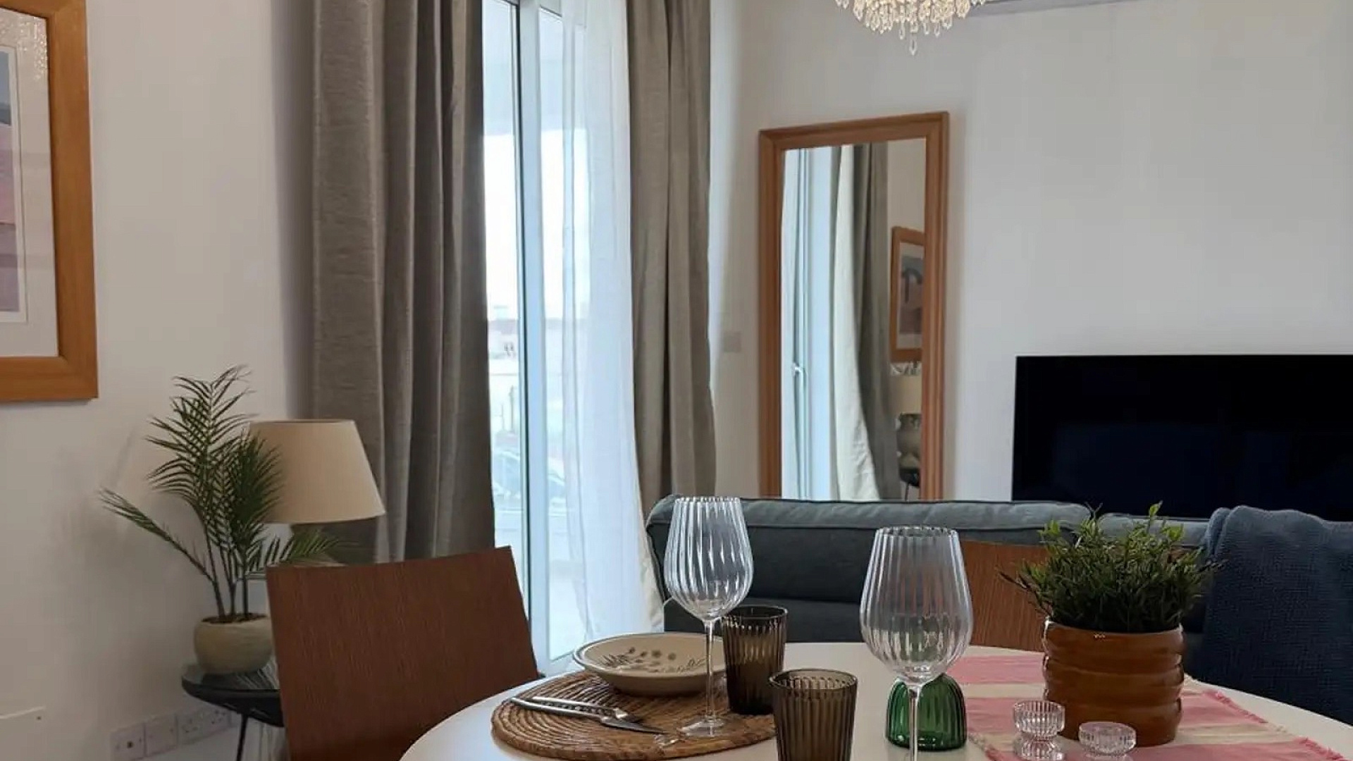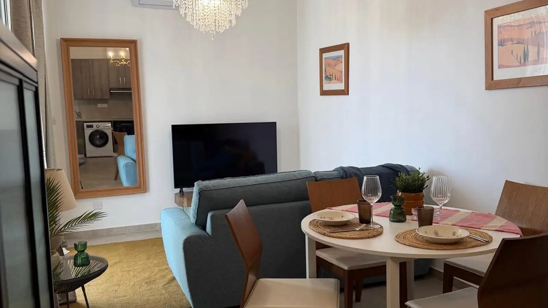 One-bedroom apartment of 65 m2 for rent in Kato Polemidia, Limassol. The apartment includes 1 bedroom, 1 bathroom, an open-plan kitchen, a living room, a balcony and a storage room, and has access to a communal garden and a rooftop pool. There is a barbecue area. The property is fully furnished and equipped with household appliances, including a complete air conditioning system in all rooms. The apartment is located on the 2nd floor. The complex is located in a convenient location next to Ikea, Jambo and Alphamega, with quick access to a transport interchange; the street is dead-end, which provides additional privacy. The residential complex is a new building built in 2025 with an elevator, covered parking and a storage room. There is an olive grove near the house.