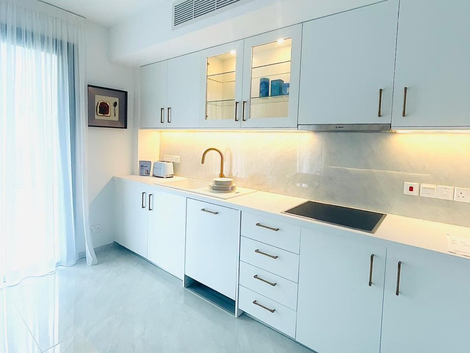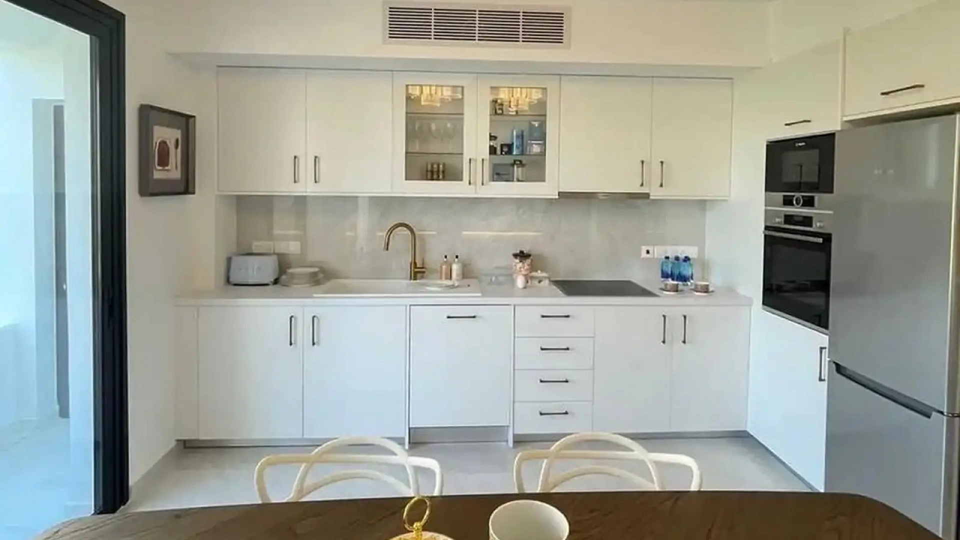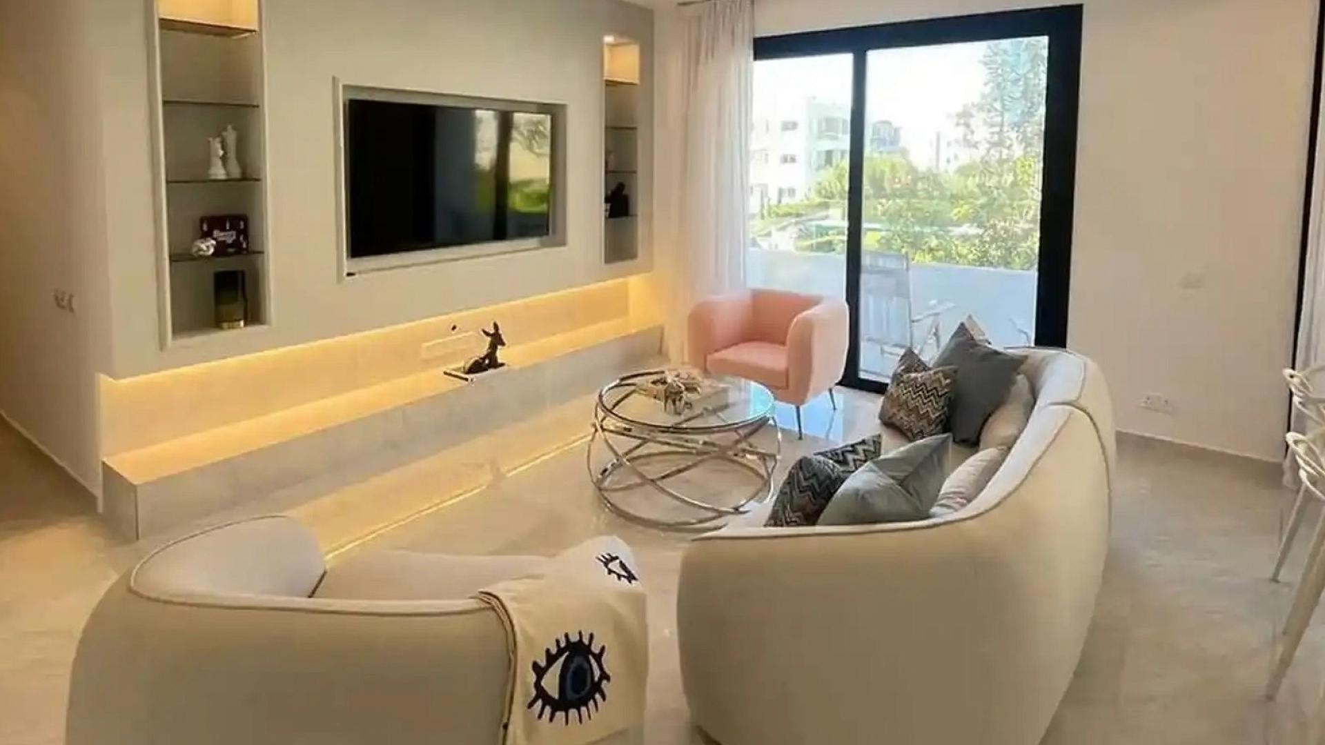 For sale 4-bedroom apartment with a view of the pool, garden and sea. Furnished. The apartment has 3 bathrooms, of which 2 with a shower and 1 with a bathtub. There is a small laundry room. Air conditioning in all rooms. Underfloor heating. Covered parking. Tennis court on the territory of the gated complex. Located in a prestigious area, close to Poseidonia Hotel and all amenities.