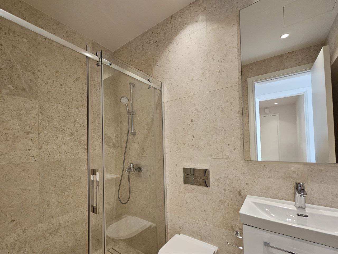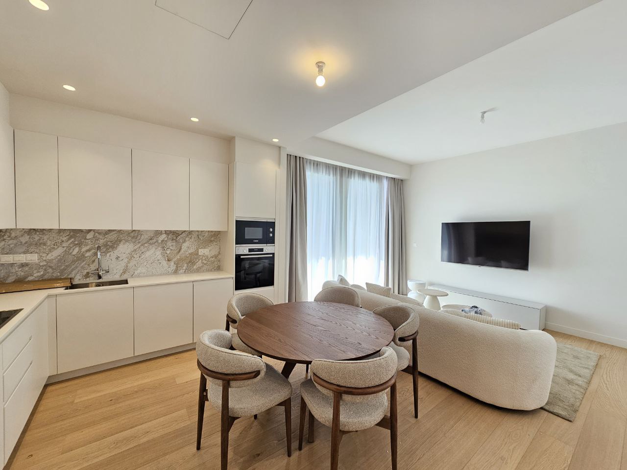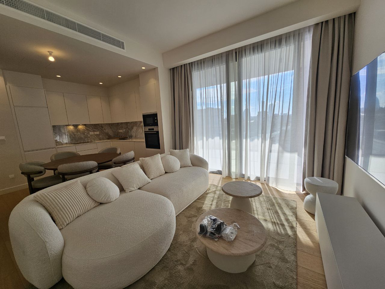 Two-bedroom apartment of 115 m2 for rent in Germasogeia, Limassol. The apartments include two bedrooms, two bathrooms, an open plan kitchen and living room, and a spacious balcony. The property is fully furnished and equipped with household appliances, equipped with air conditioning systems in all rooms, Underfloor heating, alarm system; the complex has an elevator and a covered parking space. The residence is located on the 3rd floor of Block C in a prestigious complex, in an energy-efficient Class A building built in 2025. The sea is a short distance away, with shops, schools and other key amenities nearby. The complex has a landscaped garden, a communal swimming pool, a gym, a sauna and a children's area.