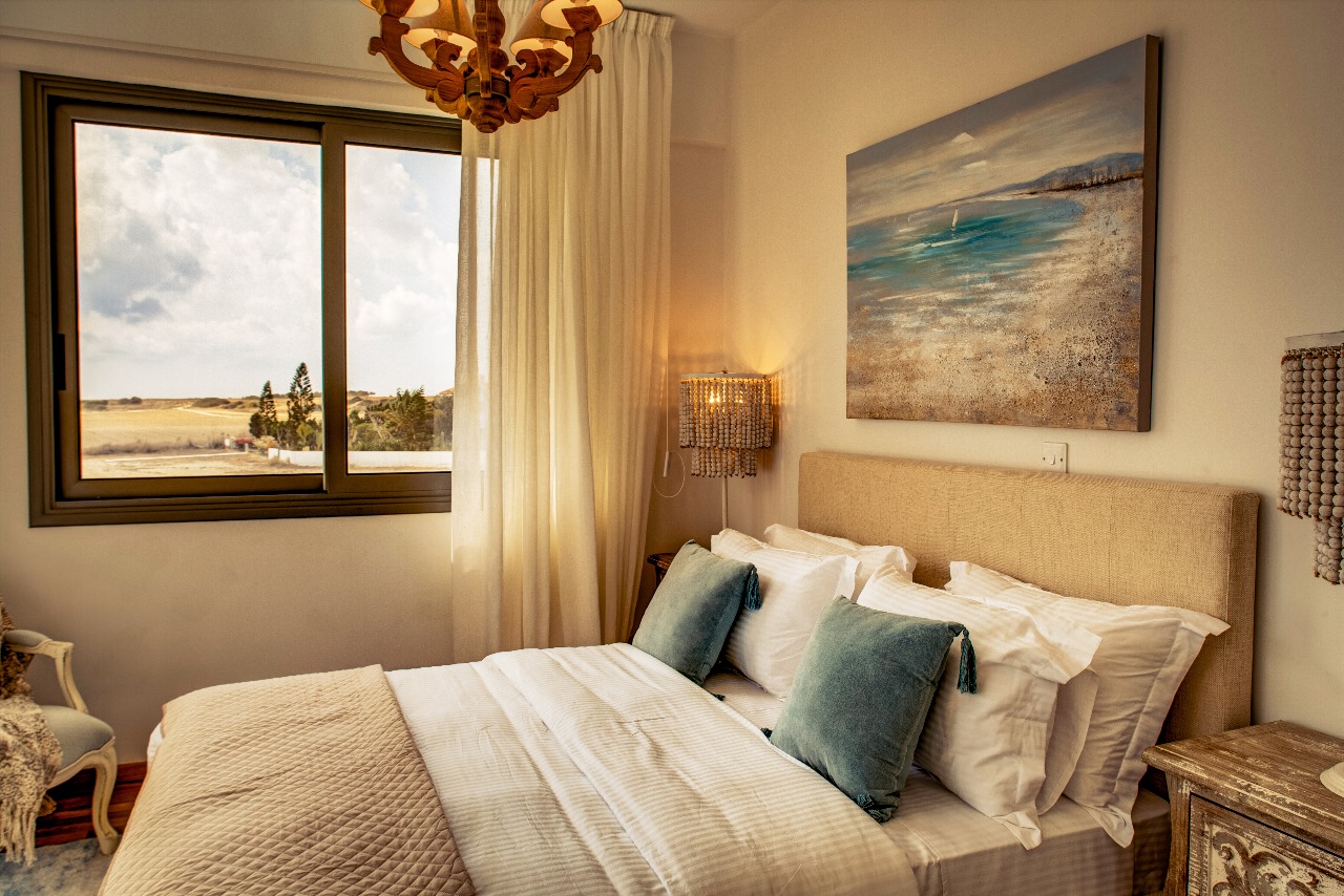 Three-bedroom villa for rent in Mazotos (Larnaca). The complex is located on the seashore. It has an outdoor communal pool, Jacuzzi, fitness center, landscaped gardens, 24-hour security and a beach with free sun loungers and umbrellas. Wi-Fi and private parking are available free of charge. The villa is designed in such a way as to maximize the living space, has an open floor plan, as well as large sliding glass doors, creating a feeling of lightness and spaciousness for the residents. Private gardens with large indoor and outdoor patios.