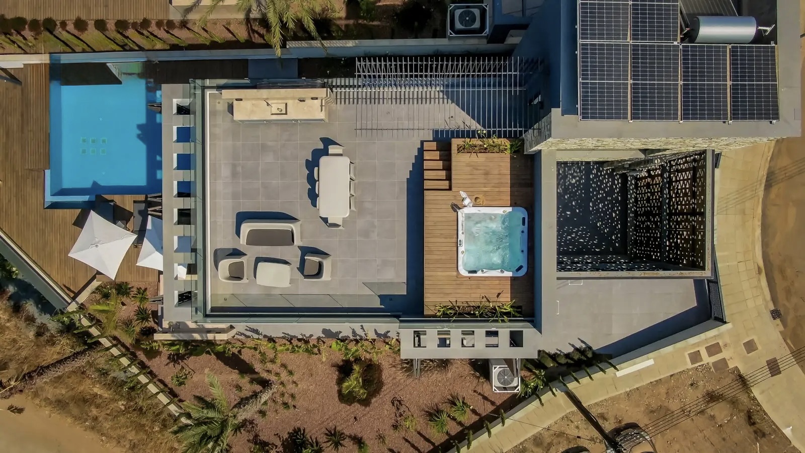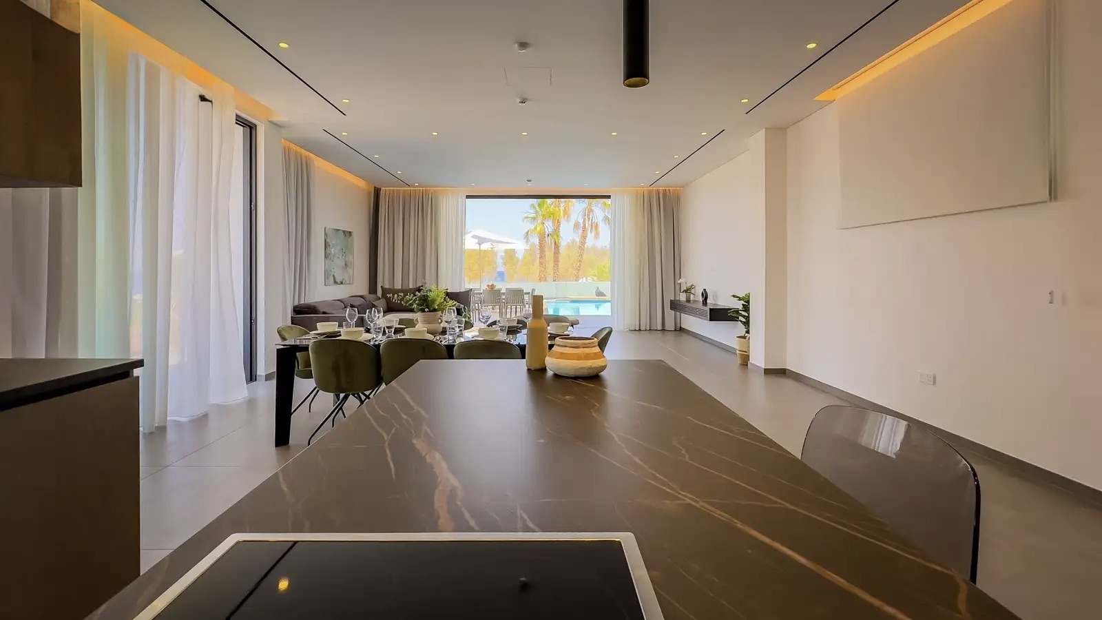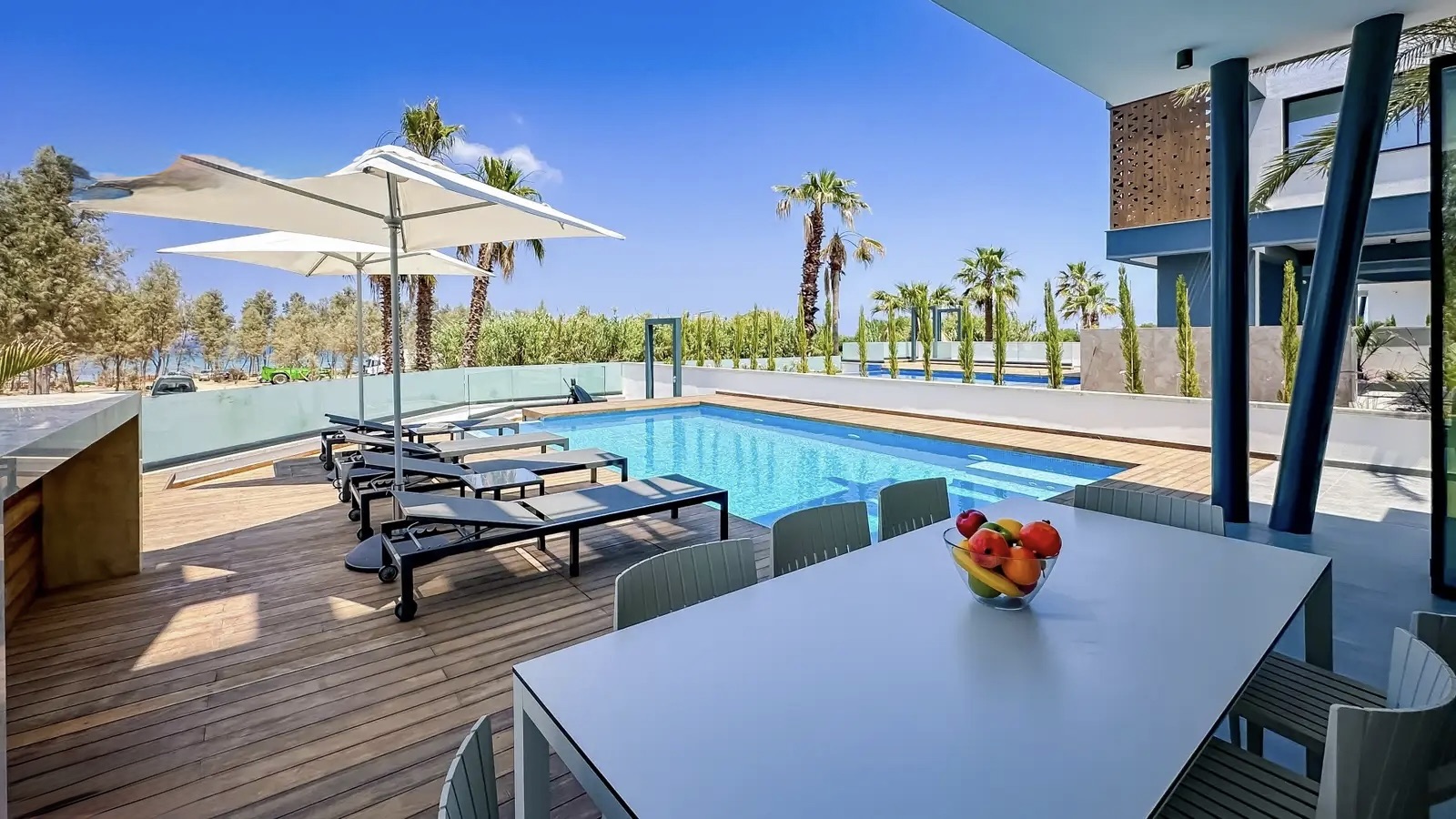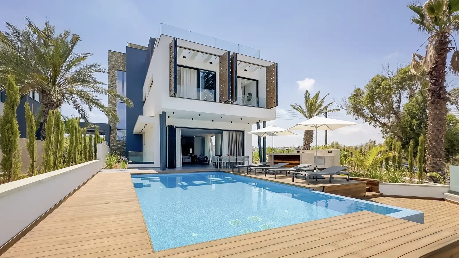 For rent a five-bedroom villa of 300 m2 on a plot of 544 m2 in the area of Paralimni, Famagusta. The villa includes five bedrooms, more than five bathrooms, a fully equipped kitchen, spacious living areas on several levels, a storage room, an elevator, as well as a private swimming pool and a well-maintained garden. The villa is fully furnished and equipped with all necessary household appliances, as well as air conditioning in all rooms. Additionally, there is a 74 m2 rooftop terrace with a Jacuzzi, barbecue area, dining area and lounge area, while the lower floor also includes a separate guest area with two bedrooms and several bathrooms. The property is located just 100 m from the sandy beach of Protaras and within easy reach of Ayia Napa resort, which provides quick access to the sea, entertainment and infrastructure of the coast.