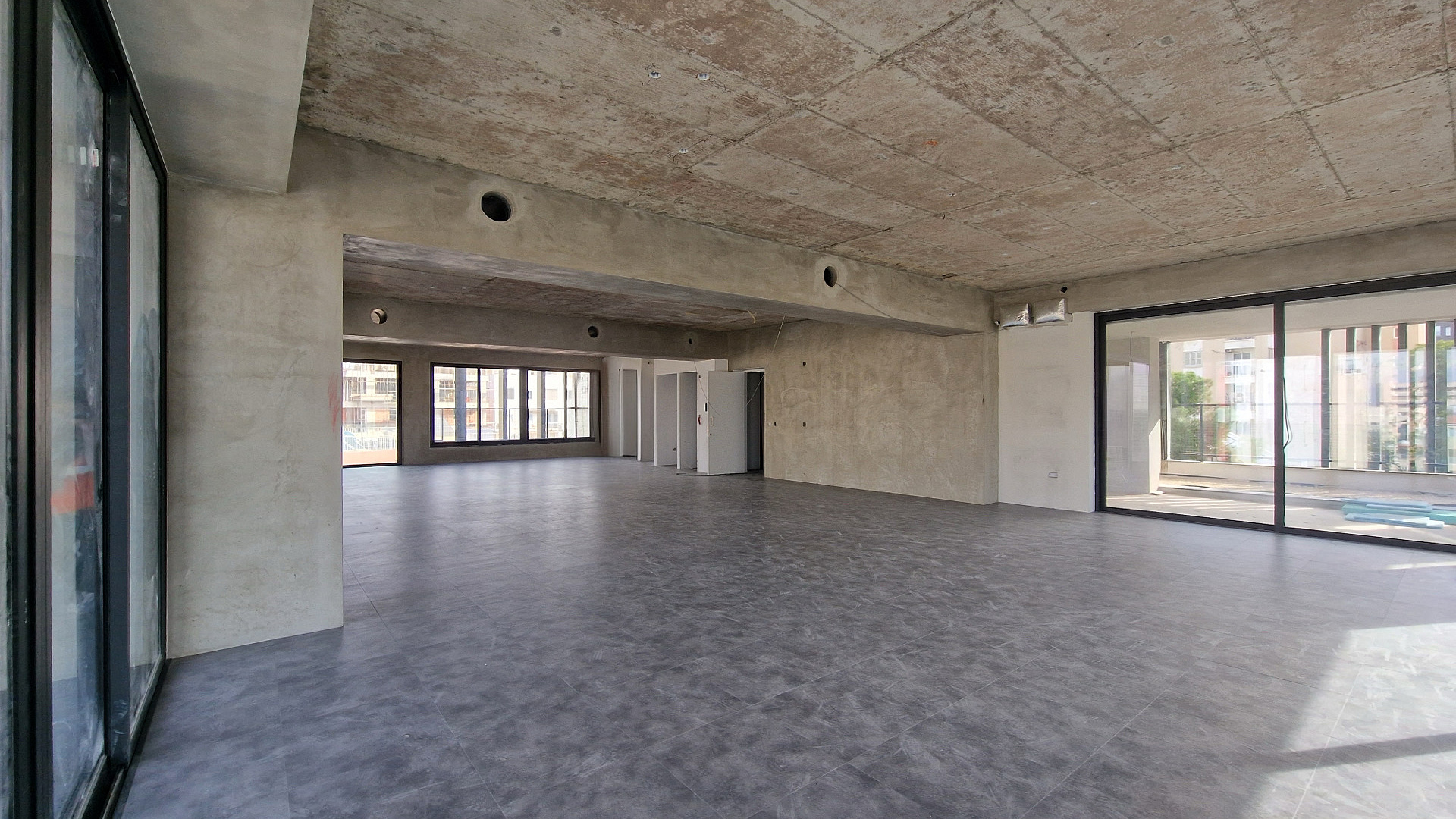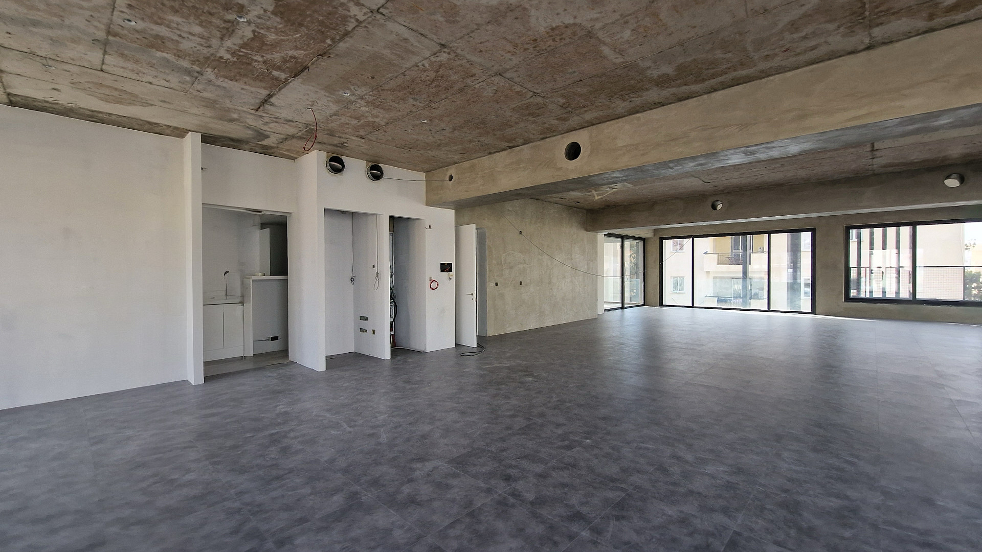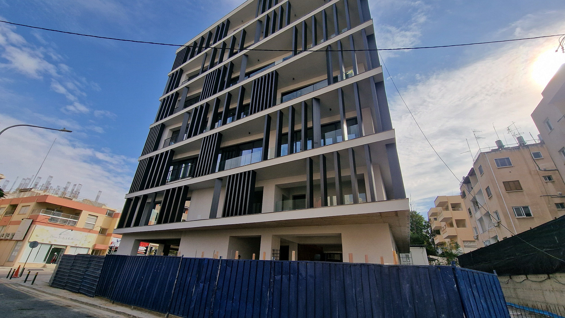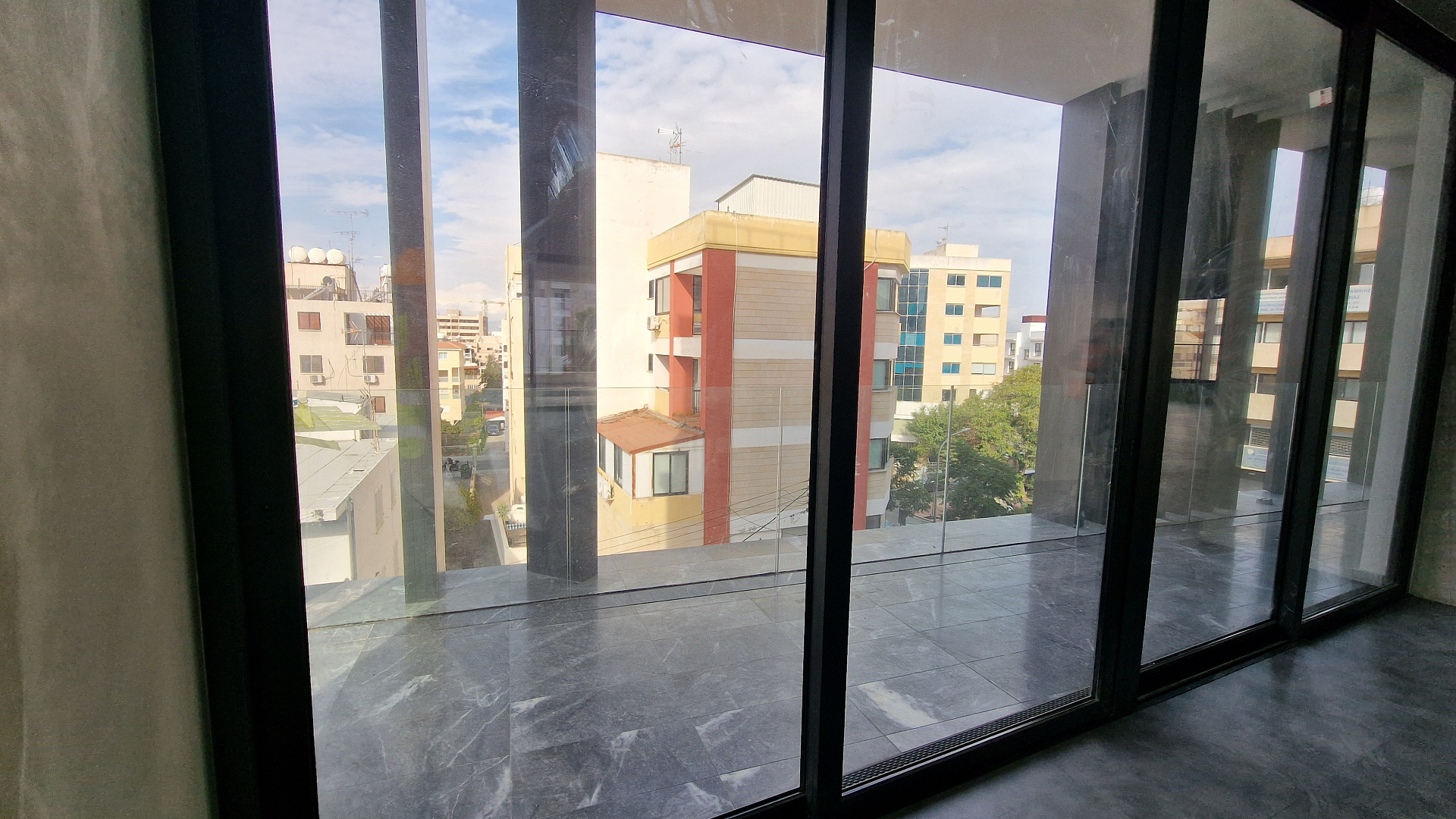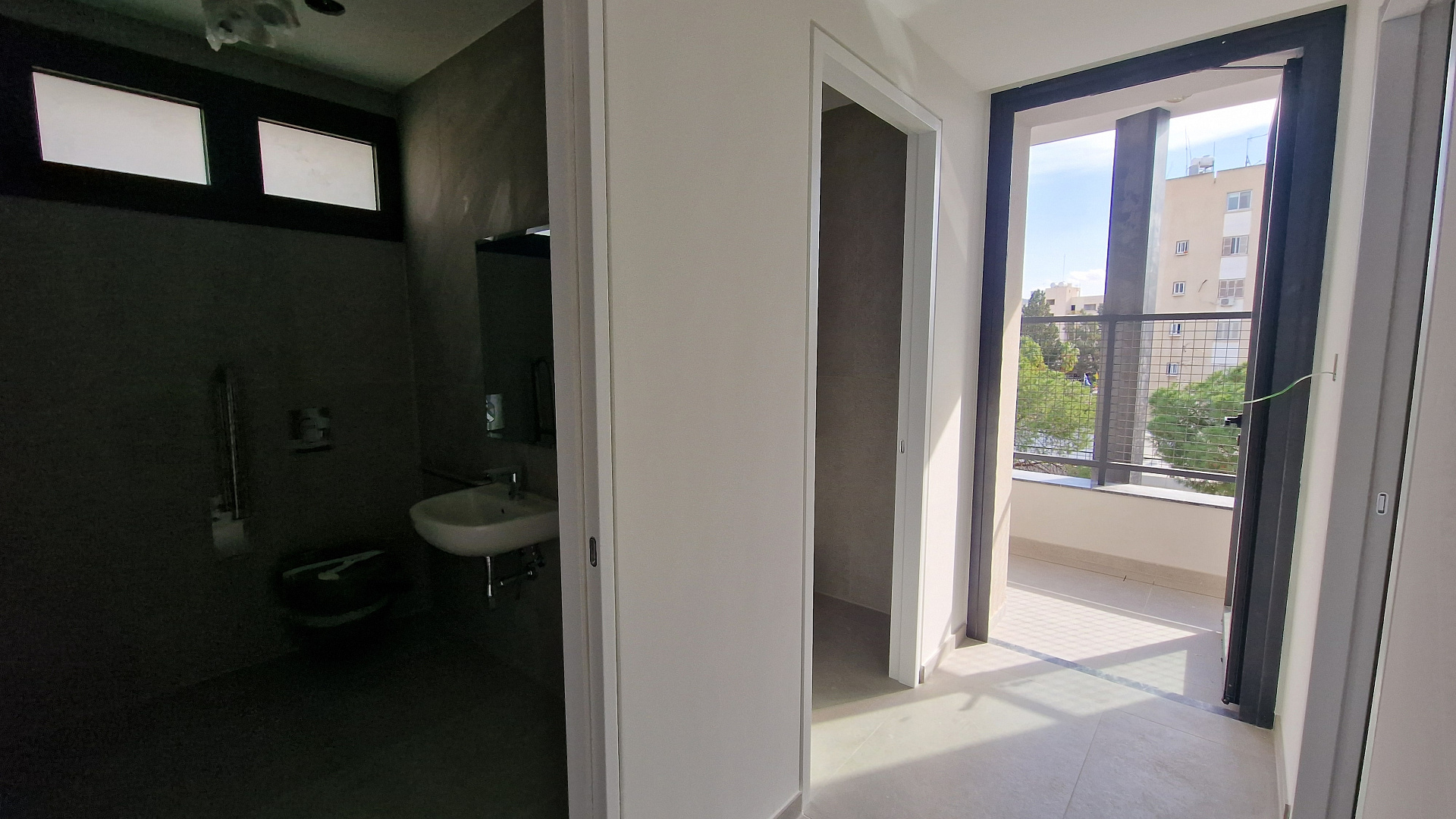 The second floor of a modern commercial building in Agios Antonios, Nicosia, is available for lease. The building consists of five office floors, a basement, and a ground-floor retail space with a mezzanine.