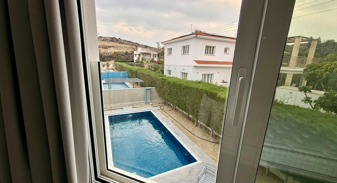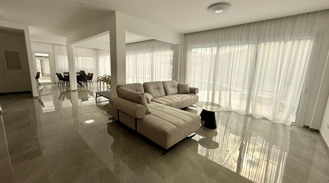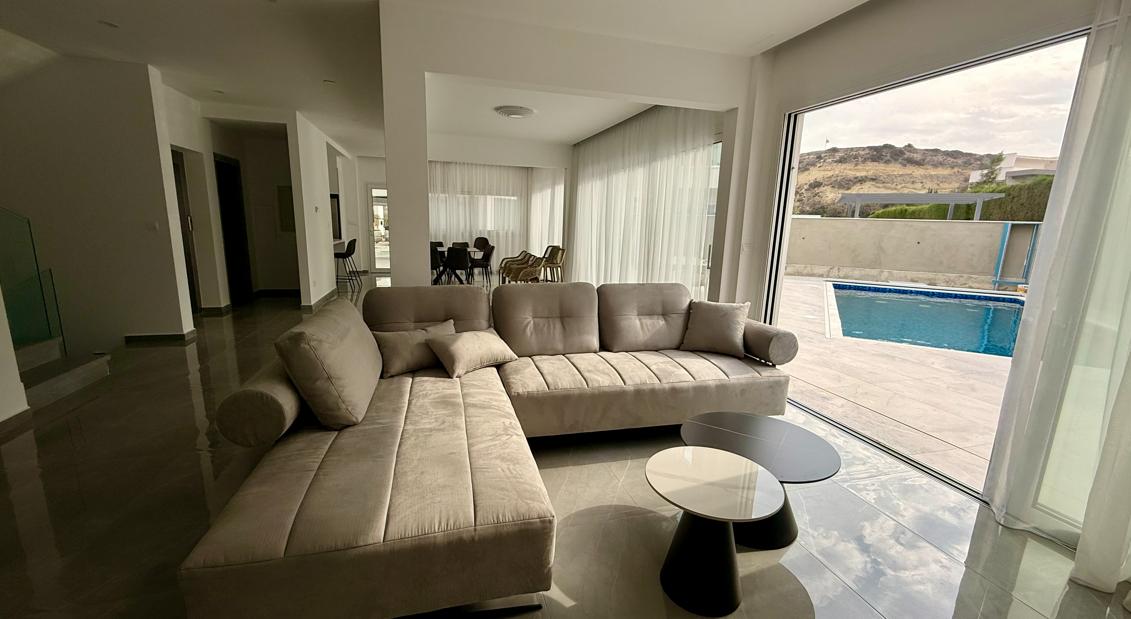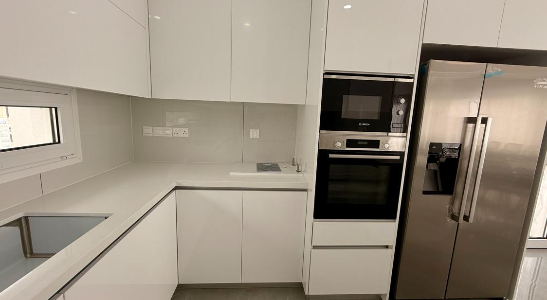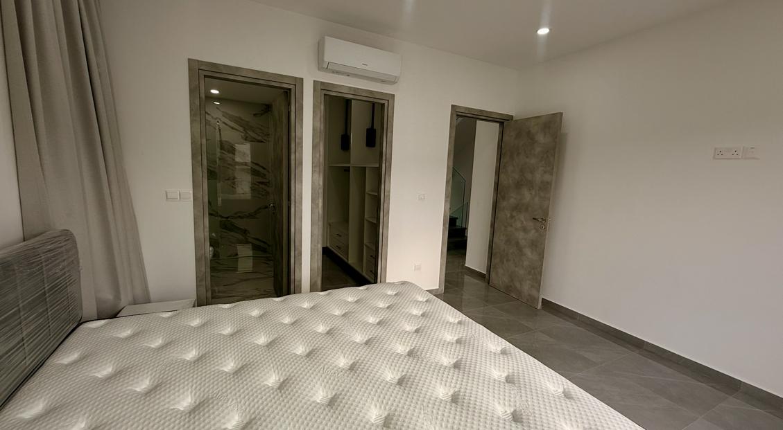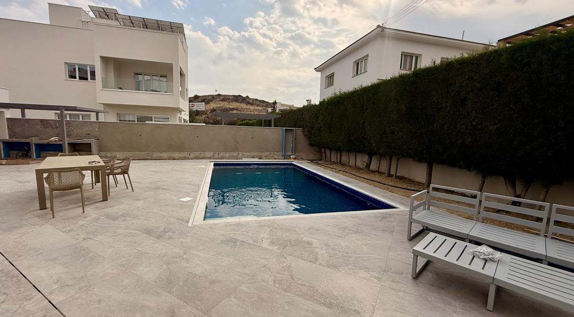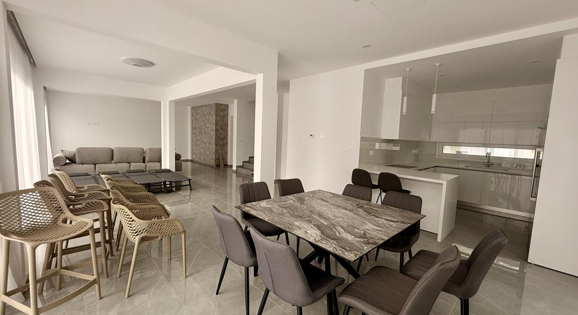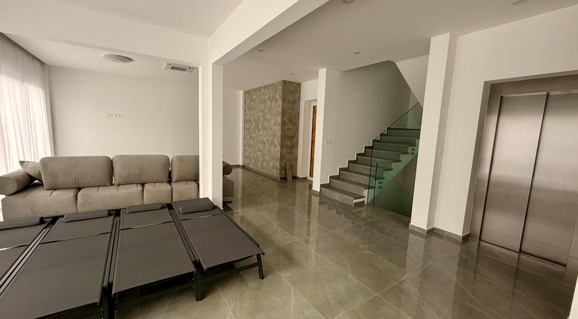 This 350 sq m, five-bedroom villa on a 550 sq m plot is for rent in Agios Tychonas, Limassol. The ground floor features a spacious living room, kitchen, and guest toilet. The approximately 100 sq m basement features a spacious living room with a separate entrance from the street, a laundry room, and a bathroom with a toilet, bathtub, and shower. The second floor features 34 bedrooms, 4 bathrooms (3 en-suite), and a balcony. The third floor features a fifth bedroom with an en-suite bathroom and a spacious terrace with the option of installing a jacuzzi. The property features an elevator, all necessary appliances, a 10 kW underfloor heating system, blackout blinds, and solar panels. The courtyard features a swimming pool with a wave system and a double side-by-side garage. The property is located in a private gated complex, offering a high level of privacy and easy access to the area's amenities.