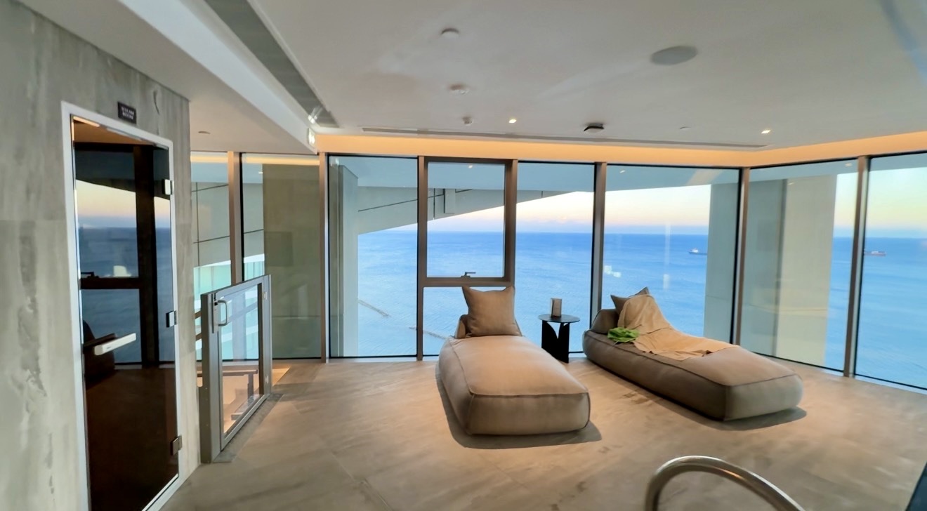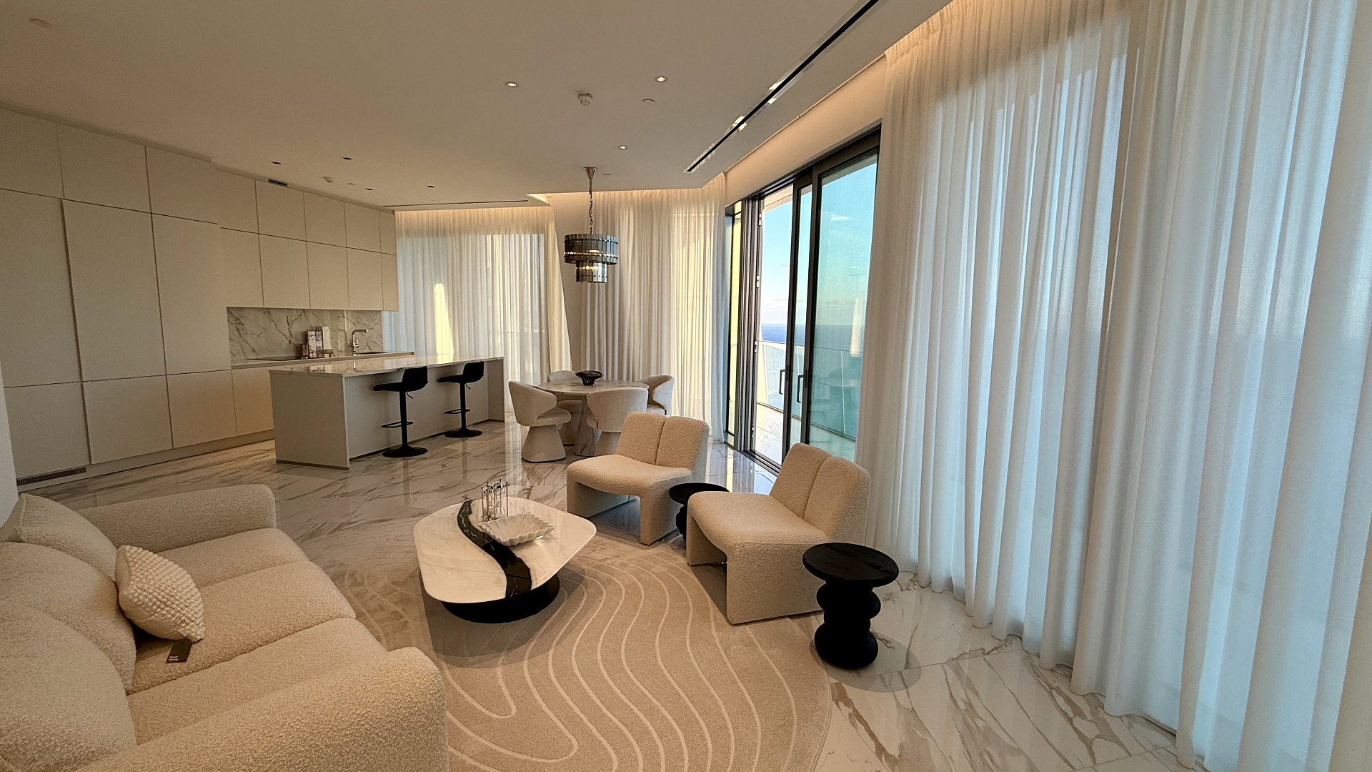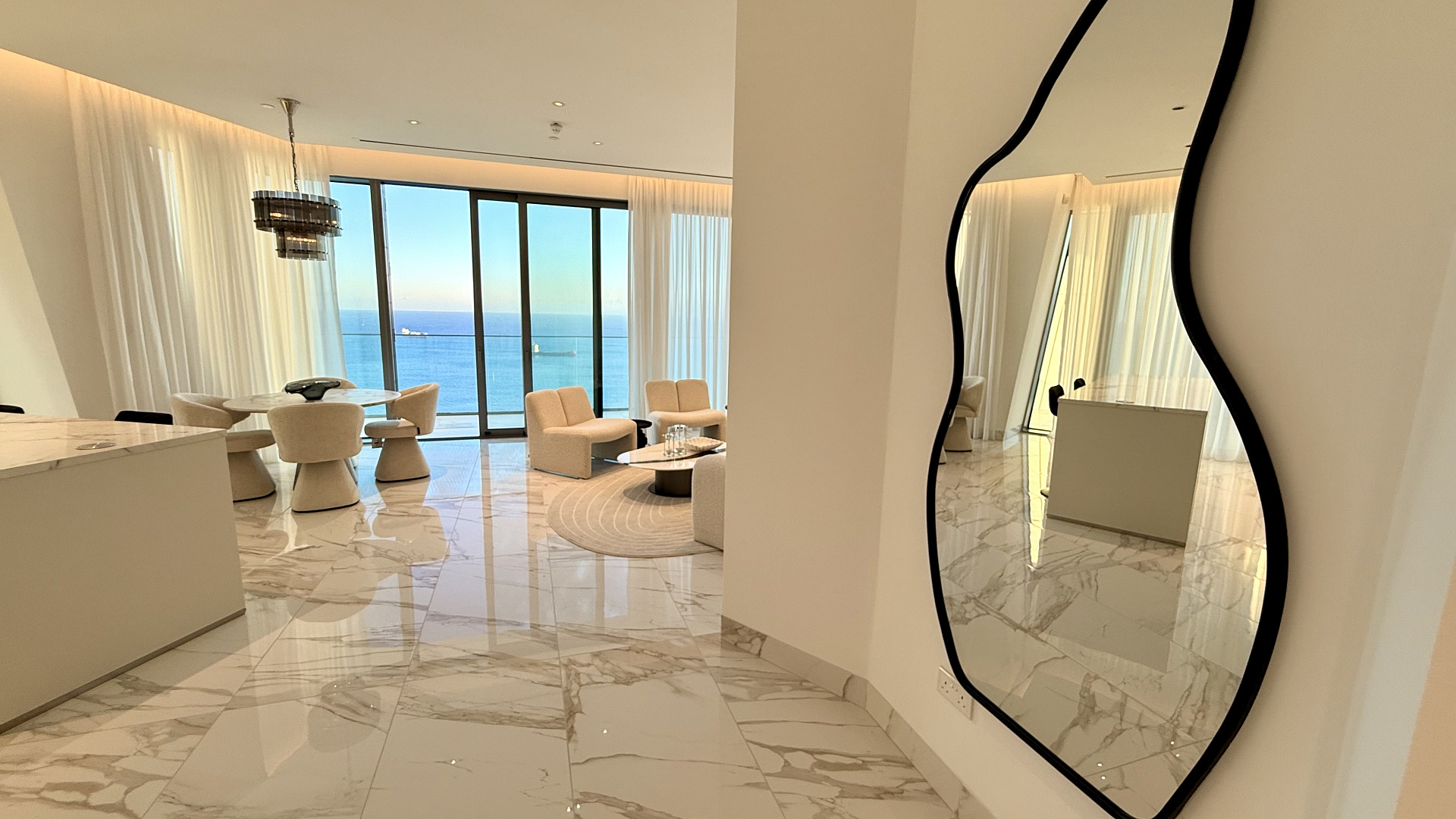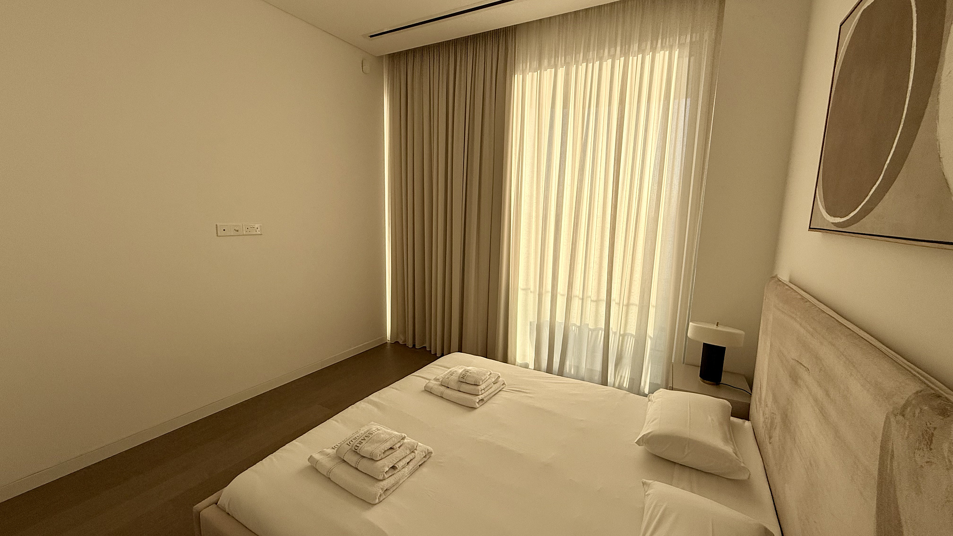 A two-bedroom residence is available for rent in a flagship high-rise project located on the seafront in Neapolis, Limassol. The complex consists of three towers and a 7,500 m² oasis, which includes a tennis court, swimming pools, a bar, and a children's playground. The complex also features a 6,500 m² Plaza, which includes world-class restaurants and spaces for work and leisure. The project has 24-hour security and underground parking.