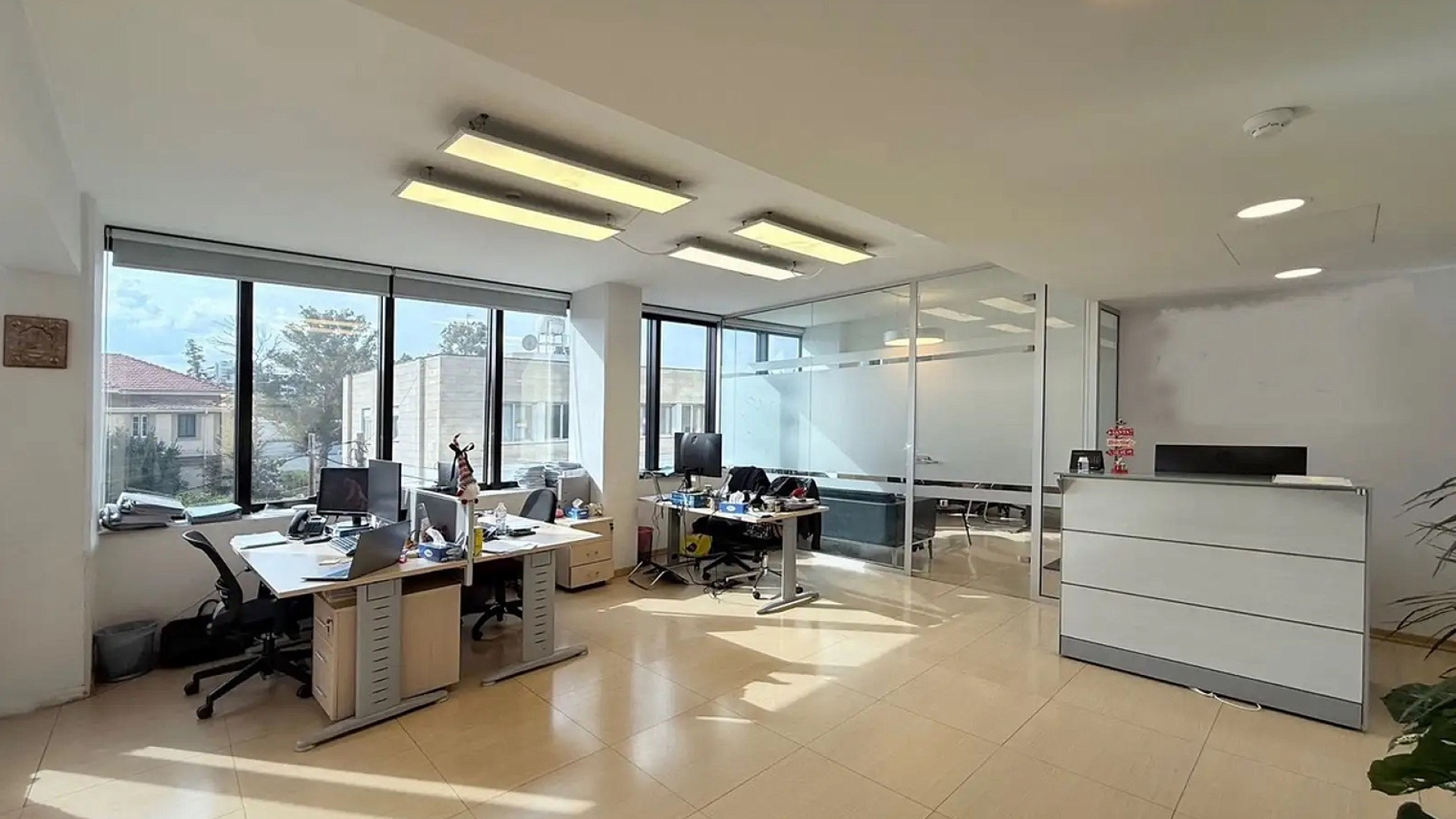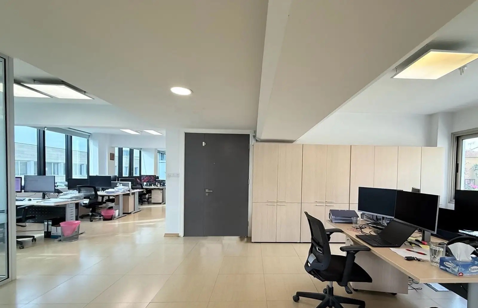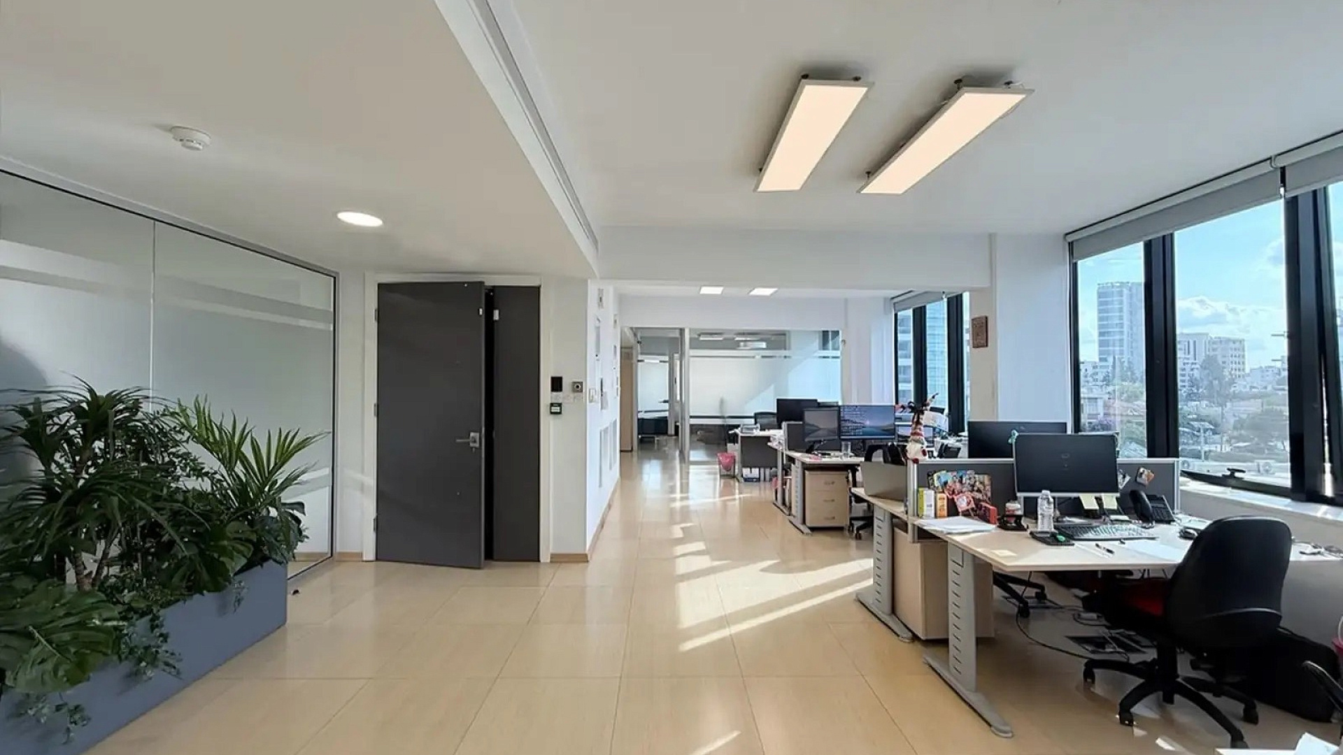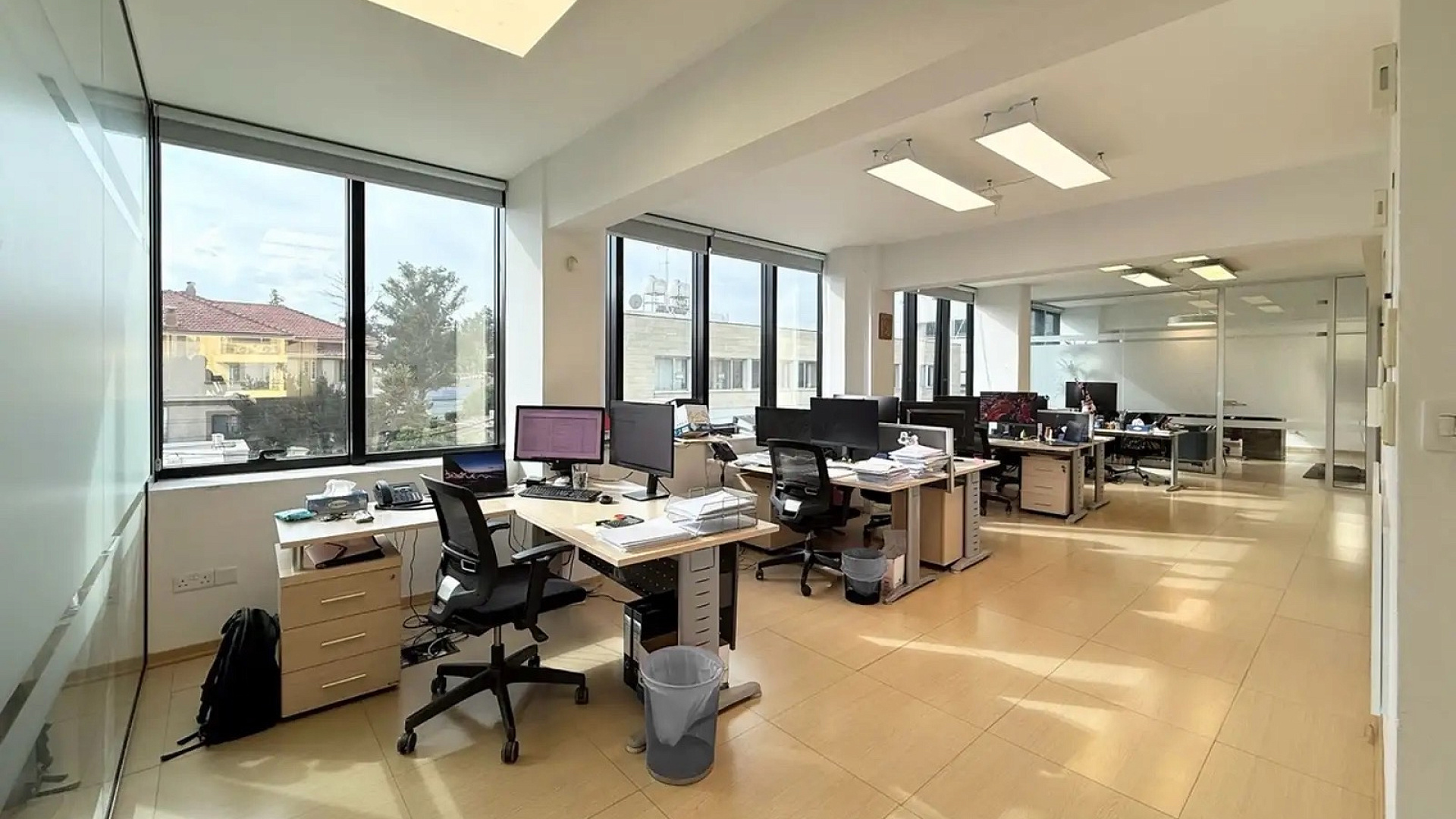 An office of 200 m2 for rent in the area of Agioi Omologites, Nicosia. The office space includes two spacious open work rooms, two separate offices, a dedicated conference area, a small kitchen for staff and two bathrooms. The office includes three parking spaces; an elevator and an alarm system are also provided. The premises are located just a few steps from Themistokli Dervi, in the center of the business district of the capital, which provides excellent visibility, convenient access and proximity to the entire urban infrastructure. The office is equipped with a VRV system and has a raised floor for flexible placement of cable networks. Additionally, the office has plenty of natural light and views of the city.