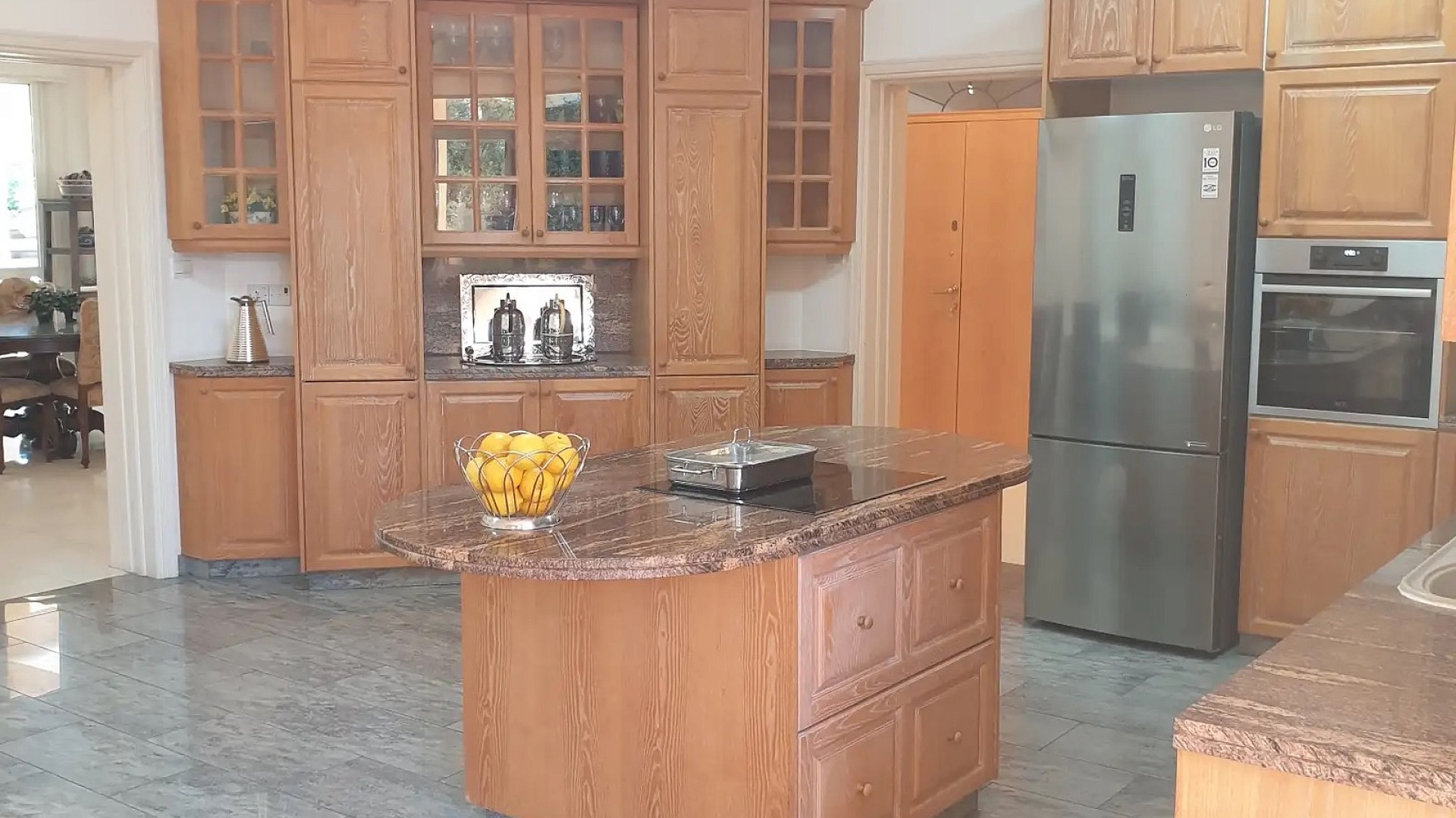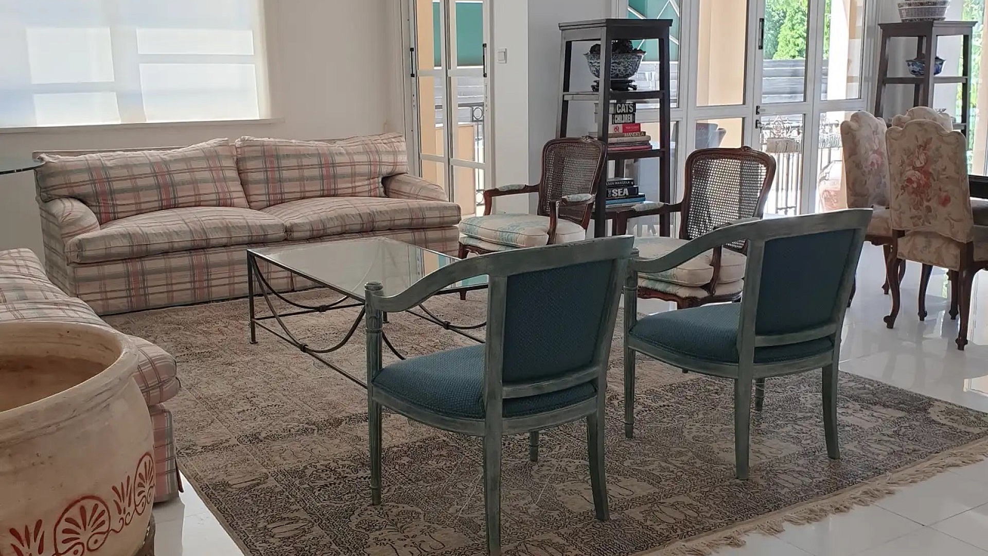 Four-bedroom apartment of 330 m2 for rent in Strovolos, Nicosia. The apartment is located on the ground floor. The apartment includes four bedrooms, an office, three bathrooms, a guest toilet, a kitchen with an island, an open living and dining area with a fireplace, a family room, a laundry room, balconies, a garden, and storage rooms.