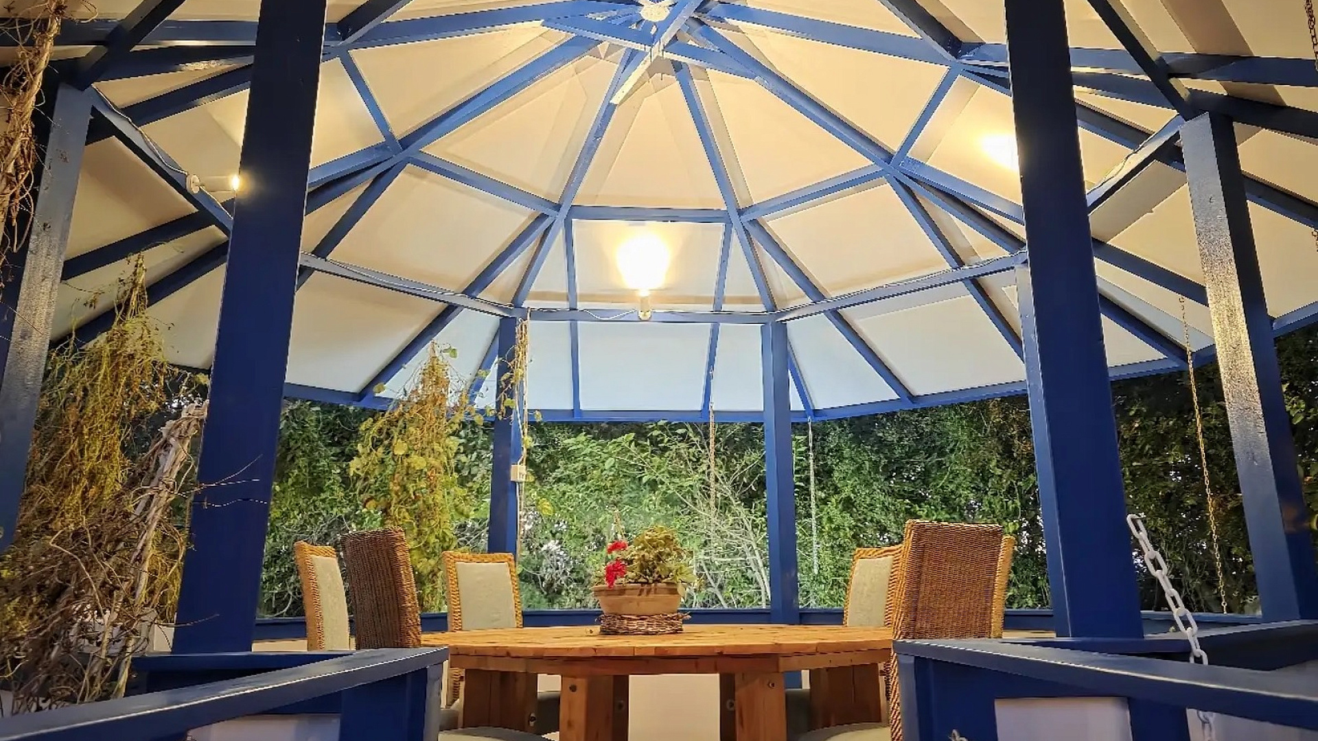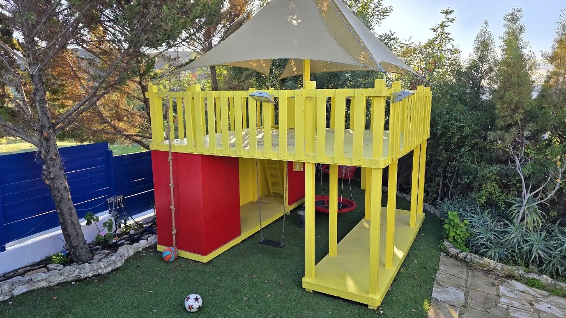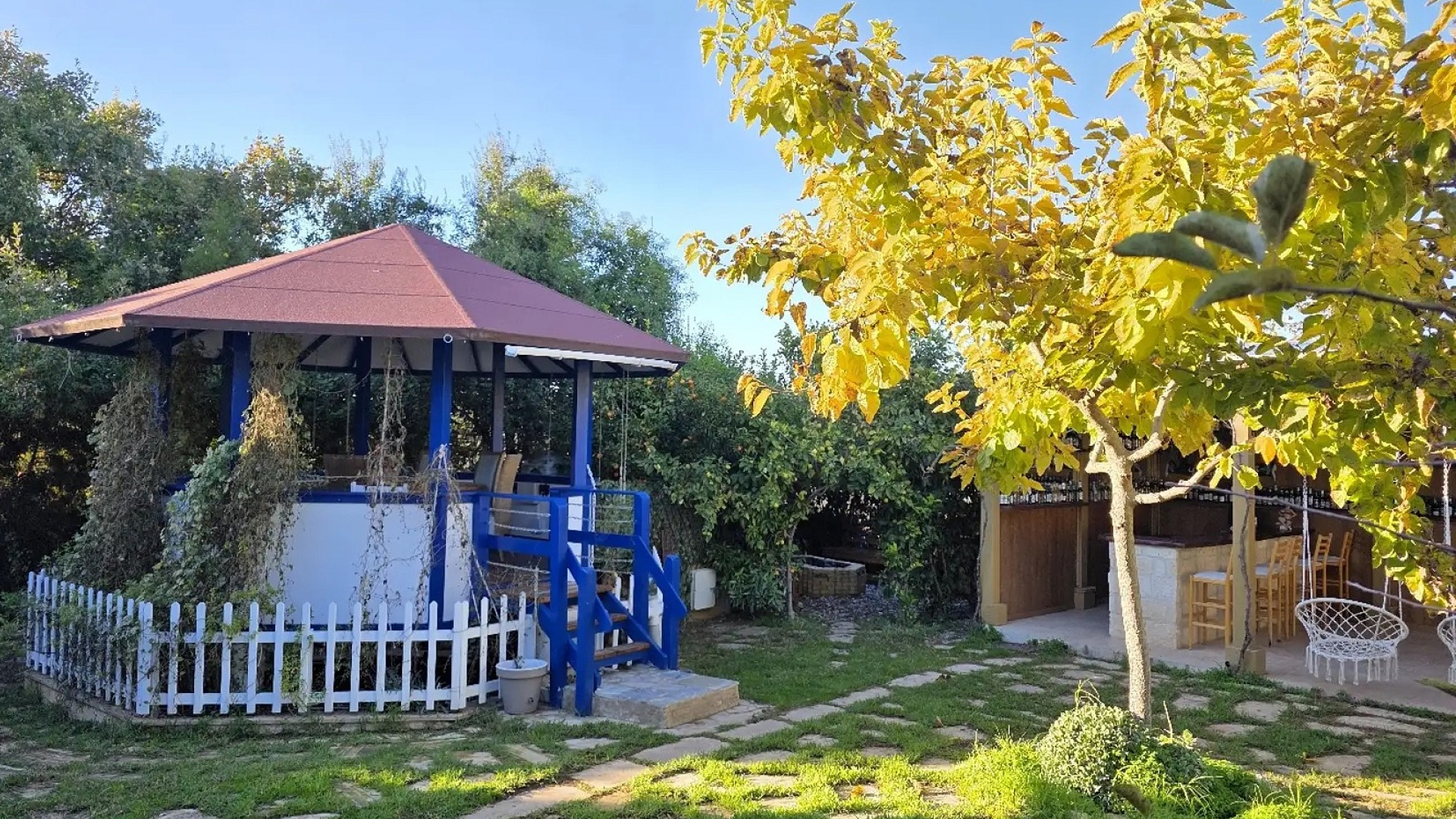 There is an 8x4 m overflow pool with an outdoor shower, a decorative pond with a tea house, a barbecue area and an indoor bar with a projector, screen and wine cooler, several recreation areas, a playground with swings and a large playhouse, a mature garden with fruit trees.