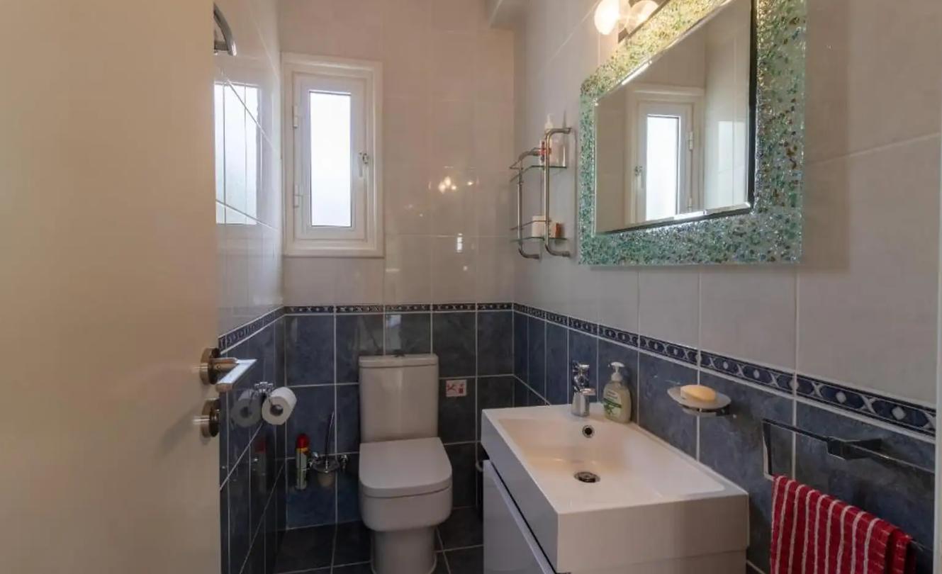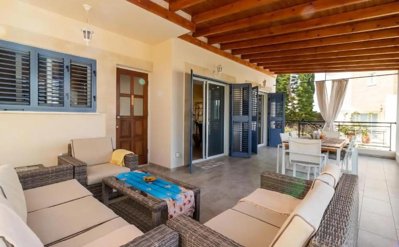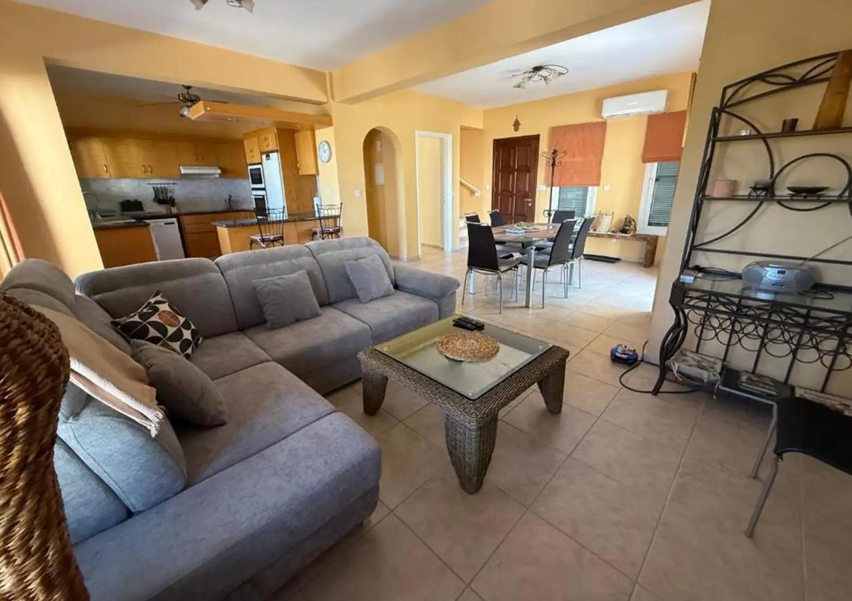 Four-bedroom villa for rent in Neo Chorio Pafou, Paphos with a total area of 240 m2, located on a plot of 800 m2 and just 150 meters on foot from the sea, the villa consists of three floors and offers four bedrooms, three bathrooms and a guest toilet, two living areas and a fully equipped kitchen with appliances and a coffee machine, the villa is fully furnished It is equipped with air conditioning in all rooms, there is Wi-Fi, two TVs, a private swimming pool, a well-kept garden, balconies, a game room, a BBQ area, a tennis table and a covered parking lot, built in 2006.