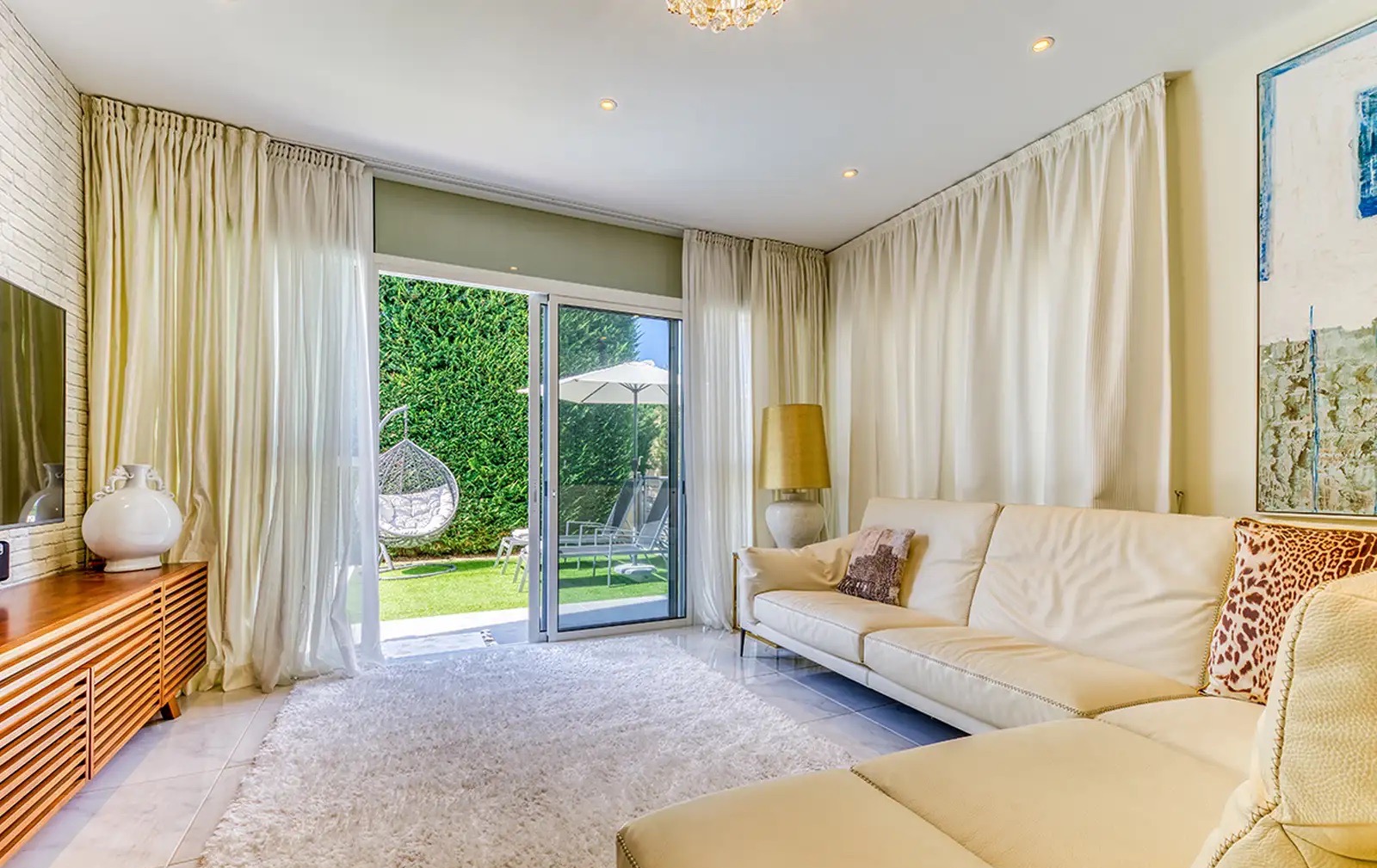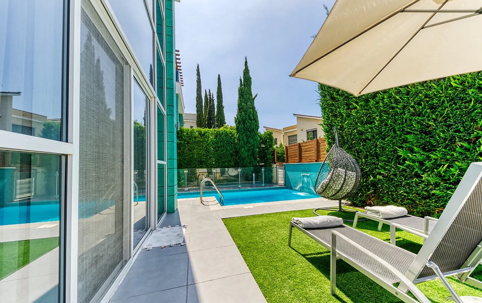 For rent a four-bedroom house with a covered area of 220 m2 on a plot of 270 m2 in the area of Agios Tychonas, Limassol. The house includes four bedrooms, two bathrooms, a guest toilet, a main kitchen, an additional kitchen with a laundry area, a living room and a garden. The residence is fully furnished and equipped with household appliances, including a Scavolini kitchen, a full set of Miele appliances, expensive air conditioners in all rooms and electric heating. Additionally, the house has a private swimming pool, a well-maintained garden with fruit trees, an outdoor veranda of about 42.5 m2 and a roof garden of about 39 m2. The property is located in a secure gated complex by the sea, next to a sandy beach. The complex has a playground, a children's playroom, a communal swimming pool, a gym, a sauna and 24-hour security.