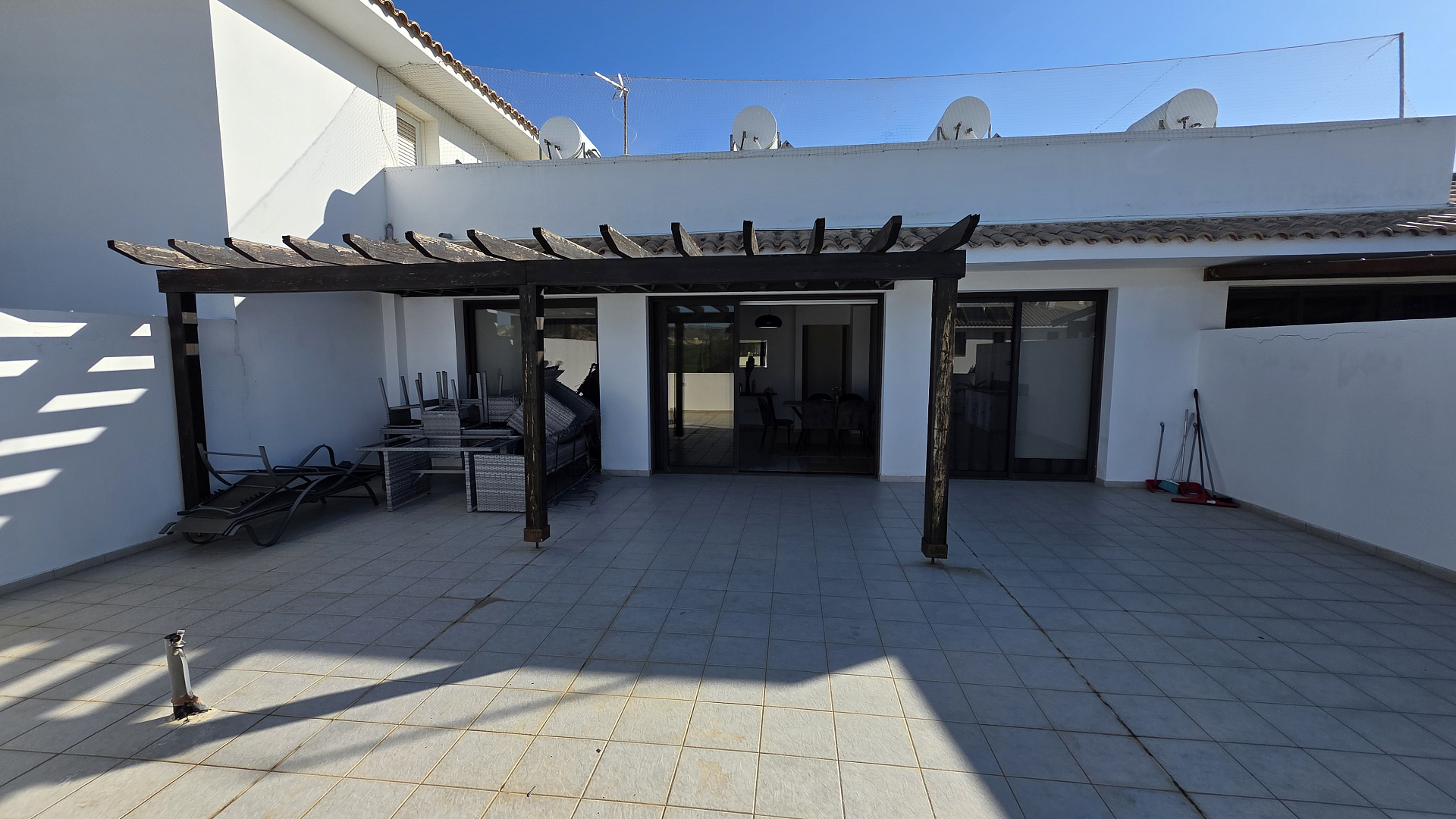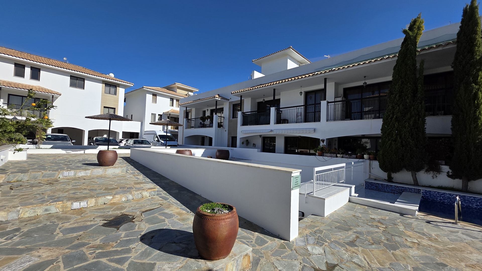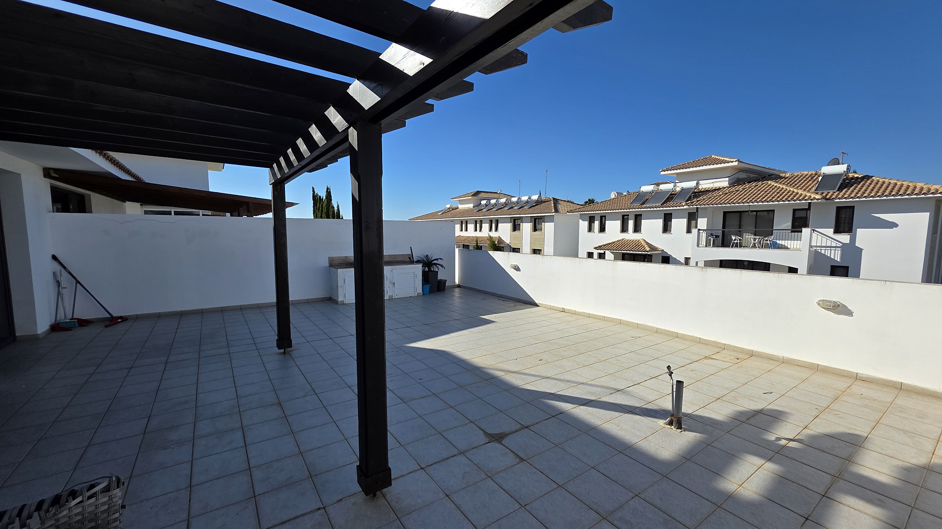 Spacious apartment for rent in a complex in Tersefanou, Larnaca. The apartment is fully furnished and equipped with household appliances. Two bedrooms, two bathrooms, large outdoor terrace with mountain views. The complex has a communal swimming pool and a gym. Covered parking space.