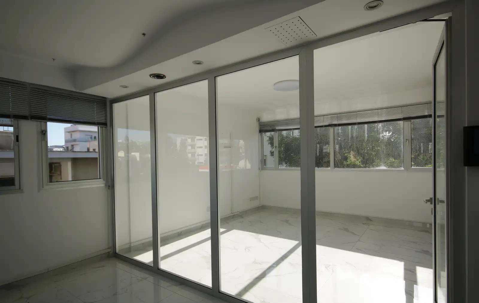 An office of 120 m2 for rent in Agia Zoni area, Limassol city. The office is located on the 1st floor of the building. The office includes 4 separate work areas with elegant glass partitions, 1 bathroom, 1 kitchen area and is designed to accommodate up to 12 workplaces. The commercial property has been completely renovated, decorated in a modern style and equipped with 4 air conditioners, a video intercom system, an elevator and 1 covered parking space in the underground parking.