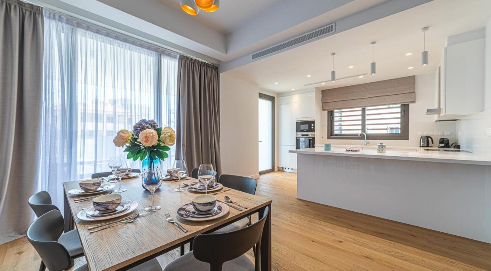 For rent a three-bedroom apartment with a covered area of 114 m2 with a veranda of 29 m2 in the area of Potamos Germasogeias, Limassol. The apartment includes three bedrooms, a bathroom, one en-suite shower room, an open kitchen combined with a living area, as well as a spacious veranda. The apartment is located on the 1st floor. The apartments are fully furnished and fully equipped with high-quality household appliances, kitchen utensils, bed linen, towels and other items, making the property fully ready for immediate occupancy; underfloor heating and VRV air conditioning system are installed in all rooms. The residential complex offers a communal swimming pool for residents.