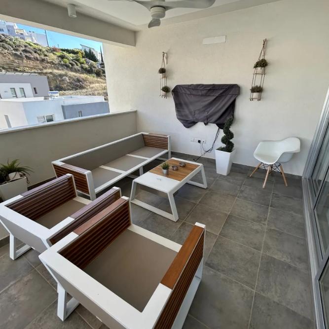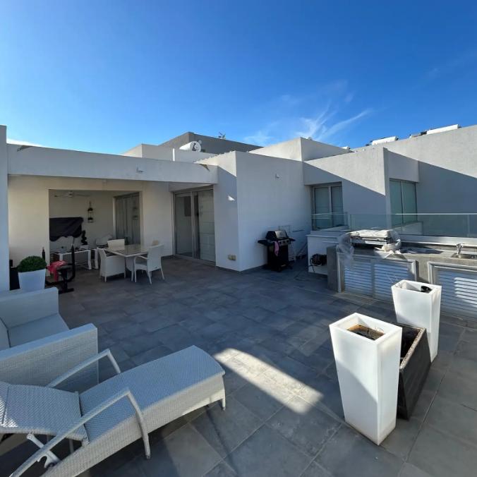 Three-bedroom penthouse for rent in Panthea, Limassol, located on the 3rd floor of a modern house, with a total area of 198 m2, of which a covered area of 120 m2 and a spacious semi-covered balcony of 78 m2, the penthouse is fully furnished, including outdoor furniture, and ready for comfortable living, the layout includes three bright bedrooms and two bathrooms, a spacious and a cozy living area, air conditioners are installed in all rooms, covered parking, an elevator and a storage room are provided.