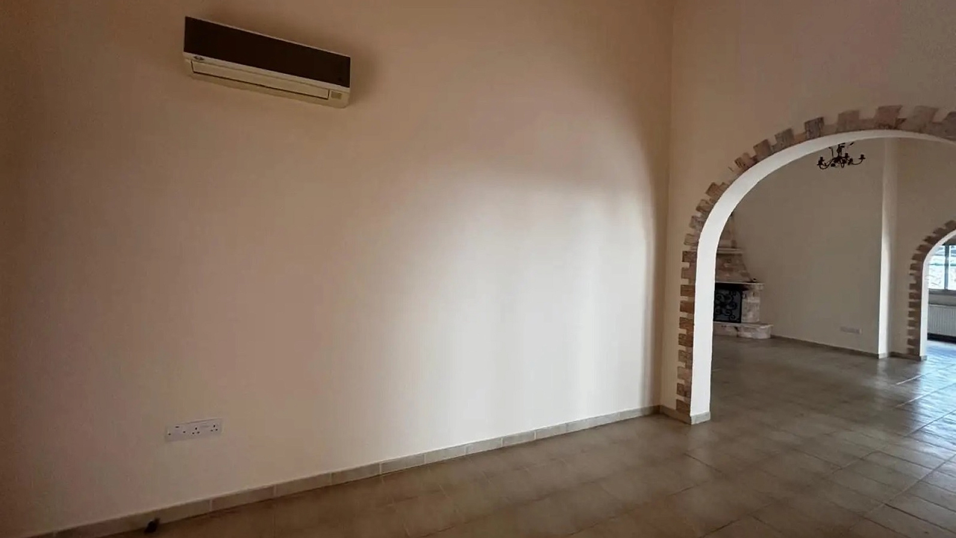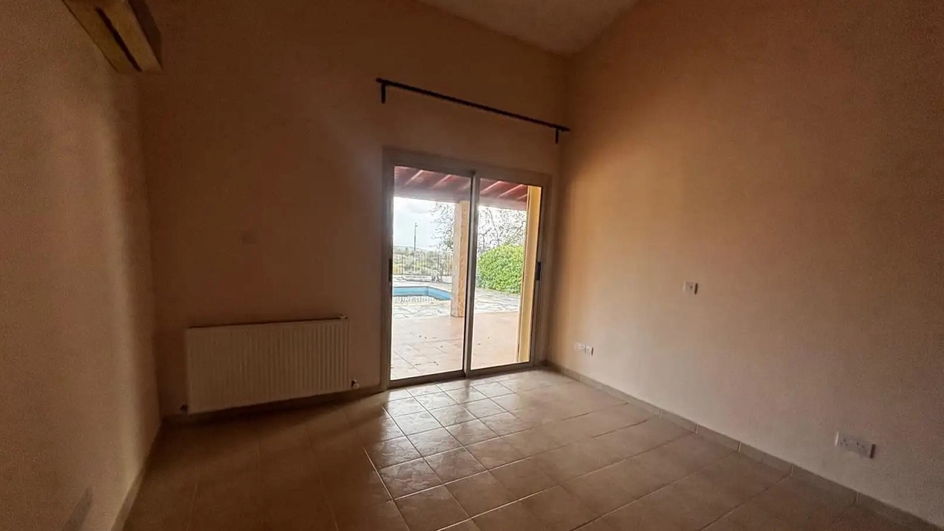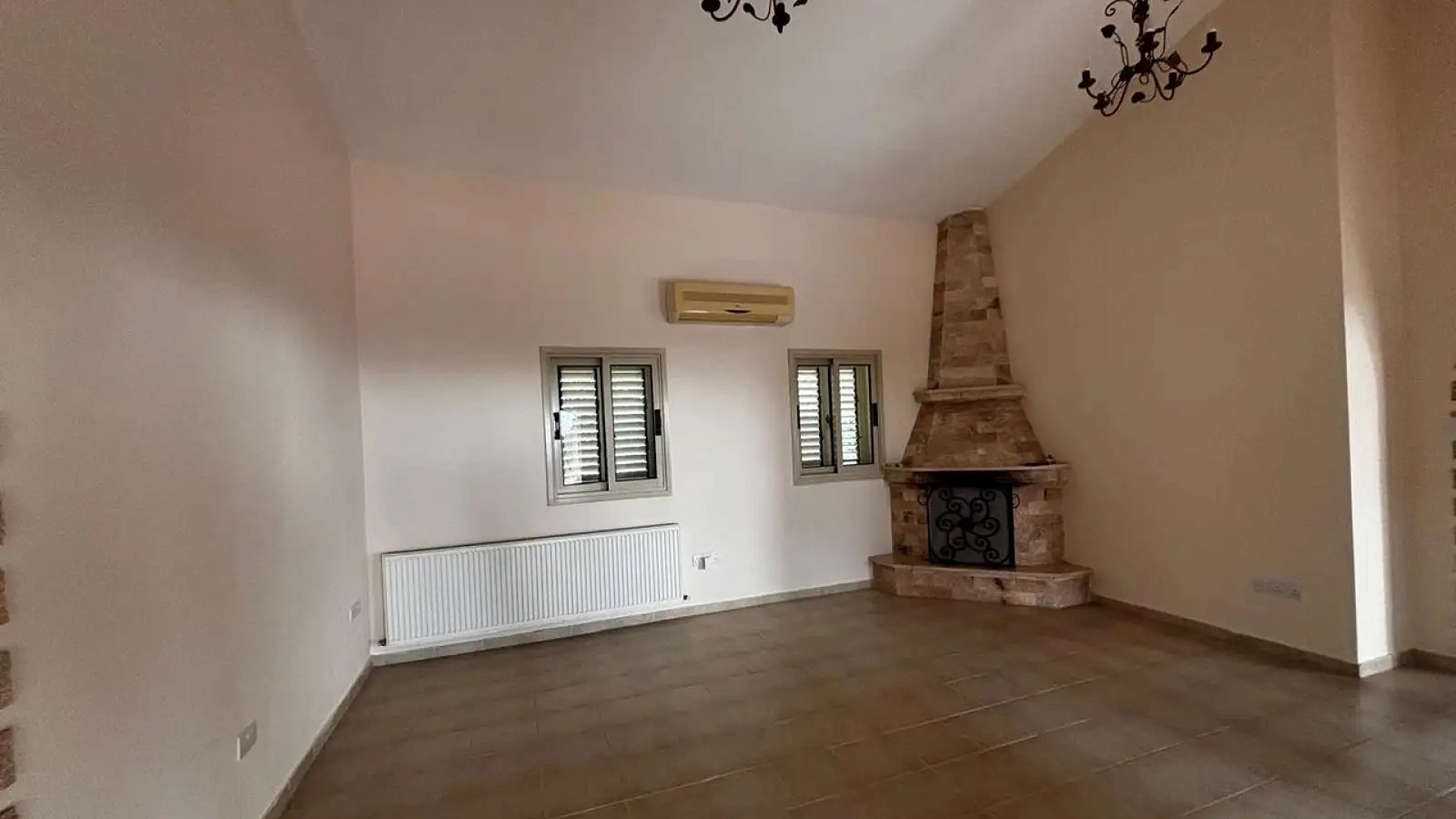 For rent a four-bedroom house with an area of 170 m2 on a plot of 1000 m2 in the area of Mesogi, Paphos. The house includes four bedrooms, two bathrooms, a kitchen, a living room, a fireplace, a covered parking, a swimming pool and a well-maintained garden. The residence is unfurnished, equipped with central heating, air conditioning in all rooms, alarm system, fireplace, automatic gates with remote control, doorbell and electric shutters of the garage doors. The house is a traditional bungalow surrounded by a mature, green garden, creating a feeling of complete privacy and harmony with nature. The site is fenced, the entrance is through a guarded gate, which ensures a high level of security and privacy. A spacious double garage with electric gates provides convenient and secure parking. The house was built in 2006, has energy efficiency class B, pets are allowed. The property is ideal for families who appreciate silence, spaciousness, natural views and the authentic atmosphere of a traditional Cypriot house. The property is located in one of the quietest and most secluded areas of Mesogi, close to the village and infrastructure, with convenient access to ISOP Private School and other amenities, while offering panoramic views of the valley facing the sea and a view of the village church in front.