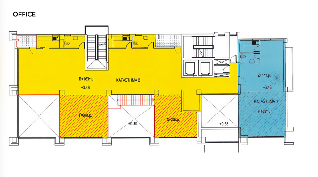 Commercial building for rent with a total area of 649 m2 in Neapolis, Limassol. The building includes a spacious showroom on the ground floor with an area of 272 m2 and a mezzanine of 223 m2, as well as a separate office block: 77 m2 on the ground floor and 77 m2 on the mezzanine, with a convenient layout and separate entrances.