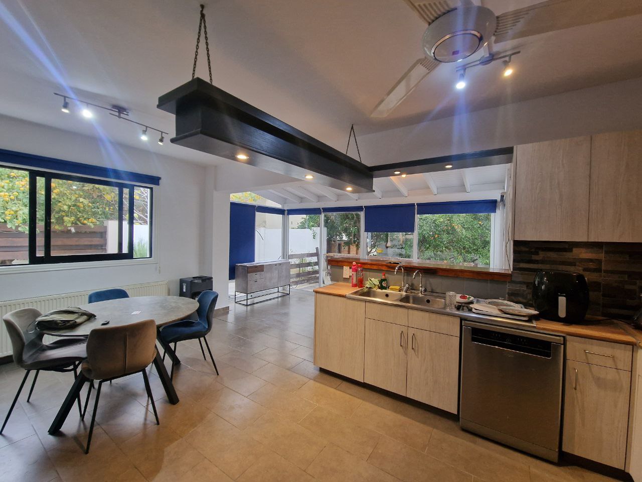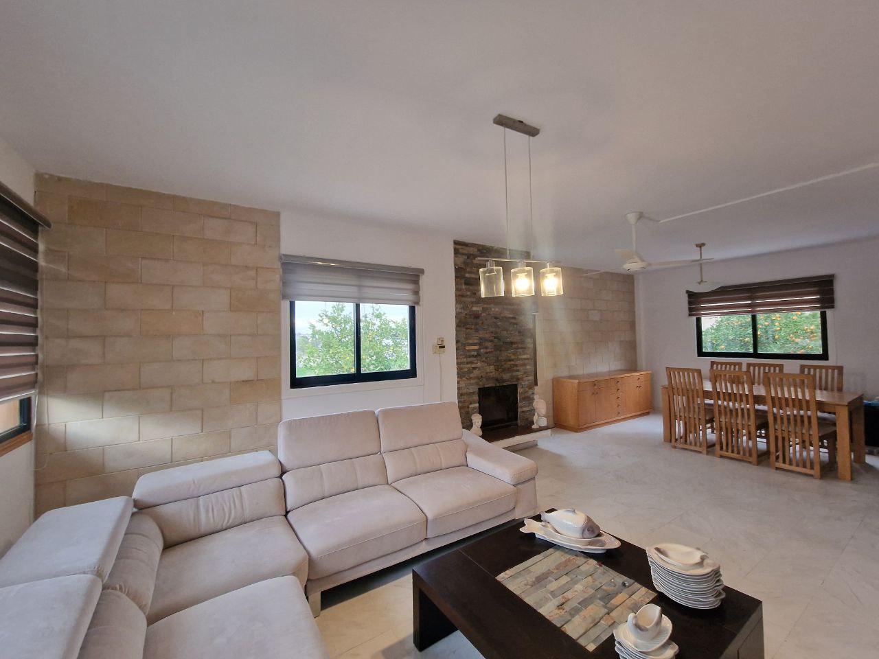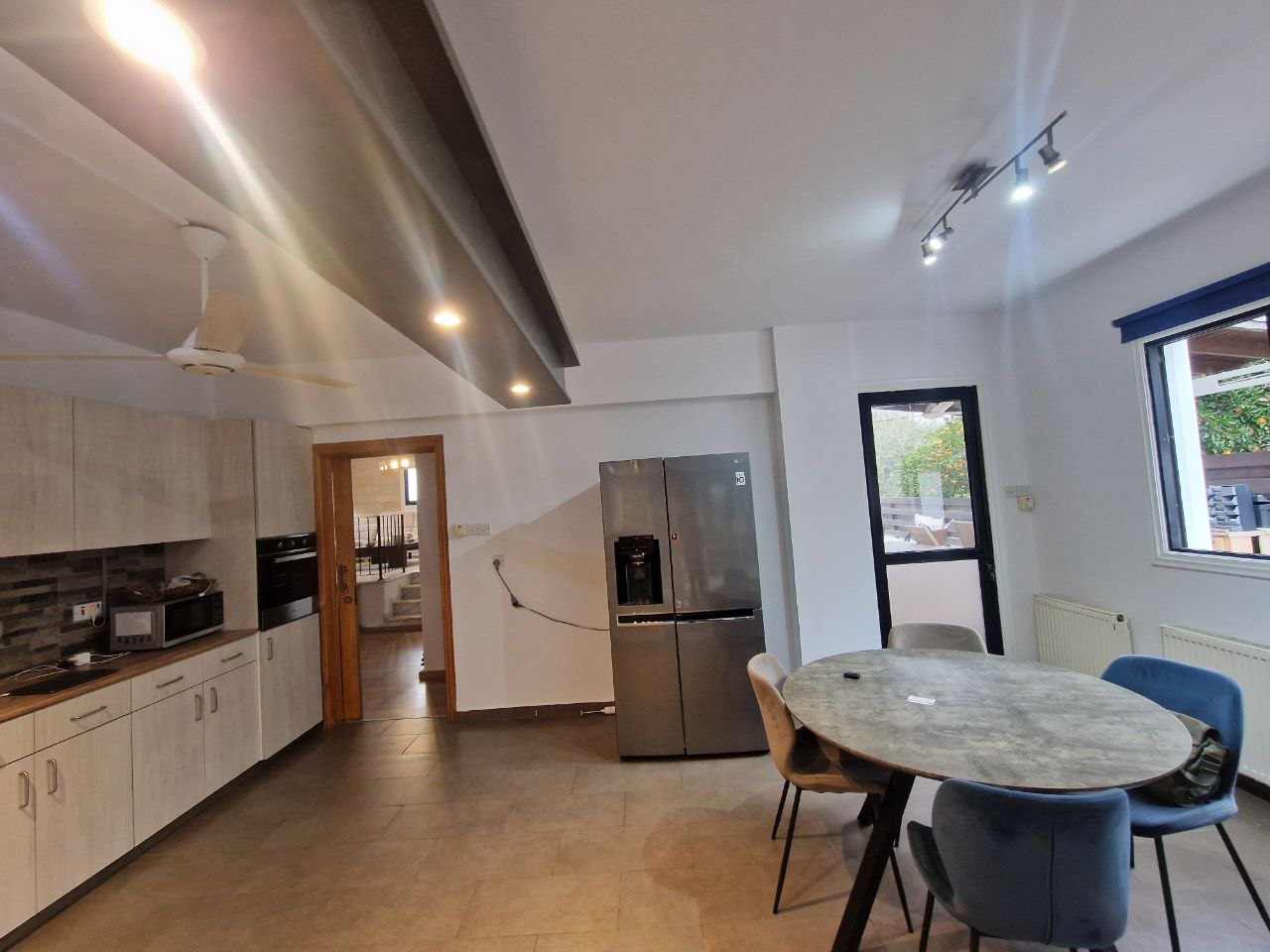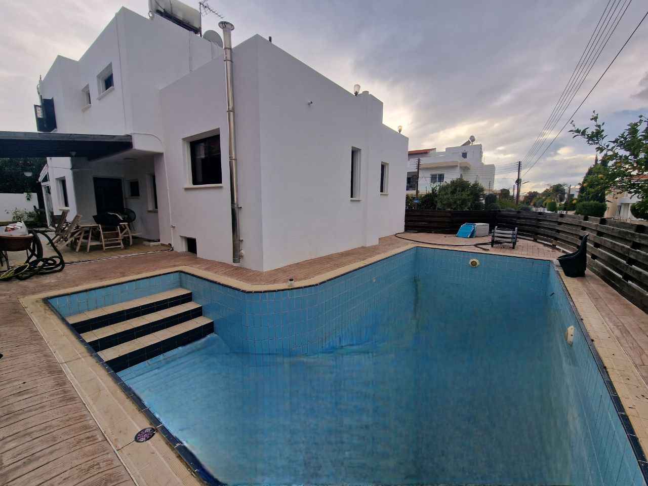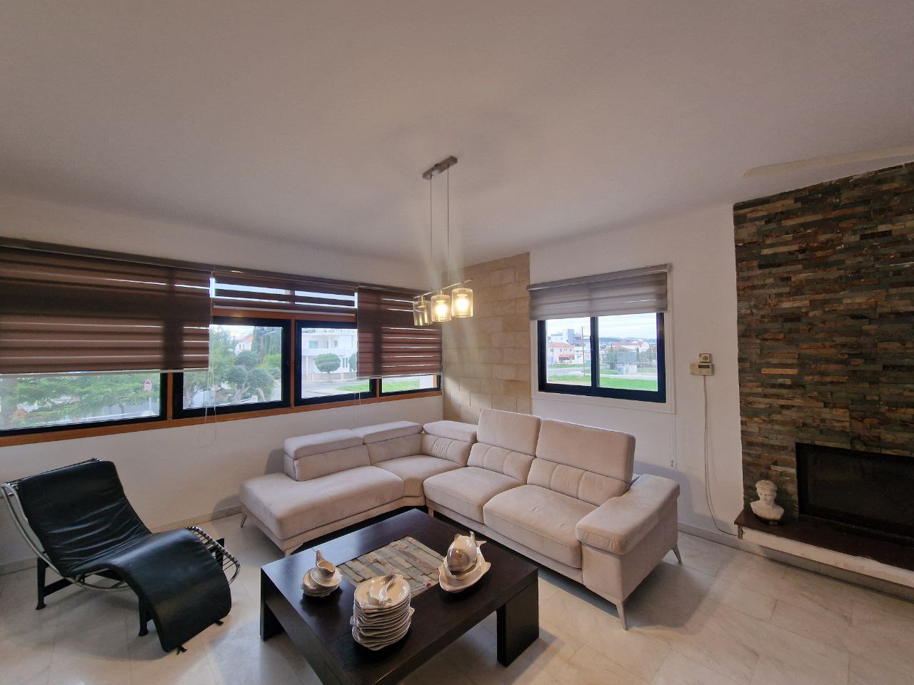 A house for rent in the area of Aradippou, Larnaca. On the ground floor there are two living rooms, a dining area, a kitchen, a covered veranda of 50 m2, a storage room, an office and a guest bathroom. On the second floor there are 3 bedrooms, a large bathroom and showers, a wardrobe. The house is furnished and equipped with household appliances, air conditioning, central heating and a fireplace in the living room. The property also has a swimming pool and a relaxation area. There is an underground garage of 45 m2 for the car. The house is located in a quiet residential area on the border of Kamares and Aradippou districts, close to all necessary infrastructure.