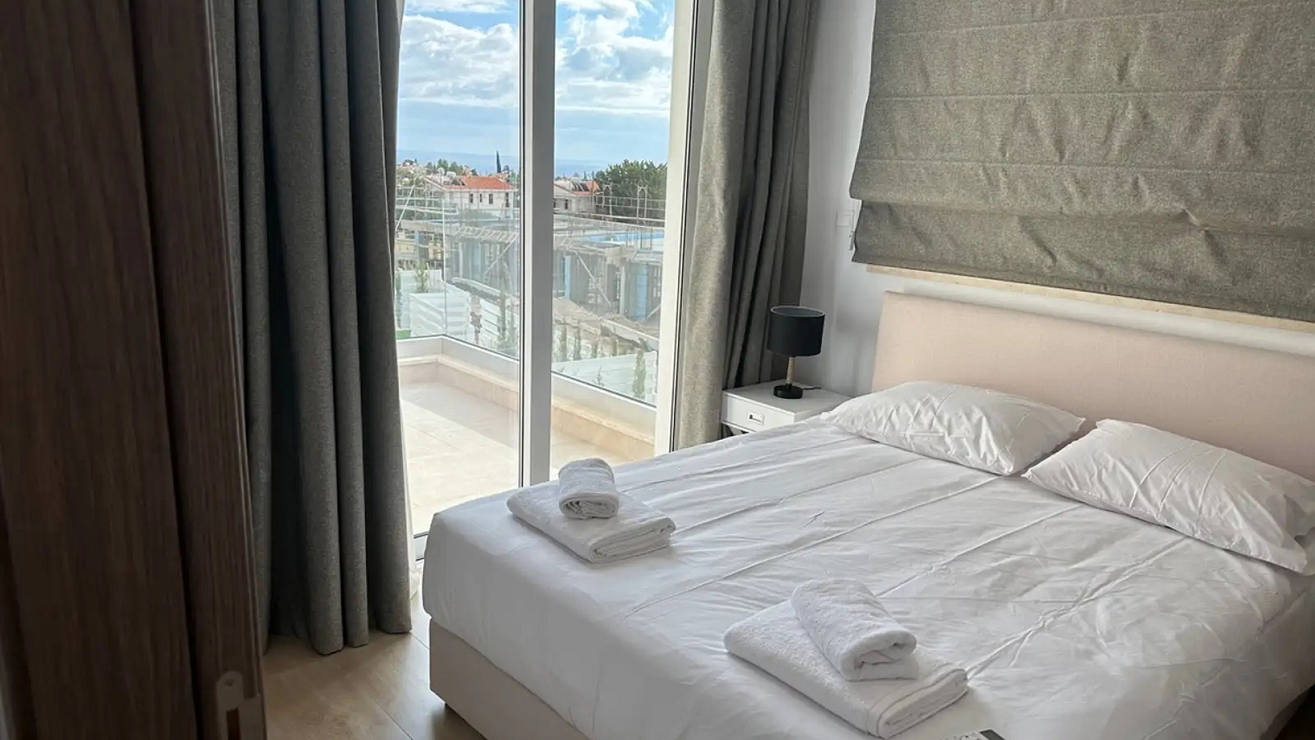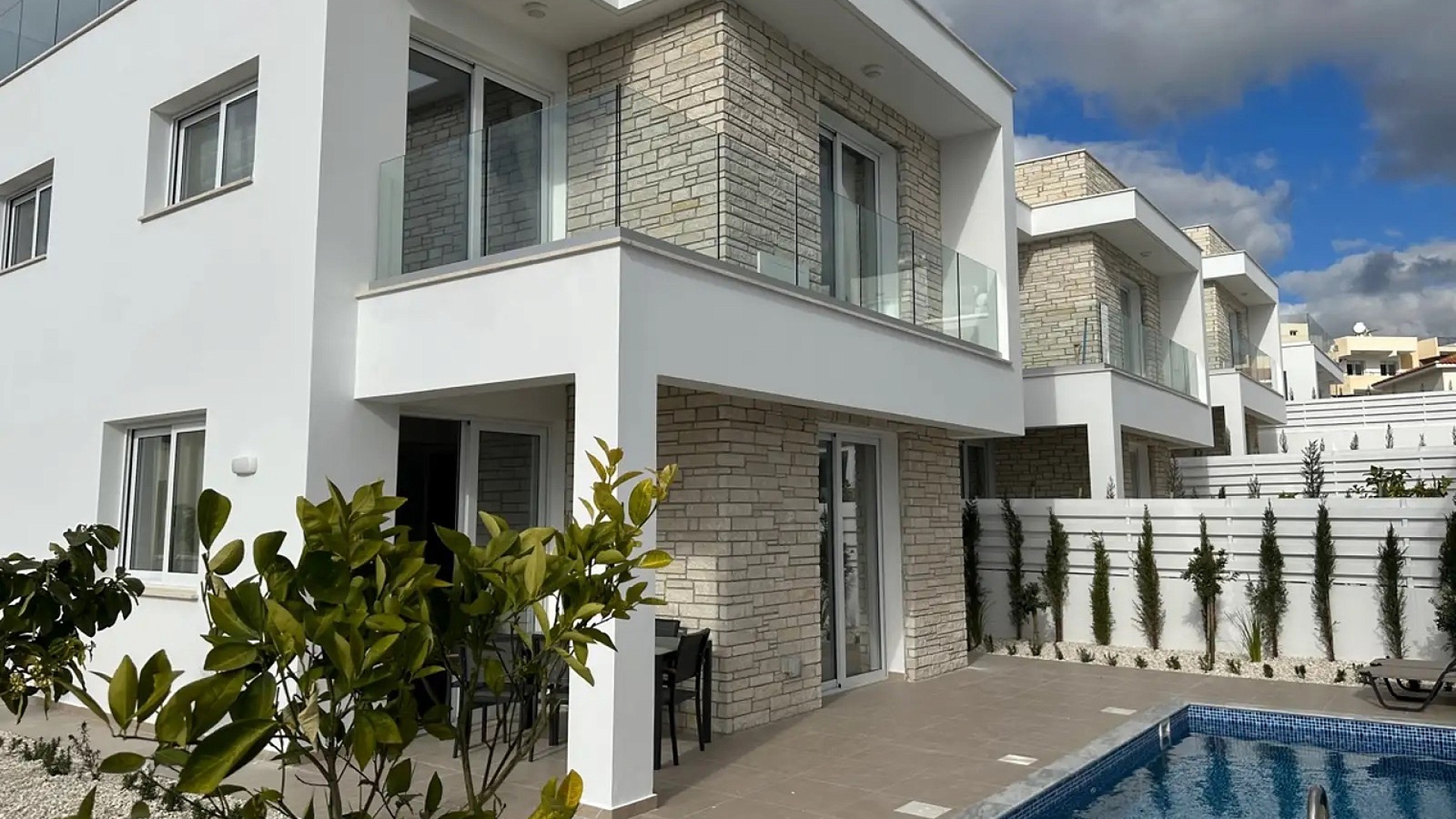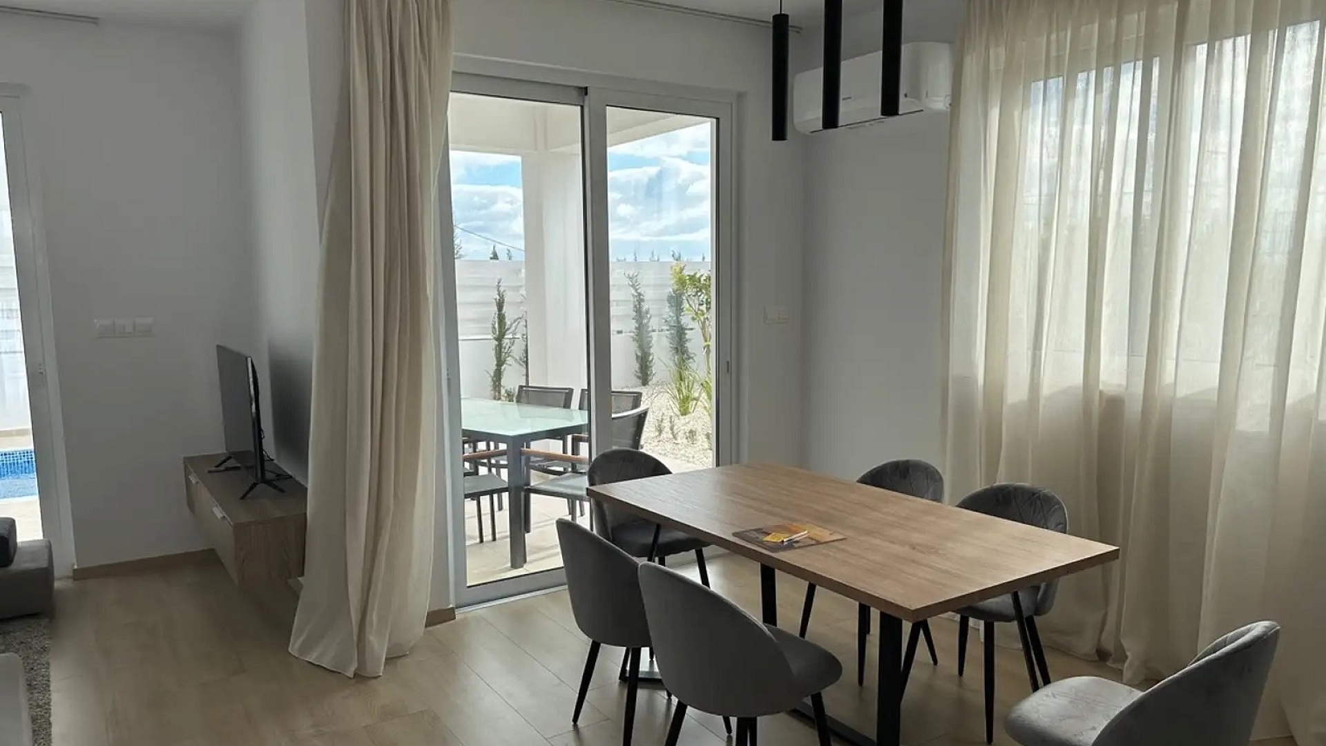 Villa for rent in the area of Pegeia, Paphos. The villa is furnished and equipped with all necessary household appliances, including a washing machine, a TV. Air conditioning is installed, Wi-Fi is provided, underfloor heating. There is a swimming pool and car parking on site. Pets are allowed.