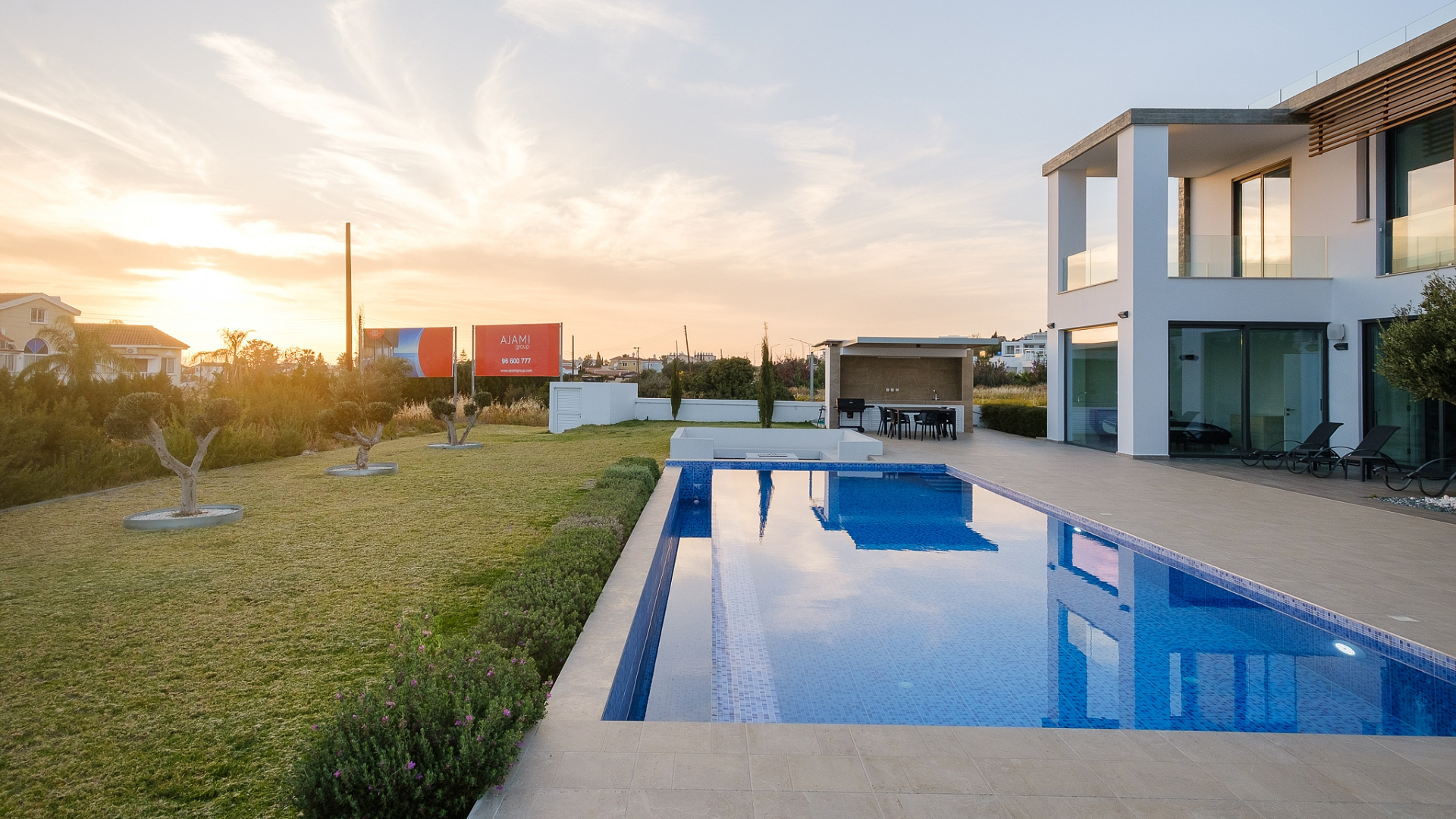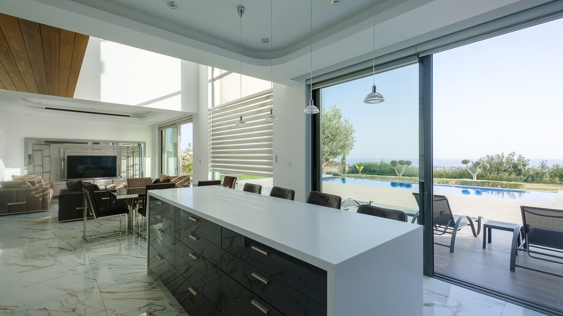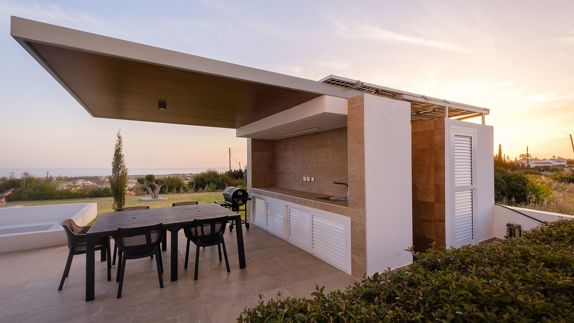 Four-bedroom villa for rent in Pegeia, Paphos, a modern residence built in 2022 with a living area of 220 m2 on a plot of 900 m2, fully furnished and ready to move in from mid-April, with a private overflow pool with built-in steps, a well-maintained landscaped garden, spacious covered verandas and a roof with garden, panoramic views of the the sea, covered Parking, high ceilings, Underfloor heating, modern kitchen with island and corian countertops, separate laundry and storage areas, the house has a modern design and thoughtful layout, suitable for comfortable living in a quiet residential environment close to schools and all necessary infrastructure.