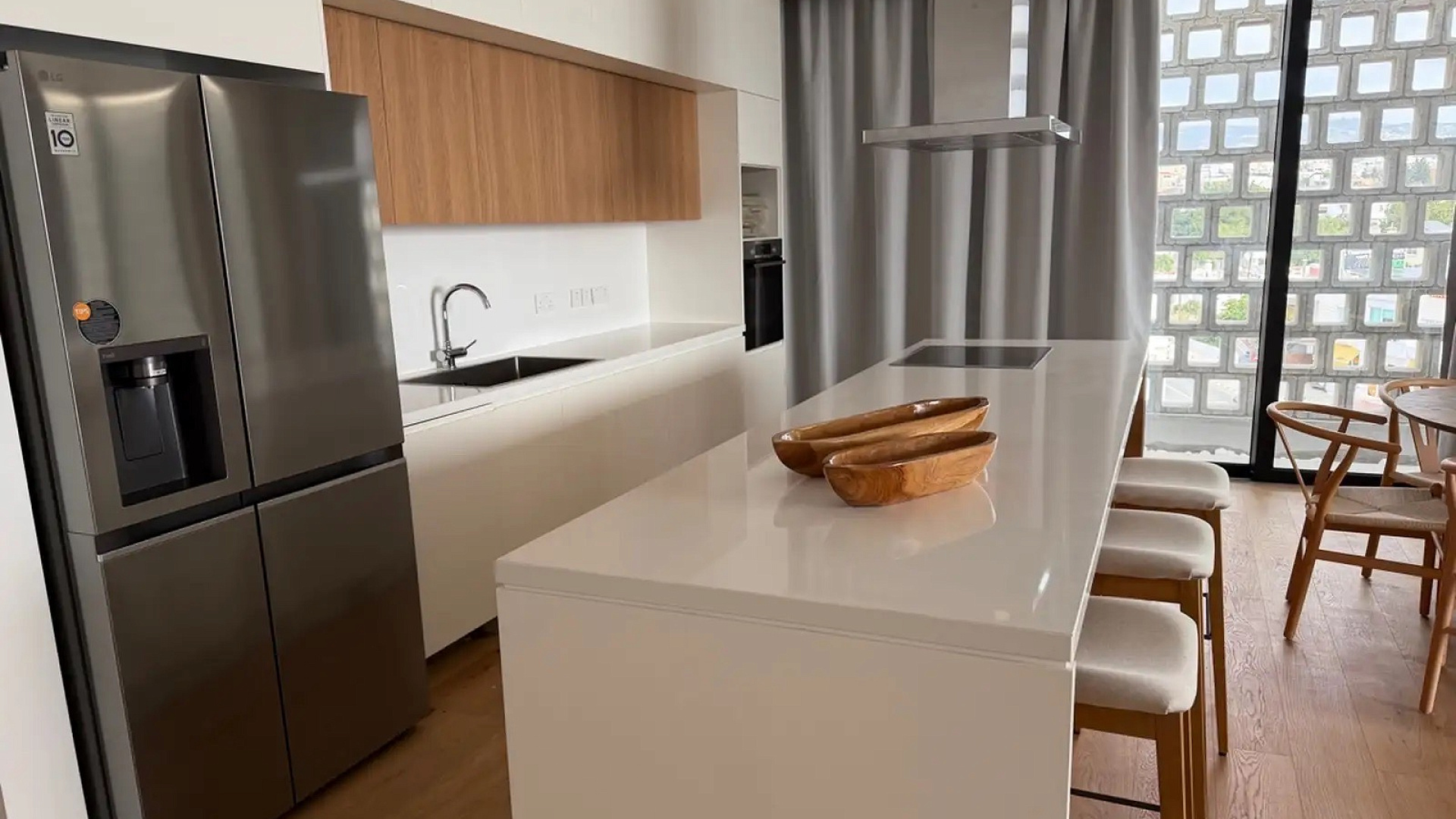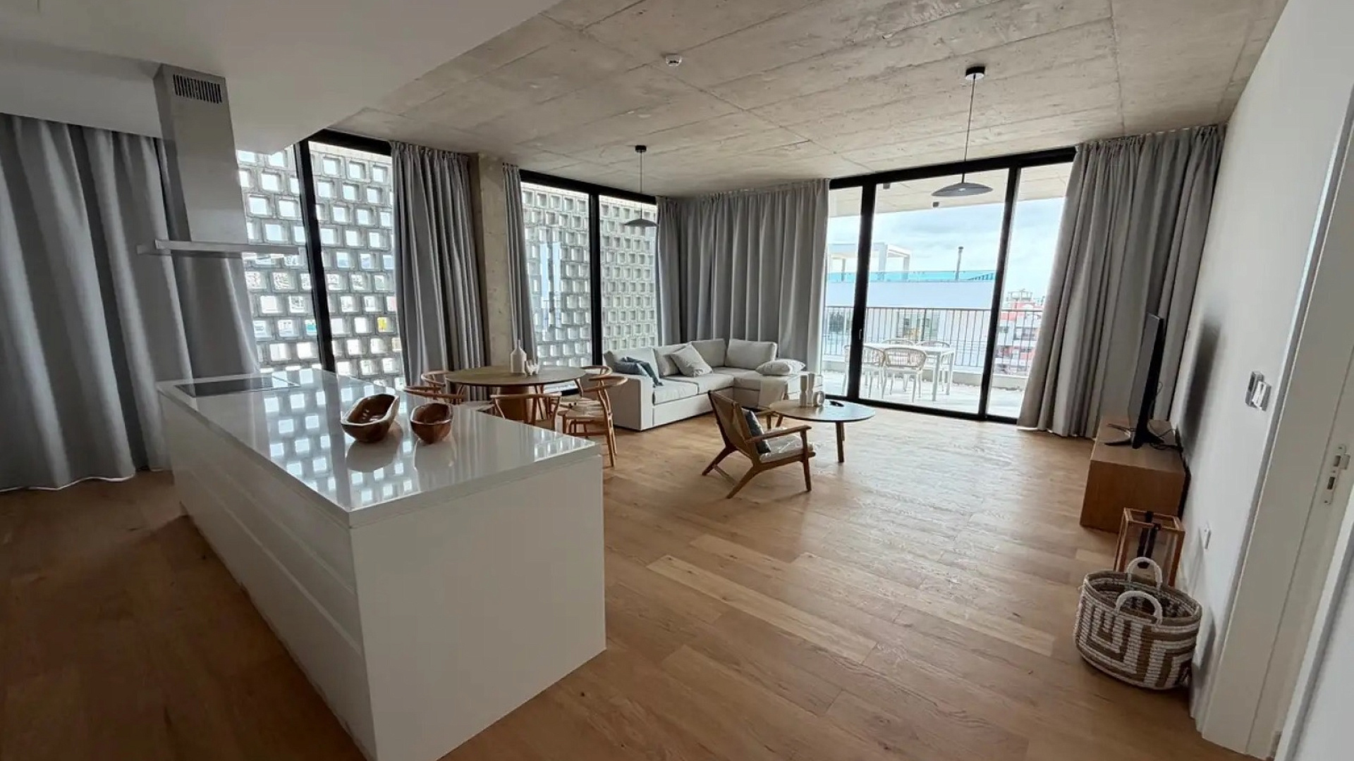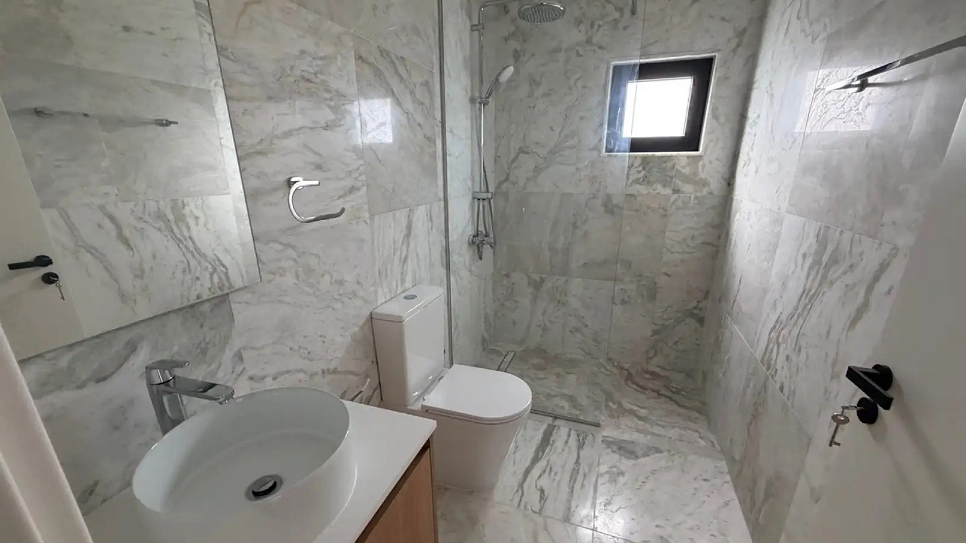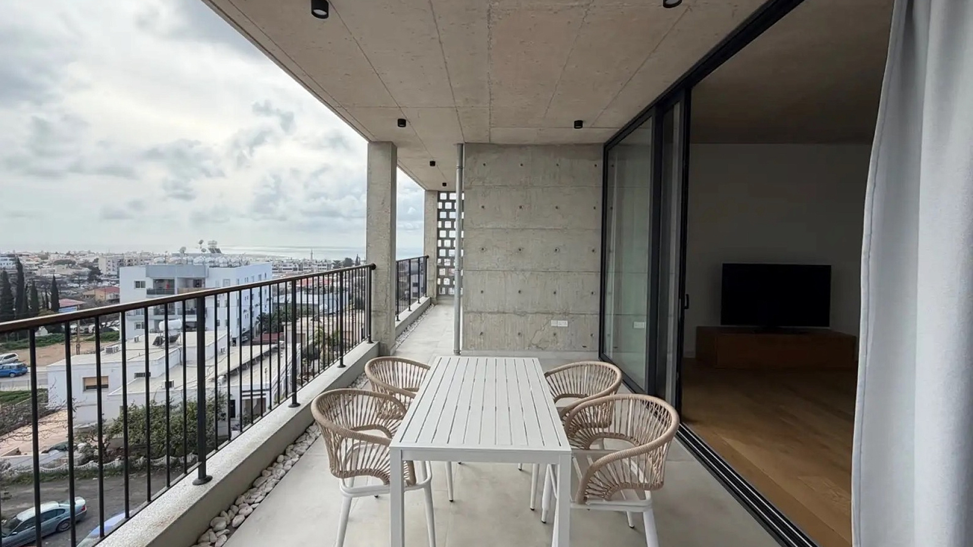 For rent a three-bedroom penthouse with an area of 140 m2 in the area of Agios Pavlos, Paphos. The penthouse occupies the entire 4th floor and includes a spacious outdoor living, dining and kitchen area with a central island, 3 spacious bedrooms, 2 bathrooms with walk-in shower and marble trim, of which the master bedroom with en-suite bathroom, large covered verandas with panoramic views of the city and the sea, a separate laundry room and covered parking. The apartment is located on the 4th floor. The residence is fully furnished and equipped with integrated appliances, VRV air conditioning in all rooms, underfloor heating, elevator, and premium materials, including natural wooden floors, exposed concrete ceilings, and floor-to-ceiling panoramic sliding doors. This is the flagship residence of the building, offering exclusive use of the entire floor, a high level of privacy, modern architectural solutions and spectacular views of the city panorama and the sea.