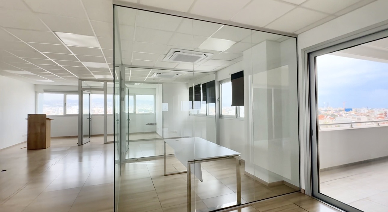 An office for rent in an office building in Omonia, Limassol. The office is offered for rent unfurnished. There is a server room. Kitchen. Terrace. 8 parking spaces.