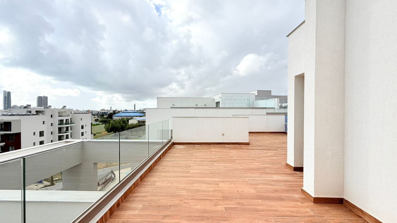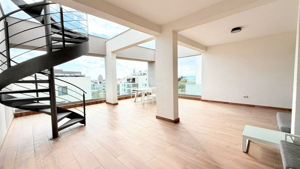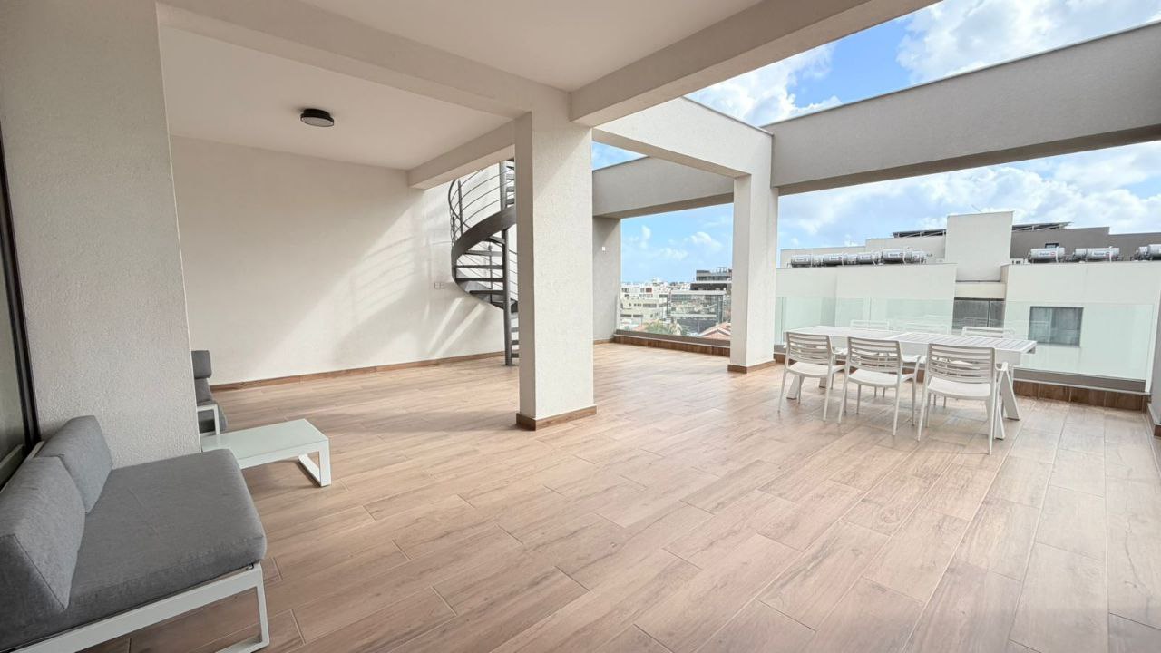For rent a four-bedroom penthouse of 118 m2 with a covered veranda of 35 m2 and a roof terrace of 105 m2 in the area of Agios Athanasios, Limassol. The penthouse is equipped with a central underfloor heating system, an armored entrance door, a video intercom, is fully insulated and has its own storage room and a covered guarded parking lot. The property is located in a residential complex with a luxurious entrance lobby, a gym for residents only, an overflow pool and a children's pool, a BBQ area and a playground, as well as facility management services.