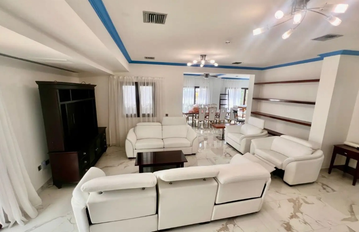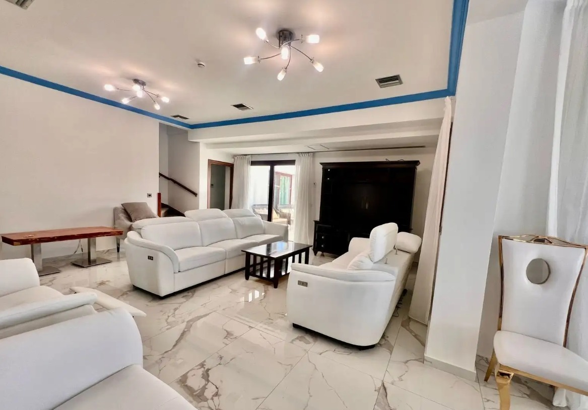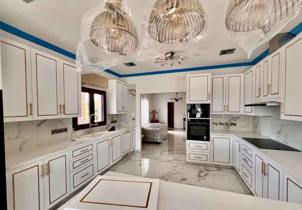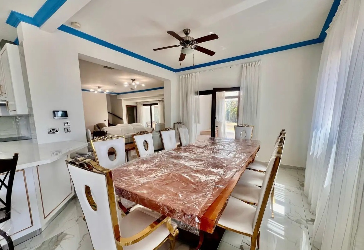 A five-bedroom house for rent in the Dekhelia Larnaca area, with an area of 350 m2, a plot of 5,820 m2. The house includes five spacious bedrooms (two on the first level and three on the second), four bathrooms and a guest toilet, an office, a large open-plan living and dining room, a separate fully equipped kitchen and an additional utility kitchen. The house is fully furnished and equipped with all necessary household appliances, air conditioning in all rooms. A storage room and a covered parking are provided. There is a private swimming pool, landscaped garden, garage. An alarm system and video surveillance cameras are installed. Built in 2004, energy efficiency class B.