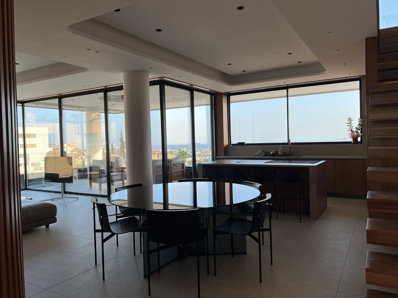 Stylish duplex three-bedroom penthouse for rent in Panthea, Limassol. The apartment is fully furnished and equipped with modern appliances, air conditioners are installed in all rooms. The internal area is 110 m2, the total area is 180 m2. Spacious roof garden. The penthouse is finished with high-quality finishes and is available for occupancy in the near future.
