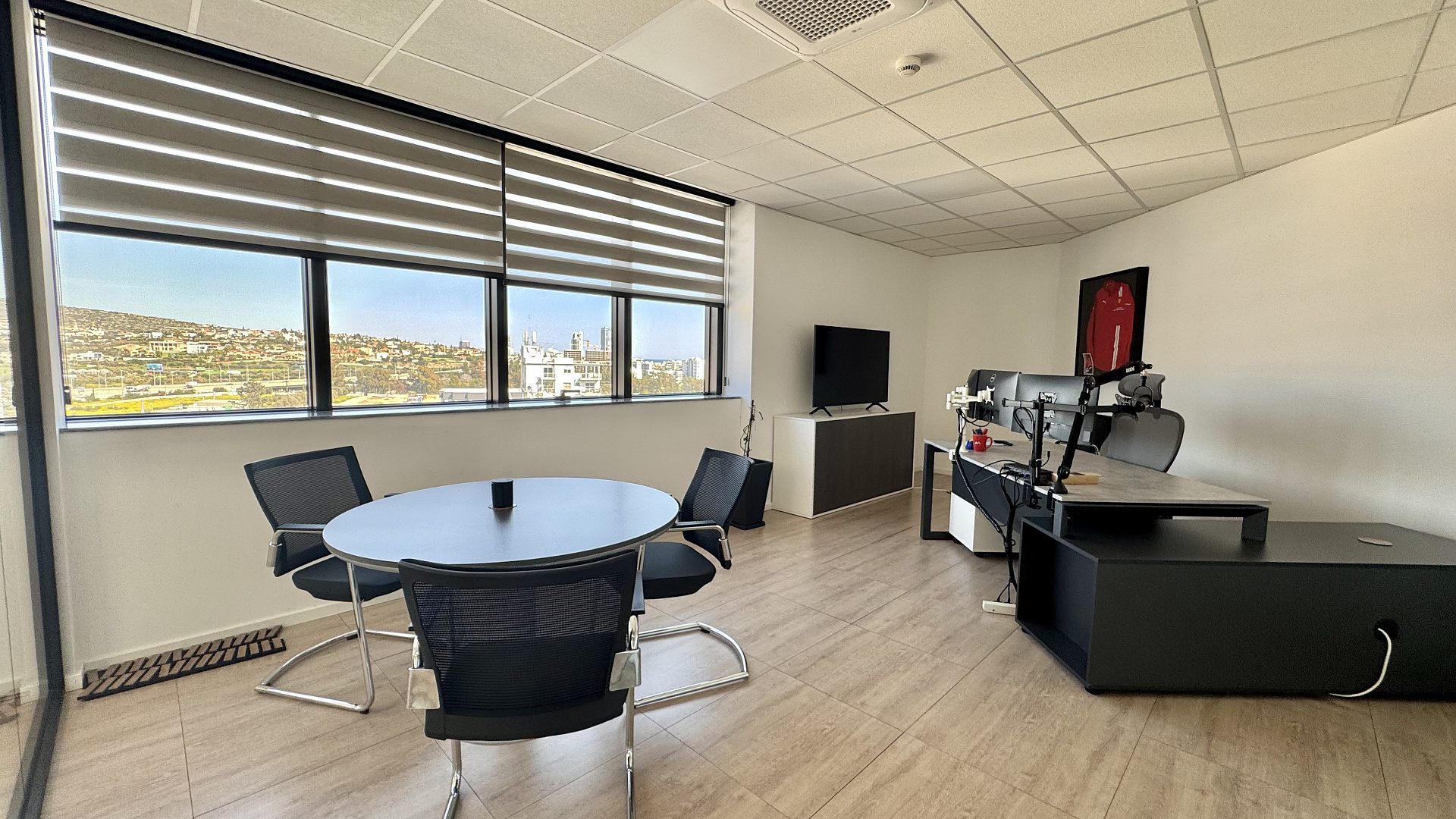 Office for rent with an area of 380 m2 in the Potamos Germasogeia area, Limassol. The office includes 10 separate offices, a spacious open plan area, 1 conference room, a kitchen with a dining area, a reception area, 6 toilets for men and women separately, as well as a pantry. The office is unfurnished, equipped with a VRV air conditioning system, a security system and a raised flooring system. The partitions inside the room can be changed if necessary, the space is designed for about 40 employees. The office is located on the 4th floor and occupies an entire floor of the building. The room includes a spacious rooftop terrace. The tenant has 11 parking spaces in the above-ground parking and 4 covered parking spaces in the underground parking. The room is available for rent immediately, furniture can be purchased separately by agreement. The minimum rental period is 2 years.