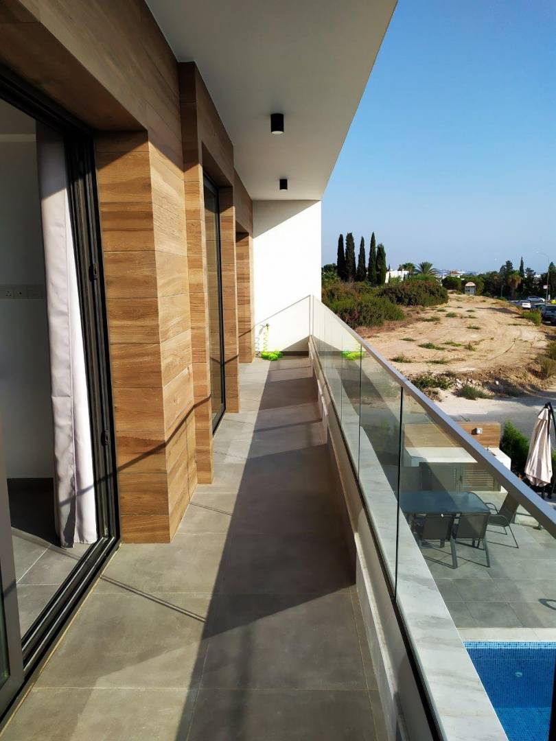 Three bedroom villa for rent in Coral Bay area, Paphos city. A modern new villa with a private pool is located in one of the most popular coastal areas. The house includes three bedrooms and an open-plan kitchen. One bedroom is located on the first floor, the other two bedrooms are on the second floor and have direct sea views. There is also a separate small room that can be used as an office or playroom. The villa is fully furnished with new furniture. The house is located within walking distance from the sea and Coral Bay beach, next to Coral Beach and Corallia. The main road of the Coral Bay area is nearby, where restaurants, shops and public transport stops are located.
