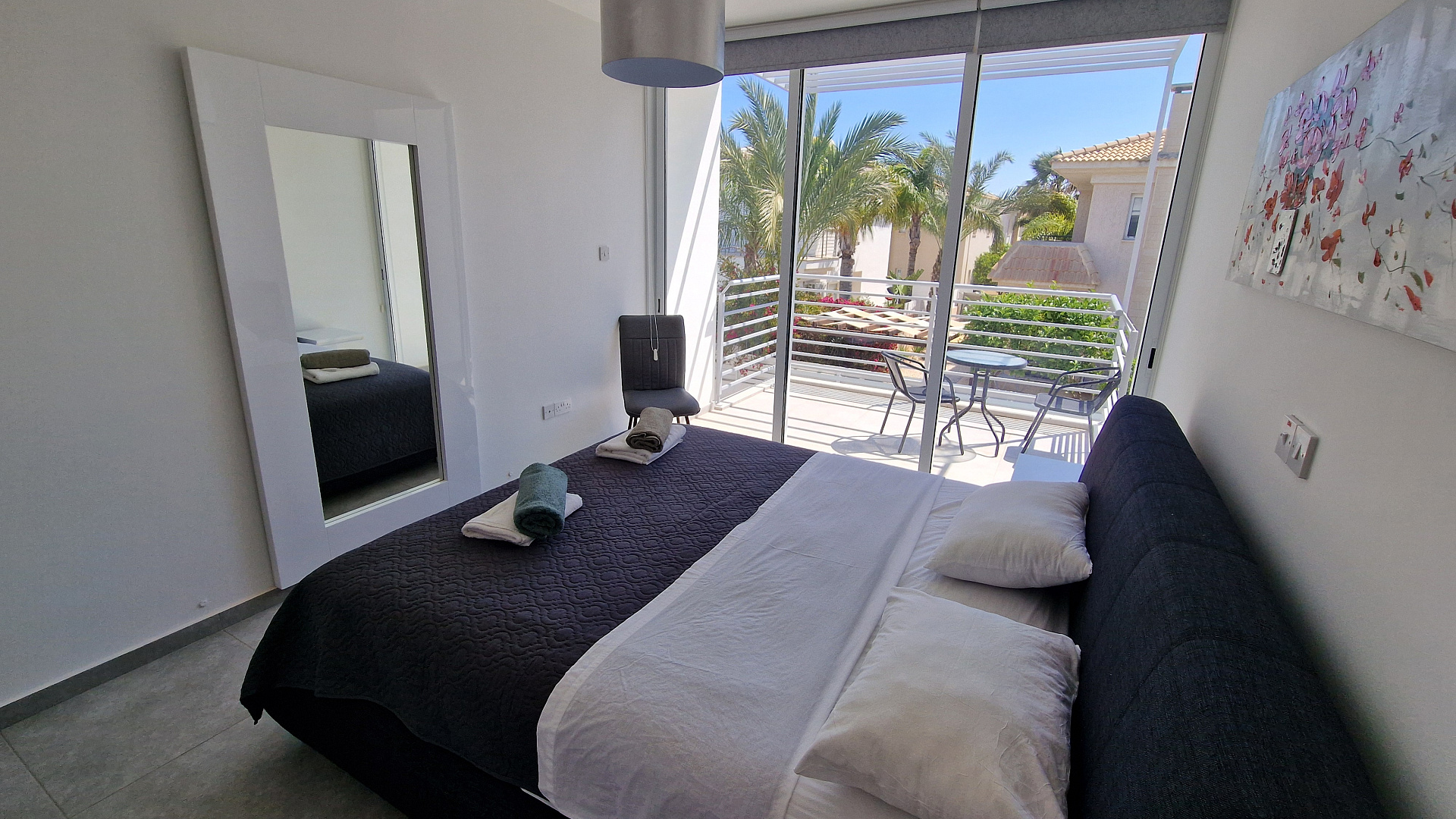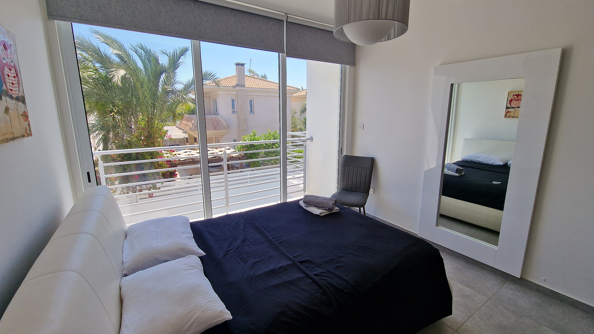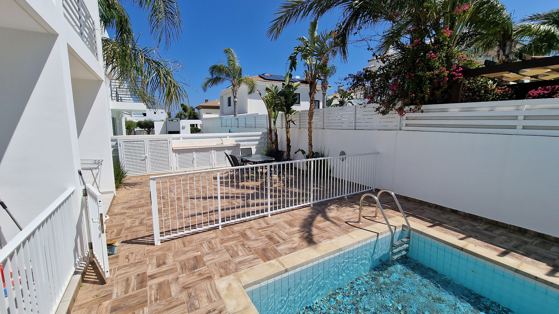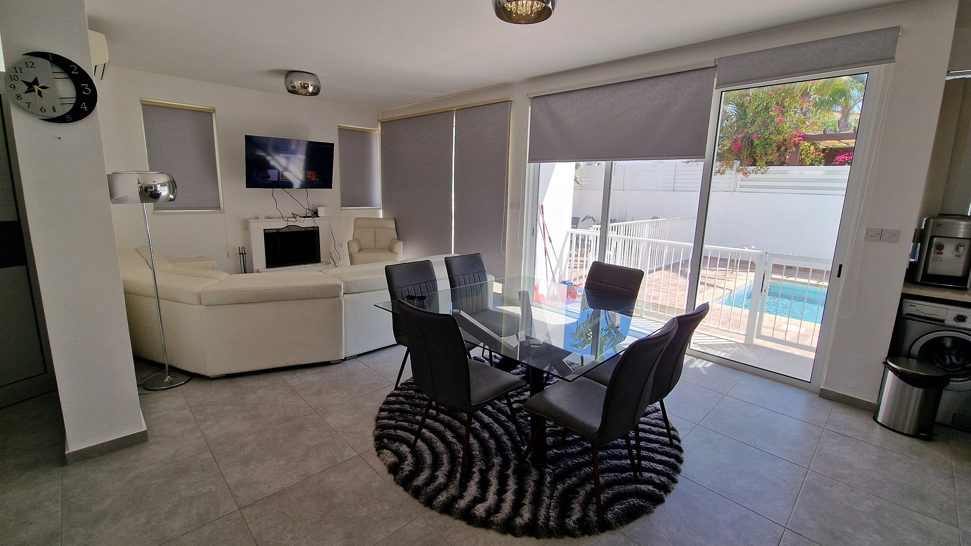 Three bedroom villa for rent in Kaparis area, Famagusta. The villa includes three bedrooms, two bathrooms and a guest toilet, a kitchen and a spacious living room. The house is fully furnished and equipped with household appliances and air conditioners. There is a private swimming pool and parking on site. The villa is located in a private, quiet complex close to supermarkets, cafes and restaurants. It's a five-minute walk to the beach.