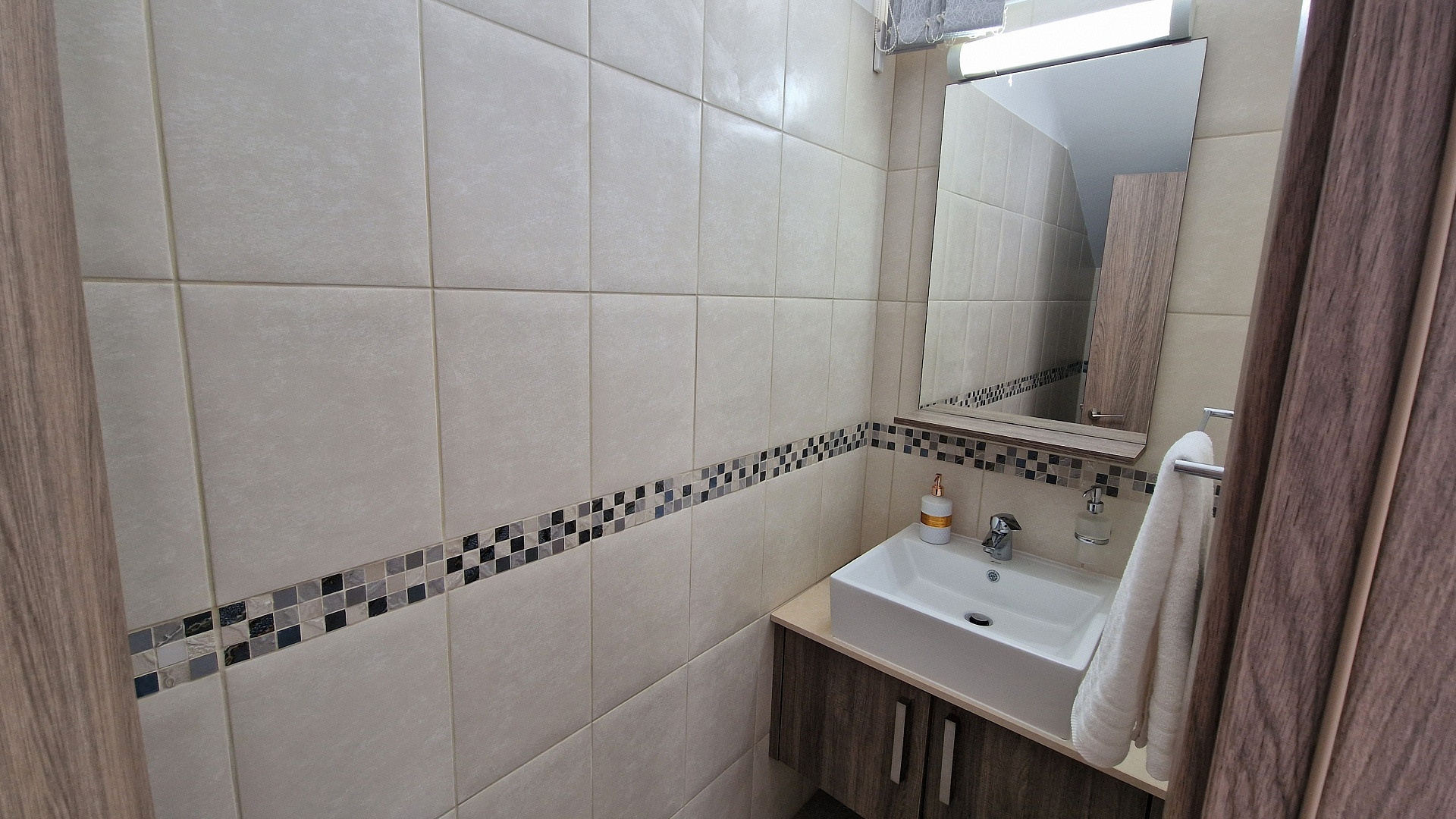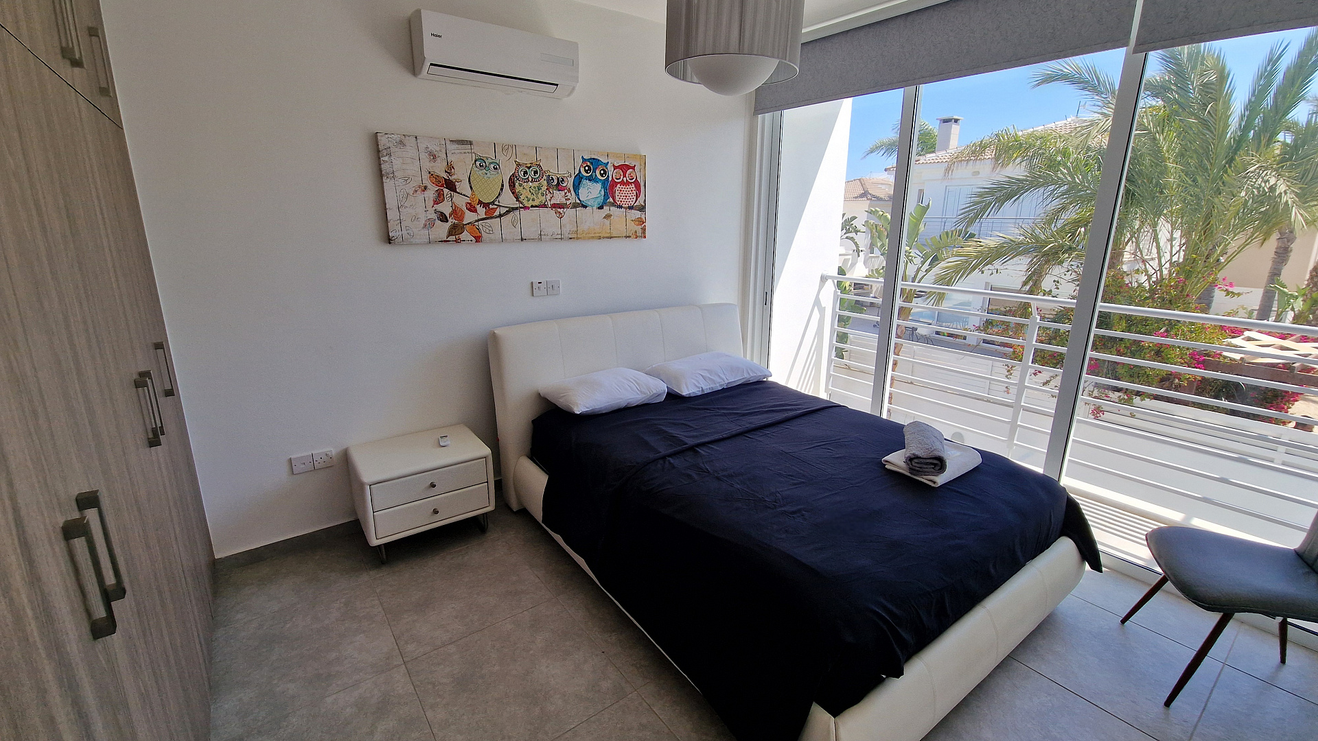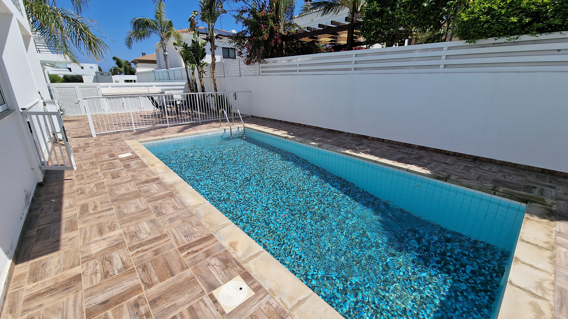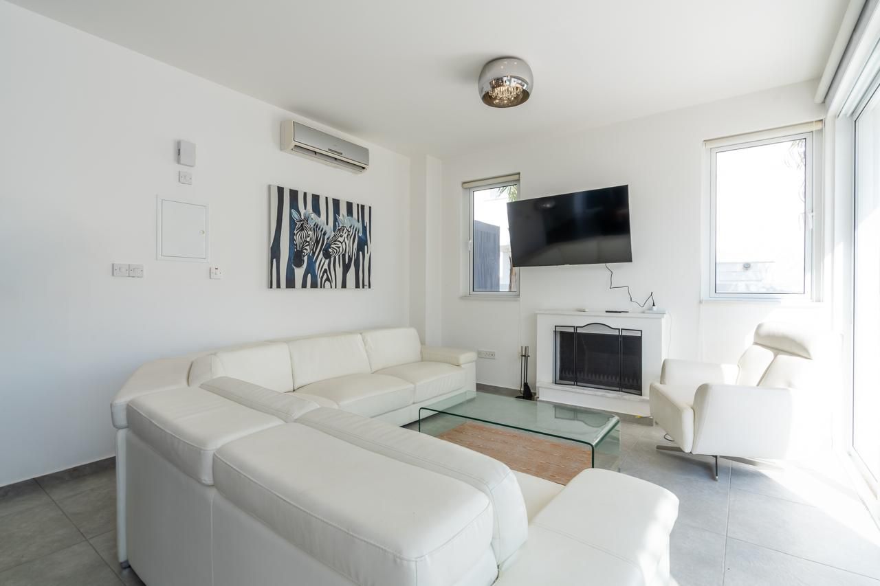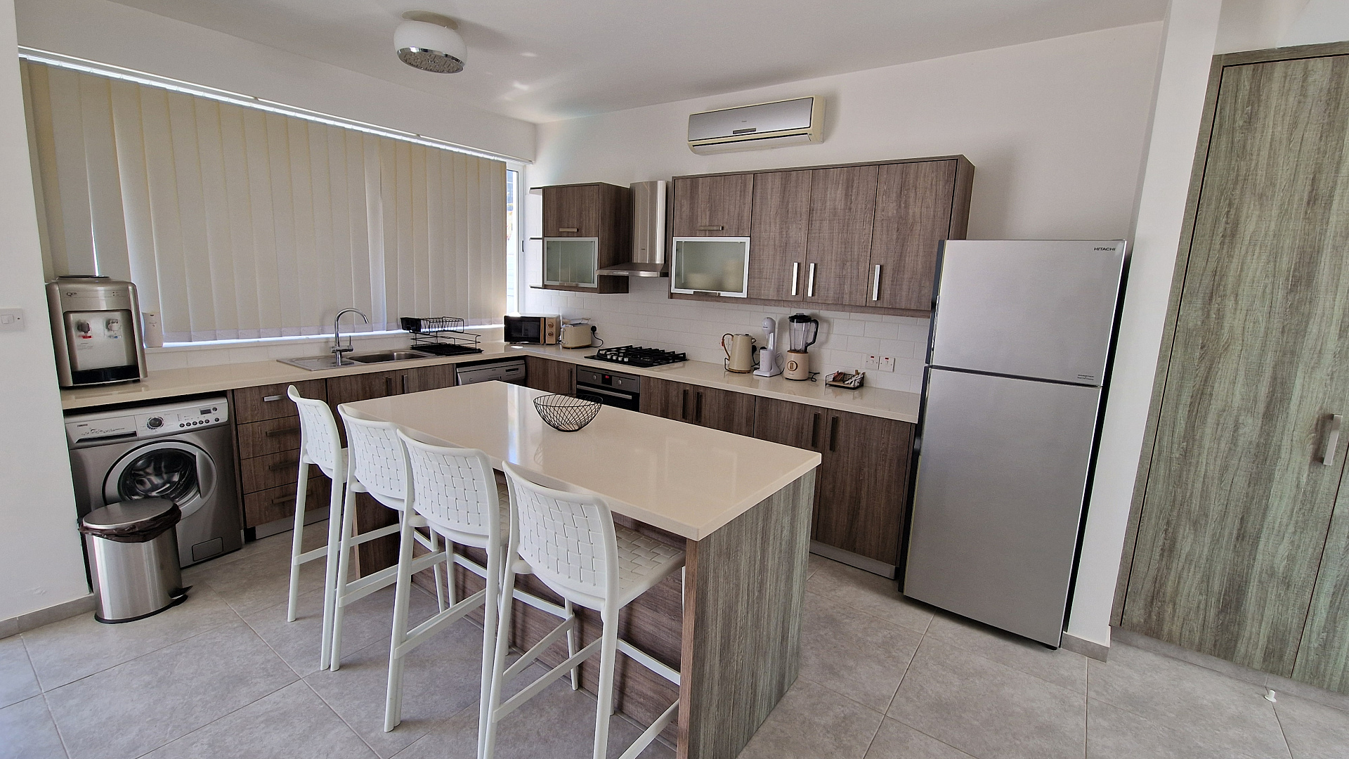 Three bedroom villa for rent in Kaparis area, Famagusta. The villa includes three bedrooms, two bathrooms and a guest toilet, a kitchen and a spacious living room. The house is fully furnished and equipped with household appliances and air conditioners. There is a private swimming pool and parking on site. The villa is located in a private, quiet complex close to supermarkets, cafes and restaurants. It's a five-minute walk to the beach.