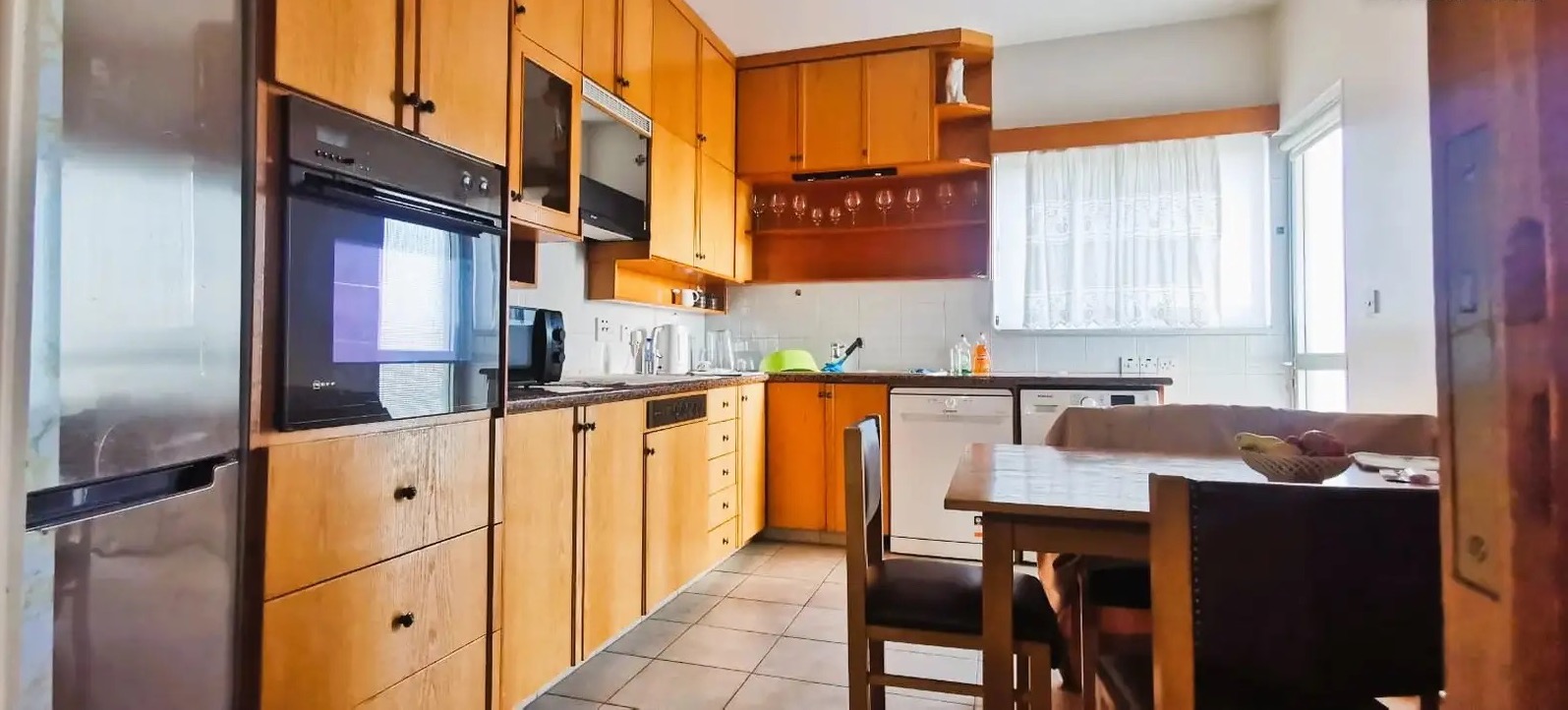 Three-bedroom apartment of 140 m2 for rent in Neapolis, Limassol. The apartment includes 3 bedrooms, 2 bathrooms (one with a shower and one with a bathtub), a kitchen, a living room, 4 balconies and storage rooms. The apartment is located on the 3rd floor. The property is fully furnished and equipped with household appliances, including a washing machine, dishwasher, refrigerator, stove, oven, microwave and kitchen equipment, as well as equipped with air conditioning in all rooms, solar water heating system, armored entrance door, elevator and covered parking. The residence is located just 500 m from the beach and within walking distance from the city center, with convenient access to all urban infrastructure and main roads. The accommodation is located in a small, quiet building with only 10 apartments, it is distinguished by high-quality finishes with granite surfaces in the bathrooms and kitchen, laminate floors in the bedrooms and wooden flooring in the living room.