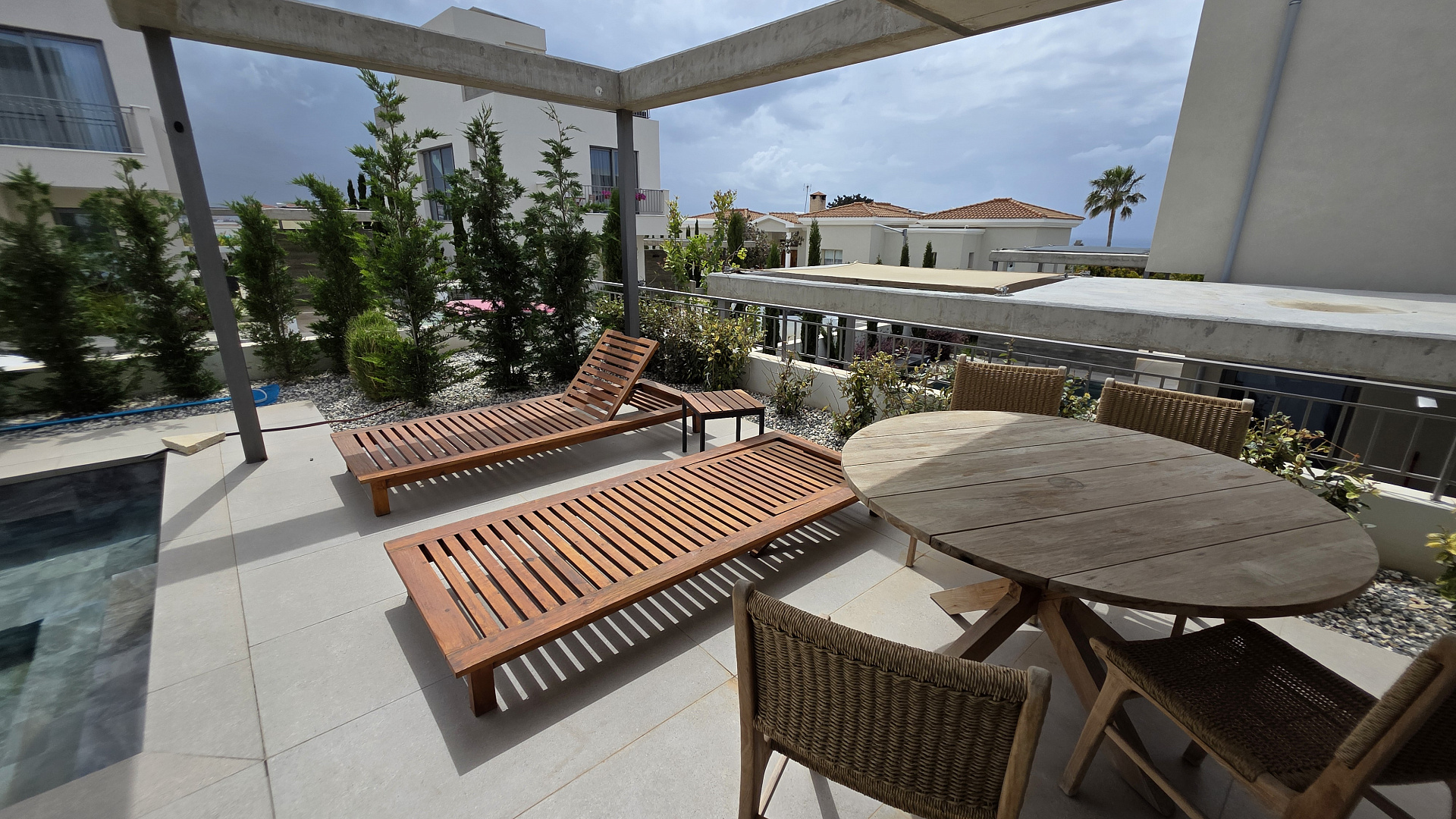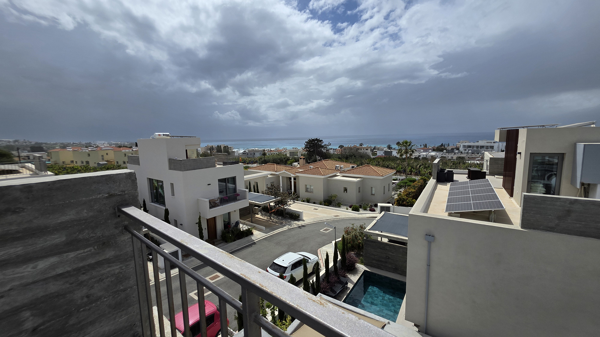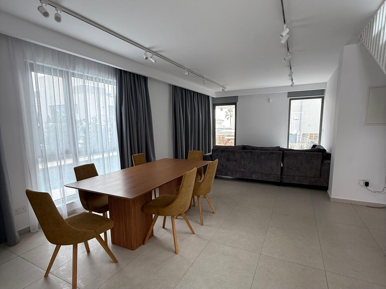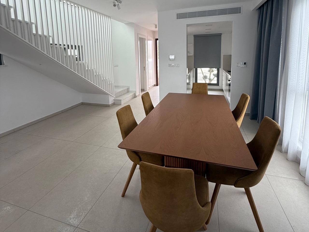 Two-bedroom villa of 200 m2 for rent in the area of Kissonerga, Paphos. The villa includes 3 bedrooms, 3 bathrooms, a kitchen, a living room, a terrace, balconies, a rooftop relaxation area, a private pool and a covered parking. The residence is fully furnished and equipped with VRV air conditioning, underfloor heating, solar panels and all necessary household appliances. The property is located in a great area with sea views, just 350 m from the coast. There is an outdoor shower by the pool, a neatly landscaped plot and a shared playground in the complex.