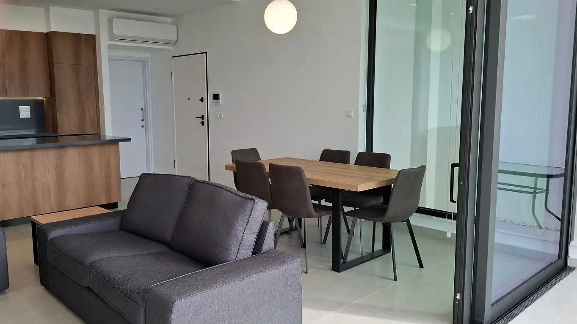 Two-bedroom apartment of 84 m2 for rent in Kapsalos area, Limassol. The apartment is located on the 2nd floor. The apartment includes 2 bedrooms, 2 bathrooms, a spacious living area with a dining area and a TV area, an open-plan kitchen, a large veranda and a storage room. The apartments are fully furnished and equipped with Bosch appliances, built-in kitchen appliances, air conditioners in all rooms, blinds, solar panels and a water pressure system. The apartment is located in a quiet area next to Spyrou Cyprianou Avenue, in close proximity to all amenities, offices and a supermarket. The residence is brand new, built in 2026, has energy efficiency class A, covered parking is provided in a closed area, pets are not allowed.