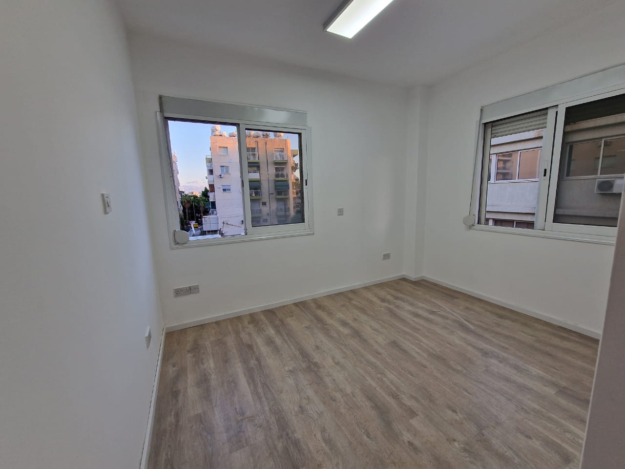 Office space of 100 m2 for rent in Neapolis, Limassol. The office includes a main work room with a kitchen area, two separate offices, a kitchen and a bathroom. This facility has been completely renovated and is equipped with laminate flooring, new air conditioners, professional office lighting and a structured cabling system. The property is located on the third floor of a building with a balcony overlooking the main street, there is one covered parking space and additional parking in front of the building.