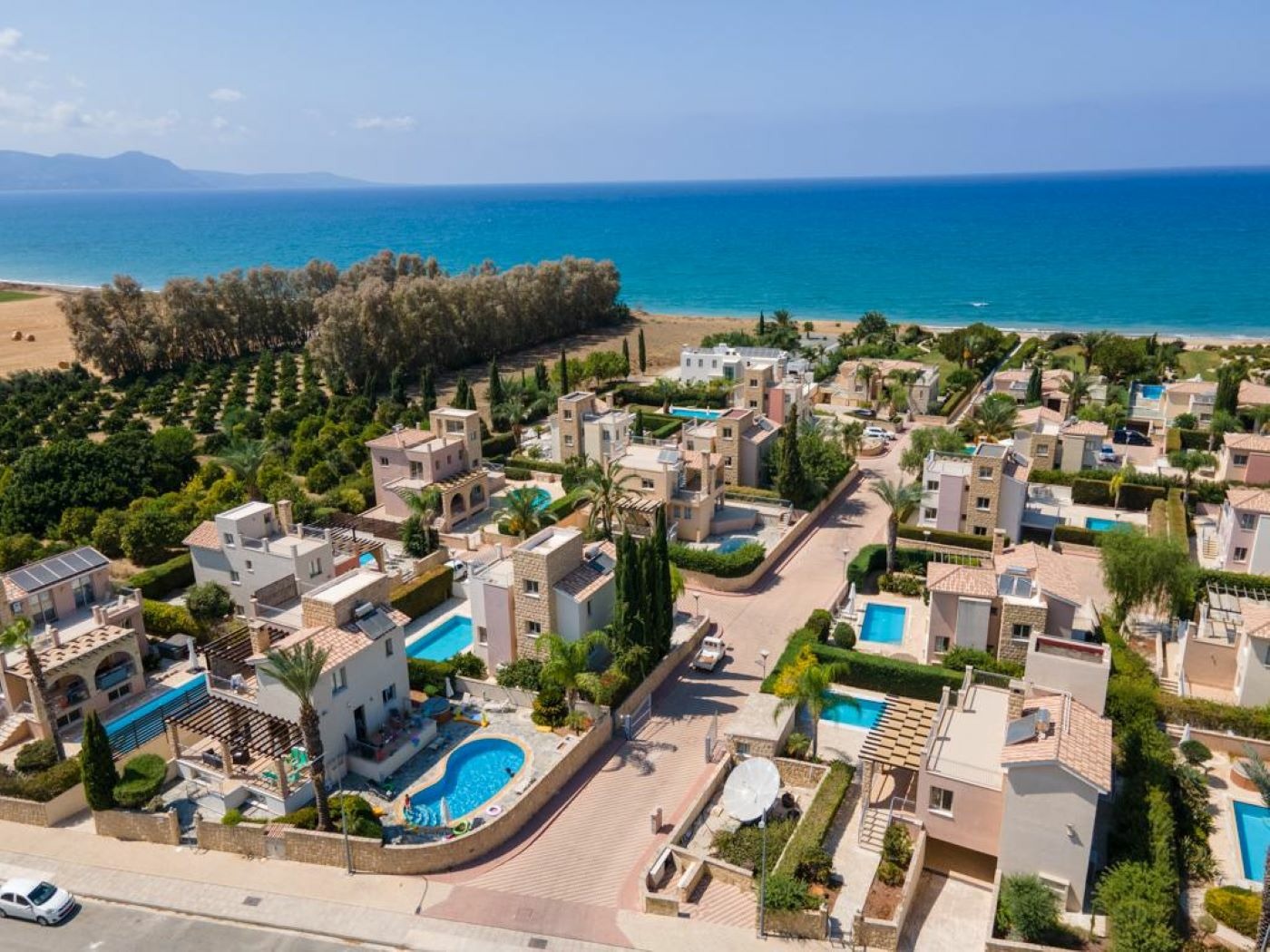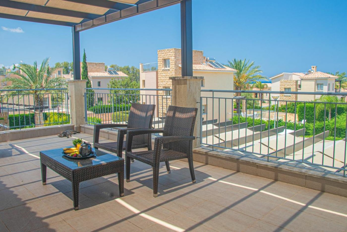 3-bedroom villa for rent in a gated complex in the Polis area, Paphos, with a total area of 180 m2 on a plot of 600 m2. The villa is fully furnished and equipped, includes three bathrooms, a spacious living room with fireplace and access to the terrace, a modern kitchen with appliances, storage rooms and a covered garage. There is an infinity pool with a shower, a well-maintained mature garden, balconies and recreation areas, an alarm system and a video surveillance system are installed, centralized air conditioning and heating in all rooms, energy efficiency class B, built in 2013. The complex has a private sandy beach. The villa is located near Polis Centre and Latchi Marina, in one of the most prestigious resort areas of Cyprus.