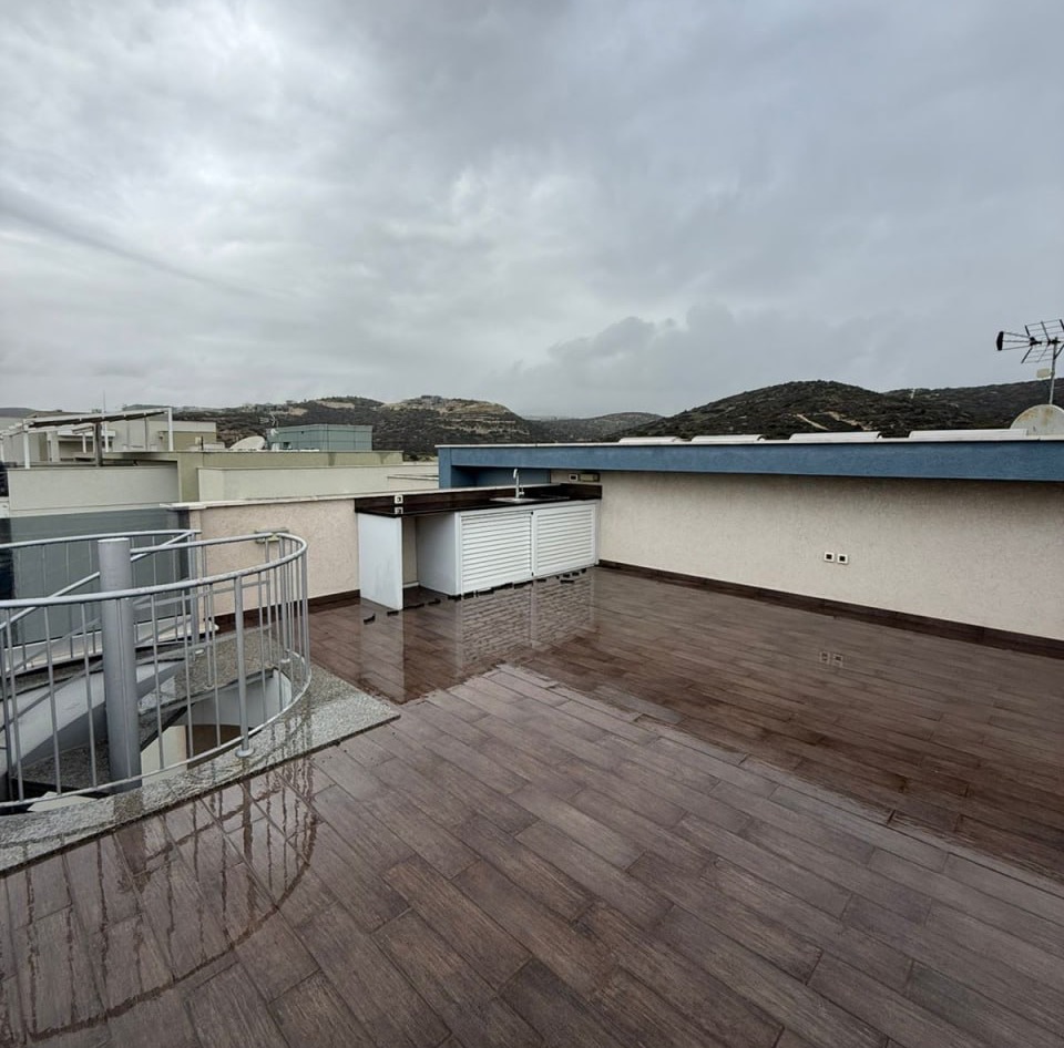 Three-bedroom penthouse of 145 m2 for rent in the area of Agios Tychonas, Limassol. The penthouse includes 3 bedrooms, 3 bathrooms and 1 guest bathroom, a kitchen, a living room, a covered veranda of 35 m2, an open veranda of 50 m2 and a storage room. The penthouse is not furnished, equipped with household appliances. The apartment is located on the 5th floor. The residence offers indoor and outdoor parking, 1 indoor and 1 outdoor parking space.