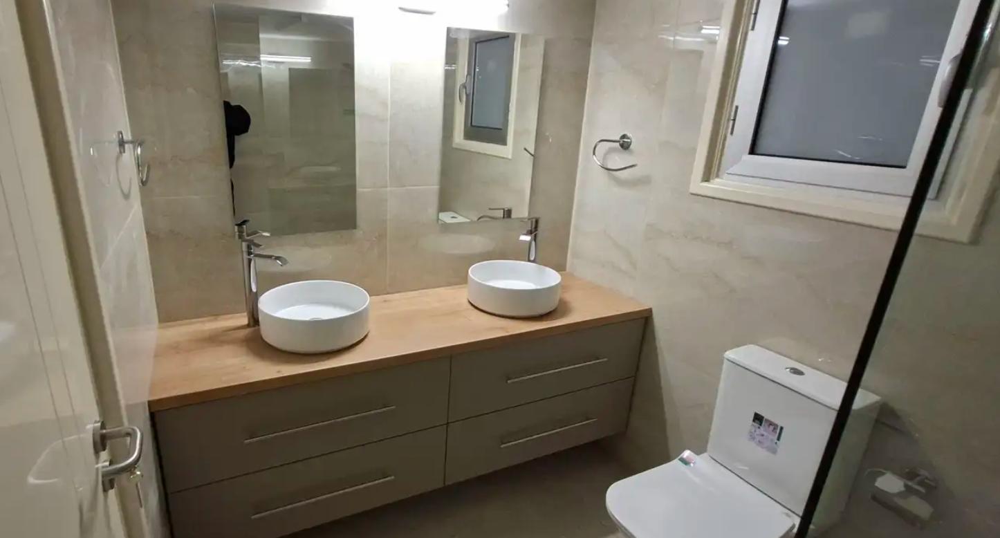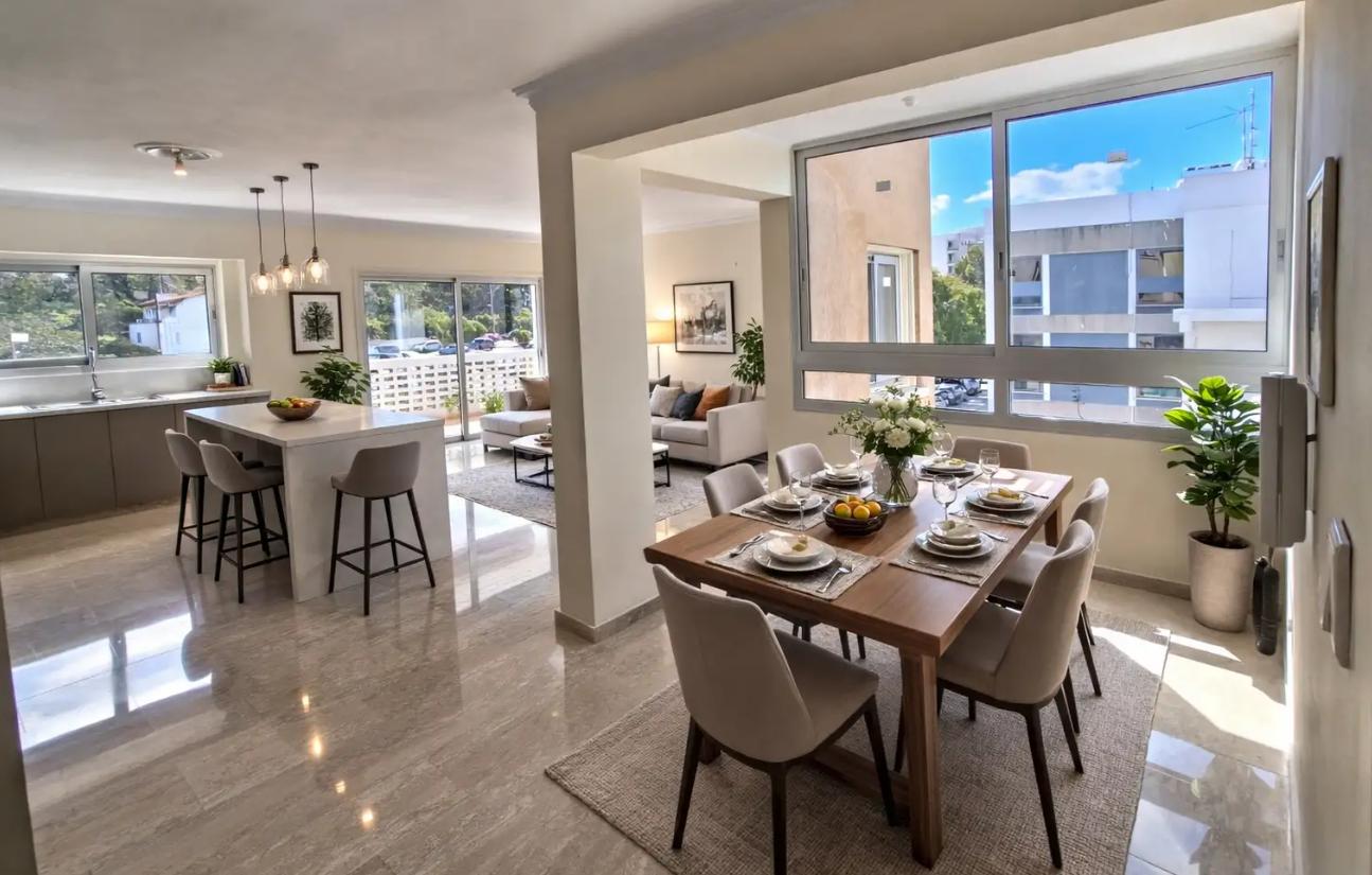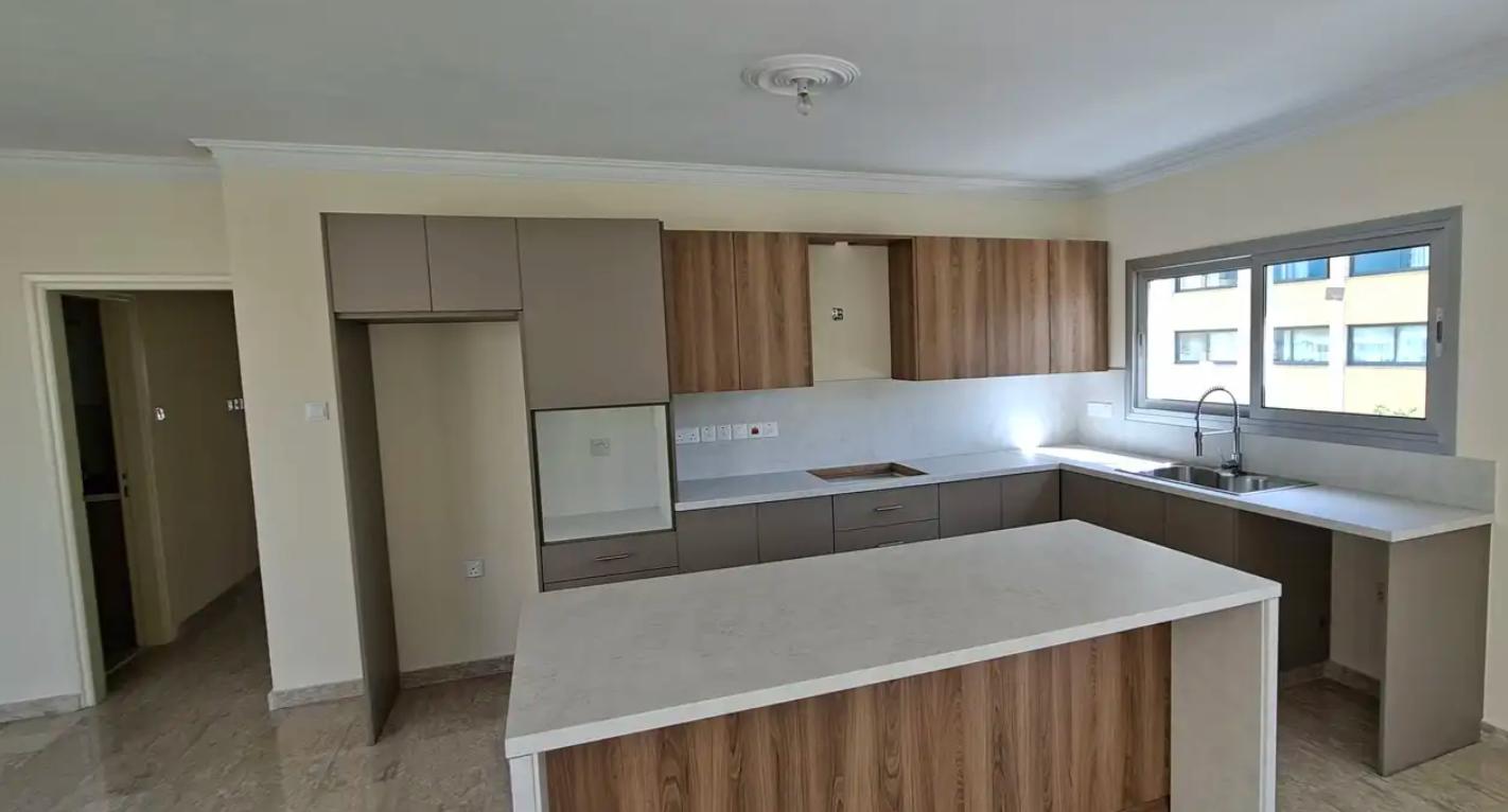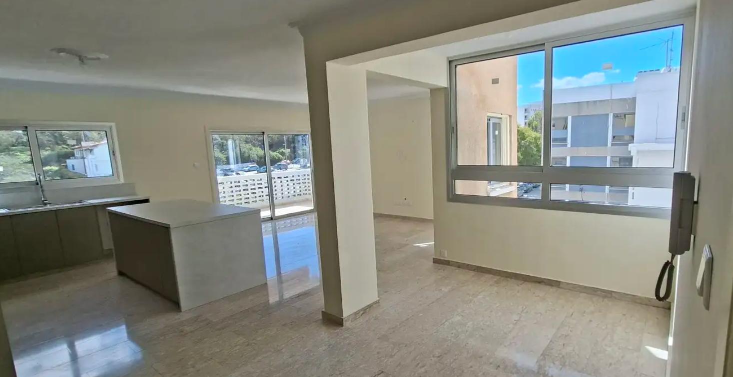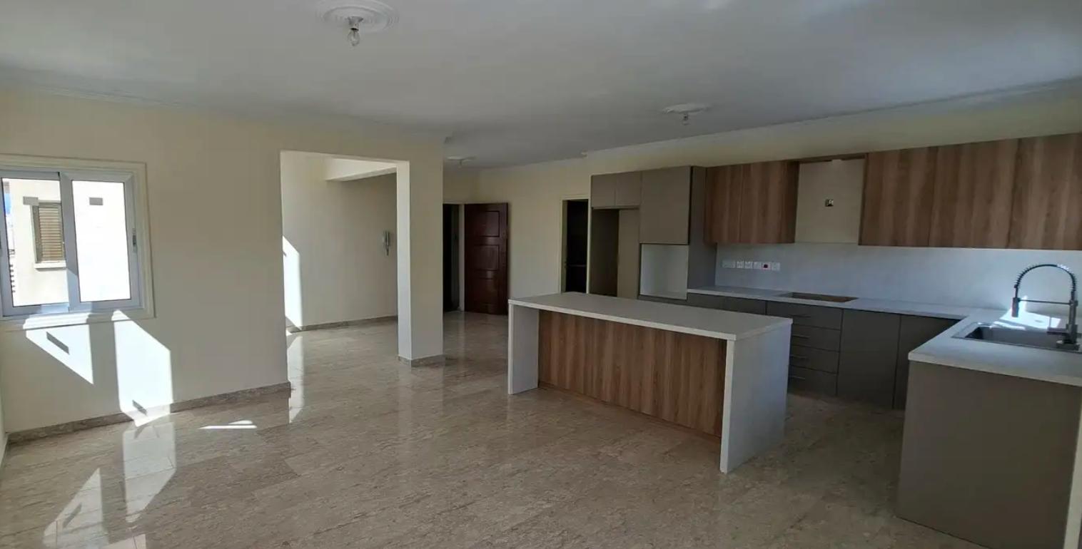 Four-bedroom apartment for rent in the area of Agioi Omologites, Nicosia. The apartment has an area of 140 m2, located on the 3rd floor, includes 4 bedrooms and 2 bathrooms, with a spacious open-plan kitchen-living room and large verandas overlooking the city and the park. The apartment is fully renovated, made using high-quality materials: marble and ceramic floors, modern built-in wardrobes, a new kitchen with an island, double glazing, a solar water heating system and a water pressure system are installed, air conditioning infrastructure is provided in all rooms. The house has an elevator, a covered parking, a storage room and a garden. The apartment is located in an area with developed infrastructure, within walking distance of shops, schools, banks and convenient access to the city center and the highway, pets are allowed.
