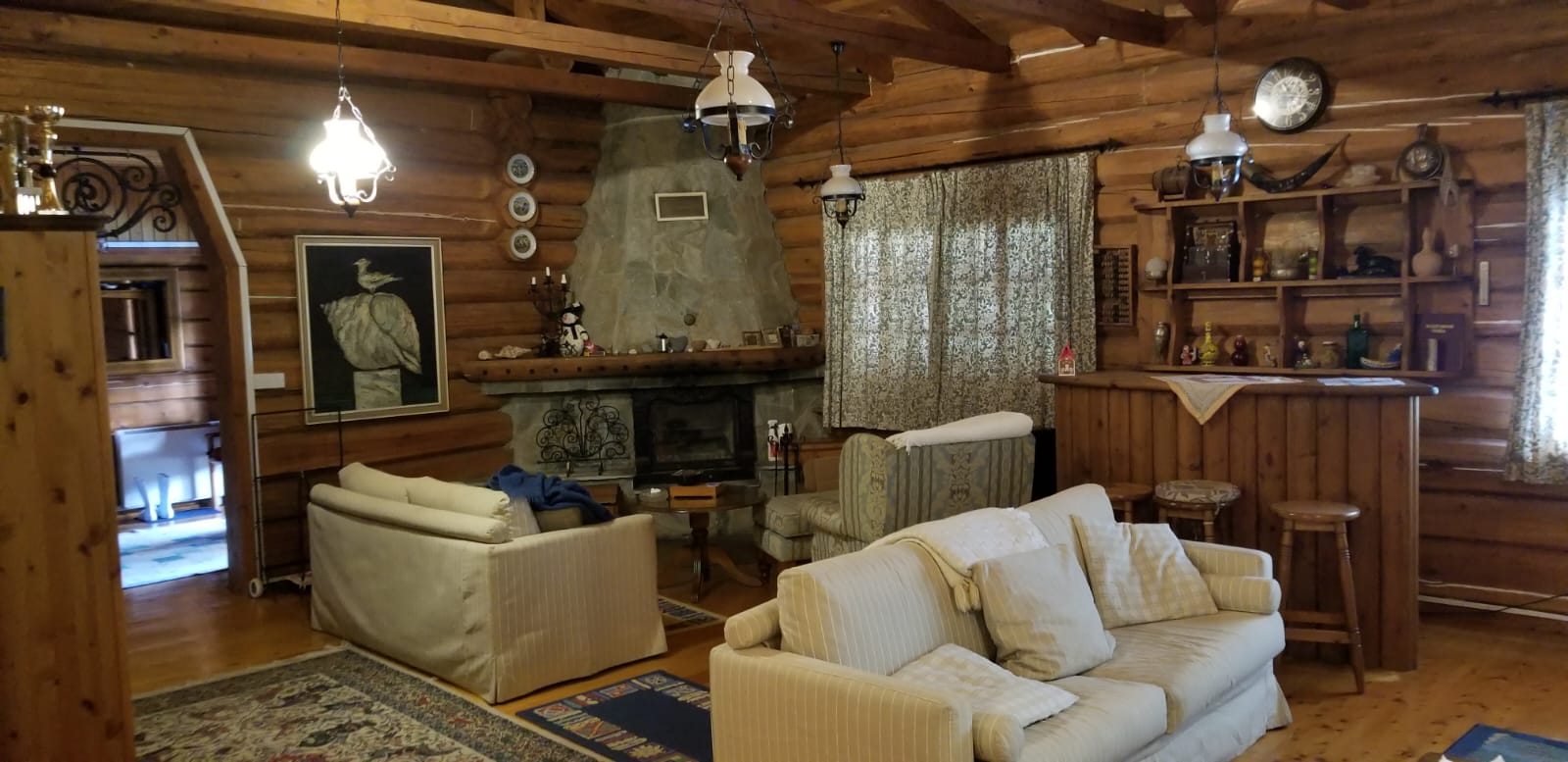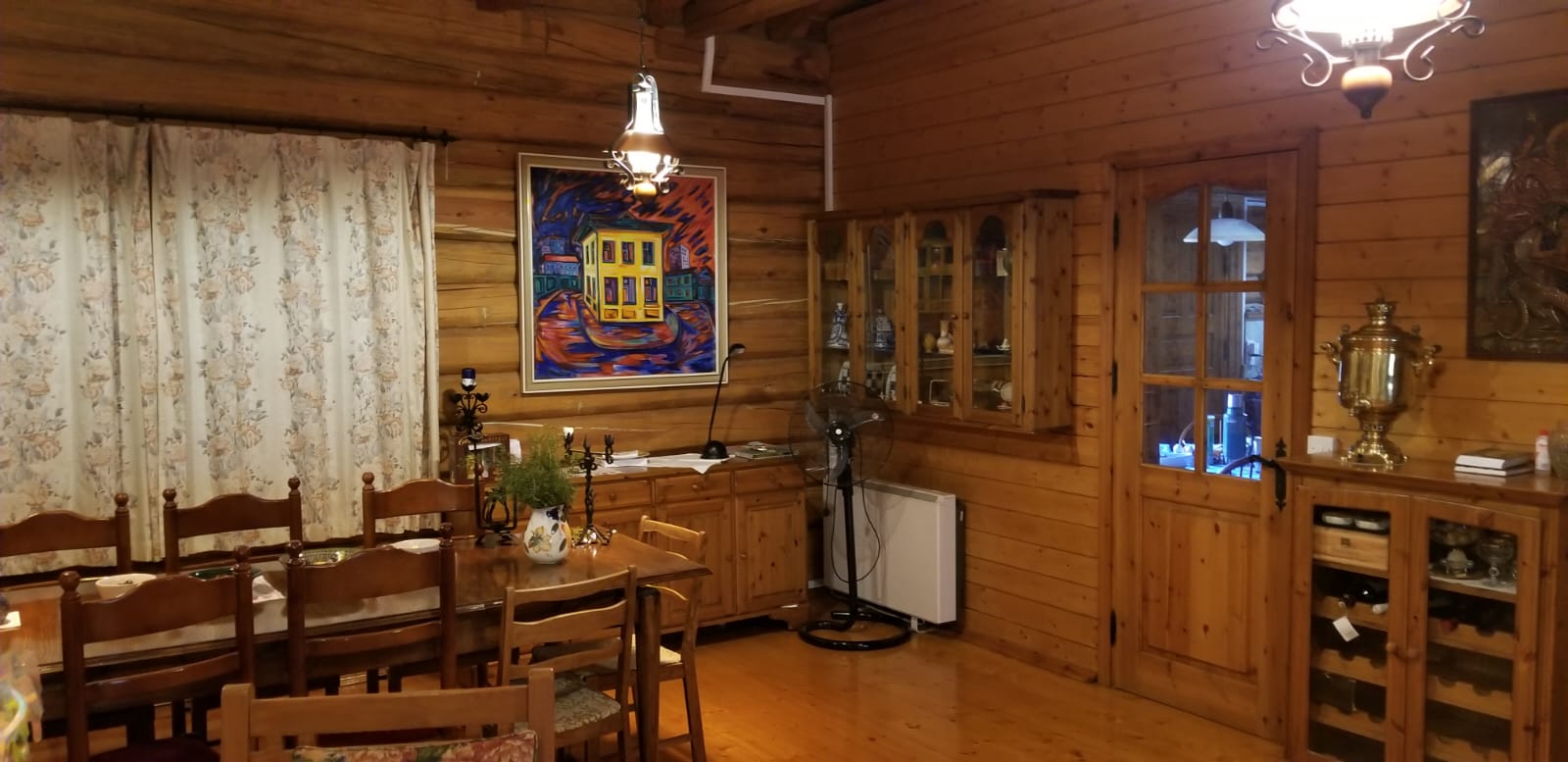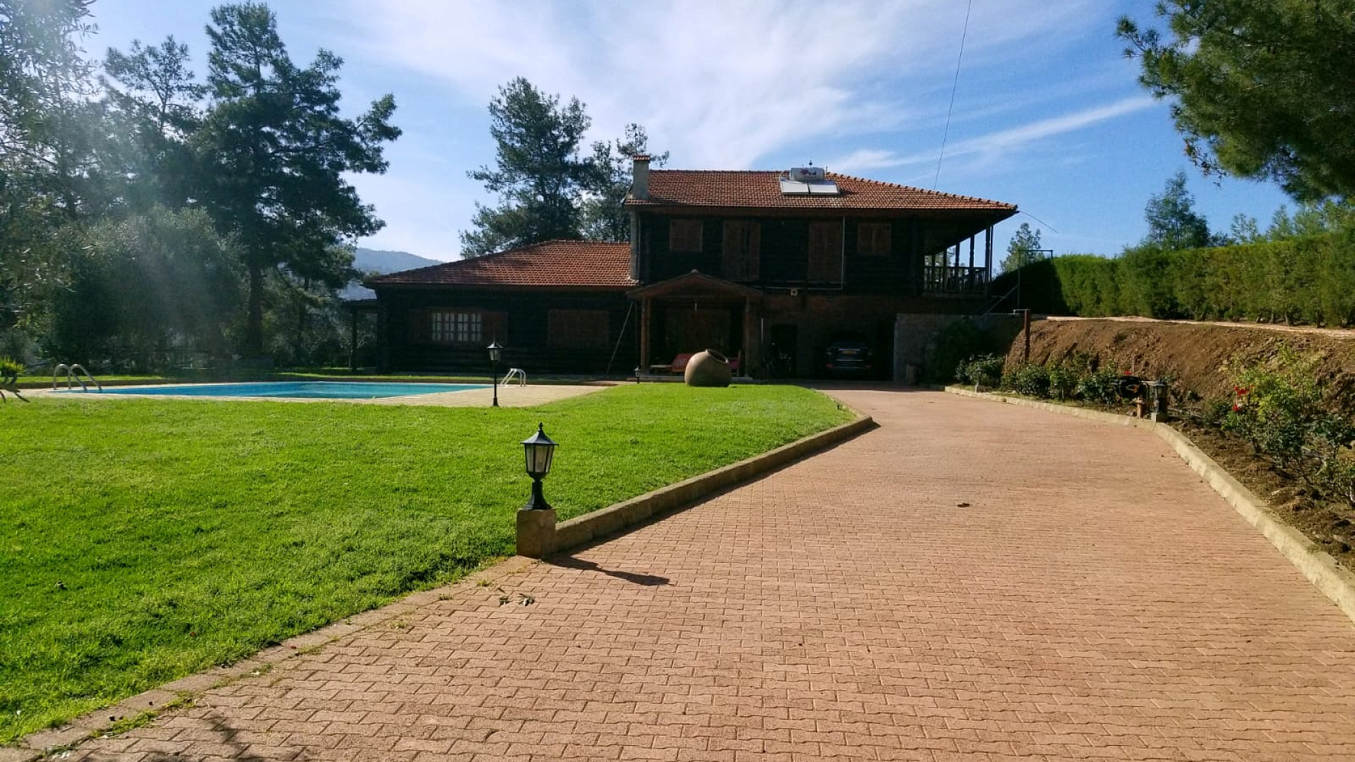 A unique wooden house for sale. The house is made of Archangelsk pine and has a beautiful tiled roof and a huge fireplace designed by architect Meletiou. The house has three floors and comprises 4 fully furnished bedrooms (including a master bedroom) as well as 3 shower rooms and a Jacuzzi. The house includes attic, bath complex and sauna, storage rooms, utility rooms, covered garage for 2 cars, carport, 15x6 swimming pool with water purification system, workshop, and woodstorage. Huge garden with more than 100 different plants including: fig, pecan, lemon, tangerine, pear, laurel, persimmon, 2 types of grapes. Irrigation system with tanks of 12 m3, with polypropylene pipes.