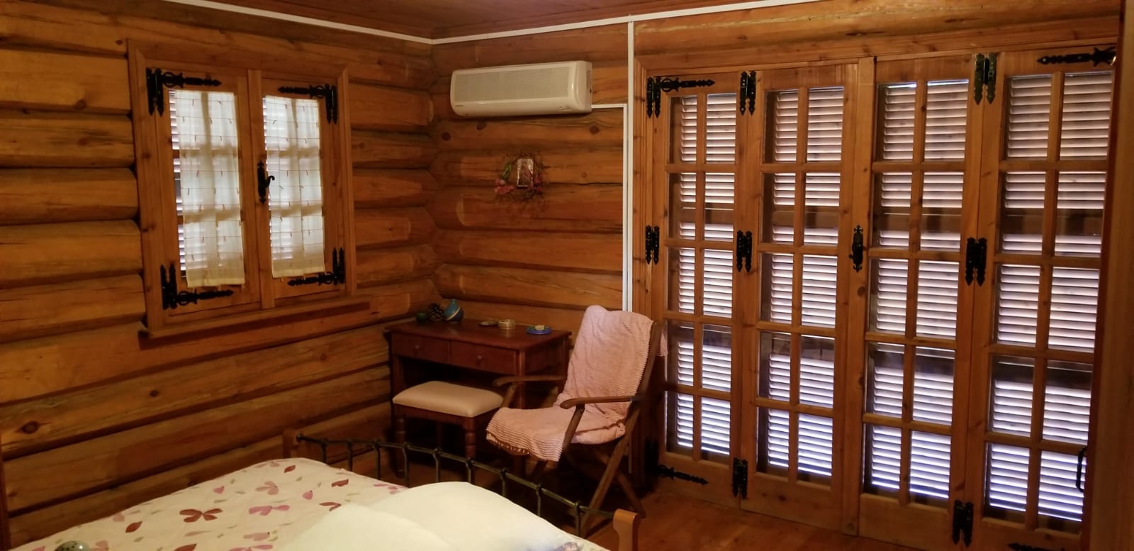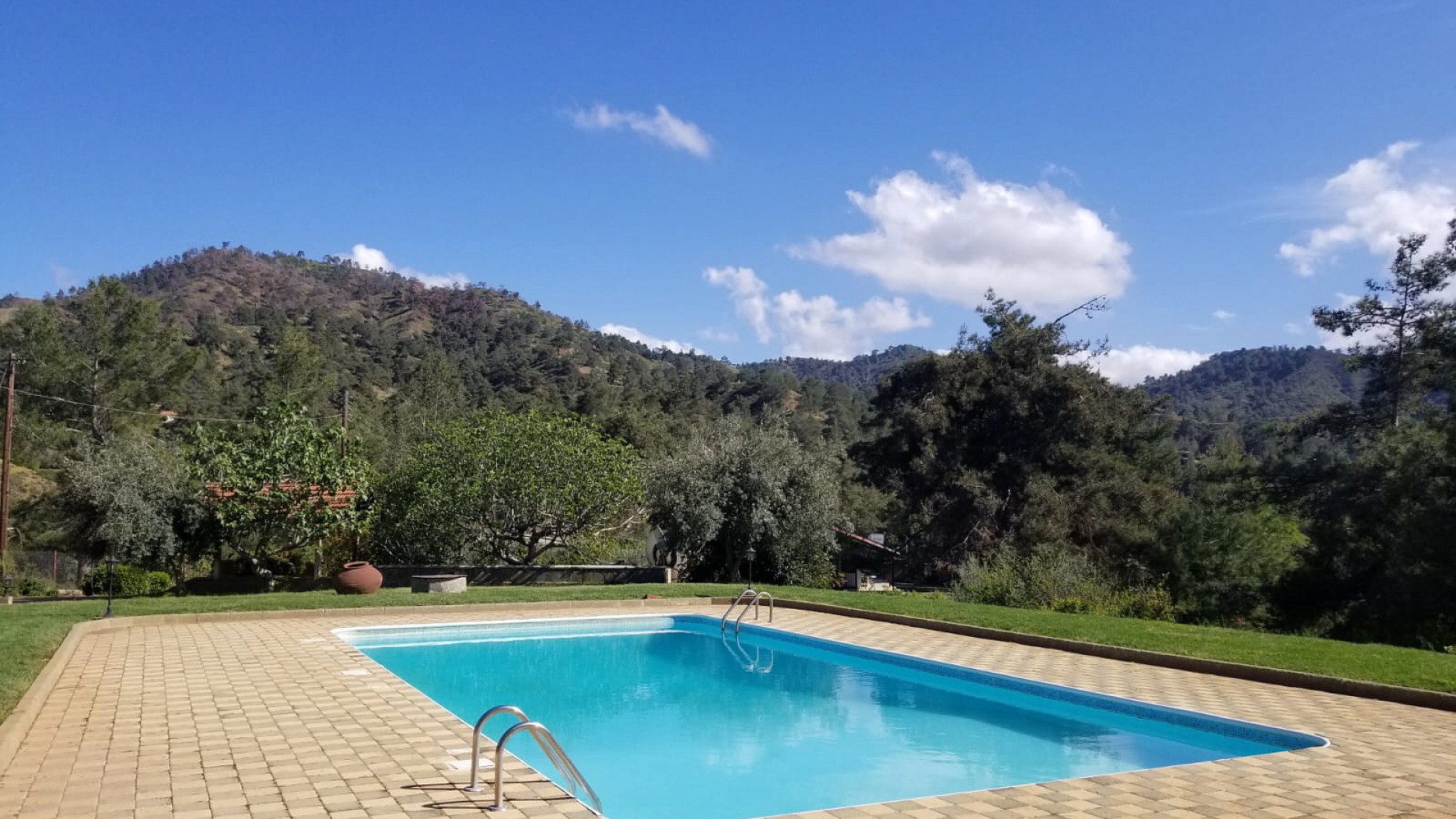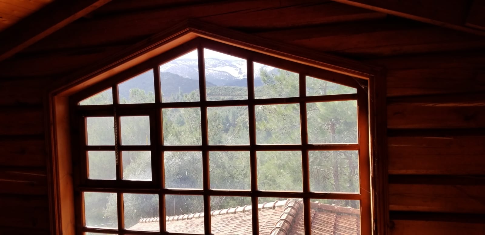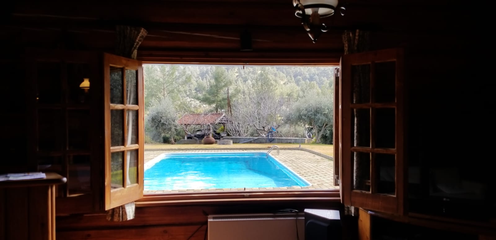 A unique wooden house for sale. The house is made of Archangelsk pine and has a beautiful tiled roof and a huge fireplace designed by architect Meletiou. The house has three floors and comprises 4 fully furnished bedrooms (including a master bedroom) as well as 3 shower rooms and a Jacuzzi. The house includes attic, bath complex and sauna, storage rooms, utility rooms, covered garage for 2 cars, carport, 15x6 swimming pool with water purification system, workshop, and woodstorage. Huge garden with more than 100 different plants including: fig, pecan, lemon, tangerine, pear, laurel, persimmon, 2 types of grapes. Irrigation system with tanks of 12 m3, with polypropylene pipes.