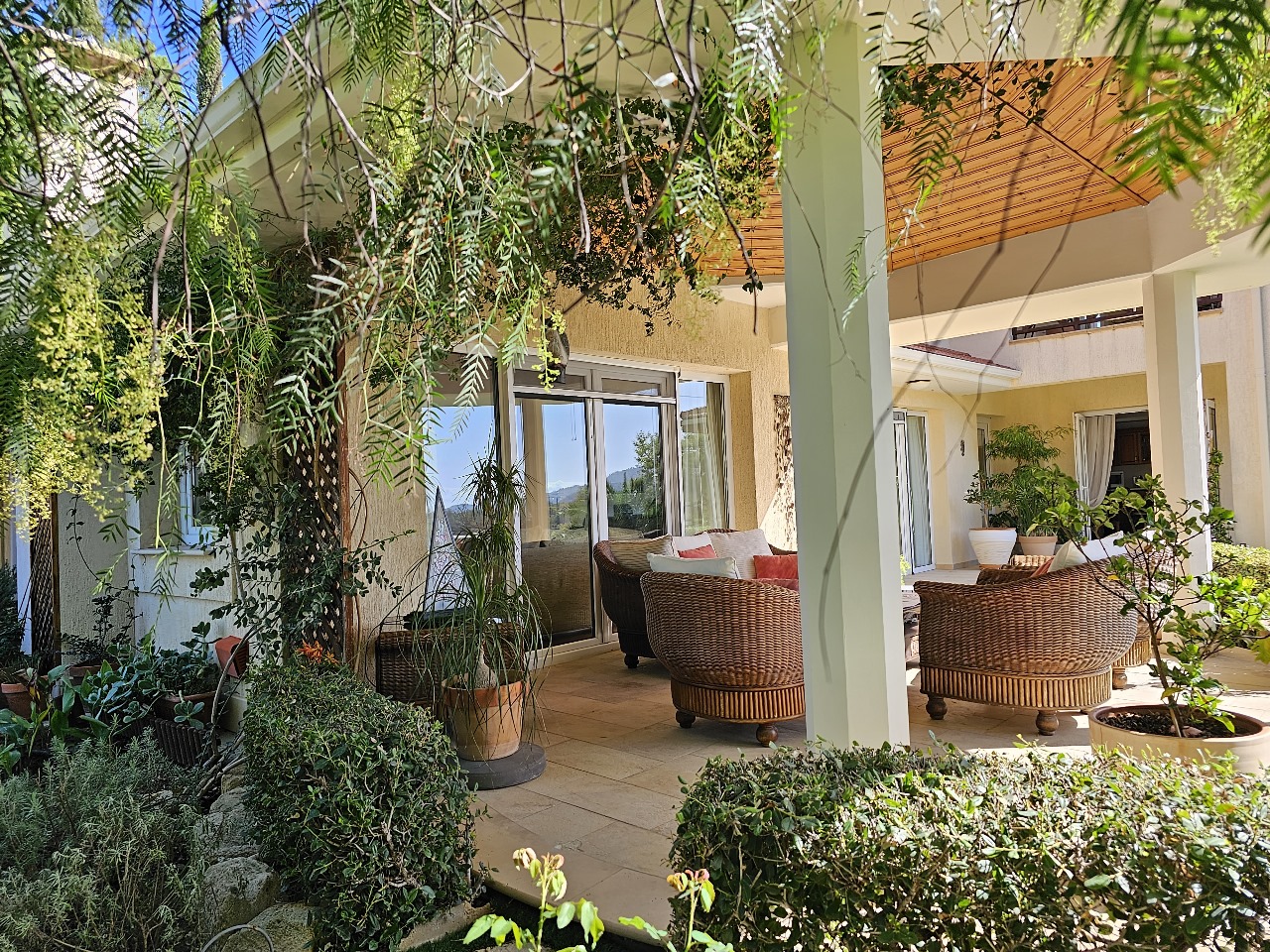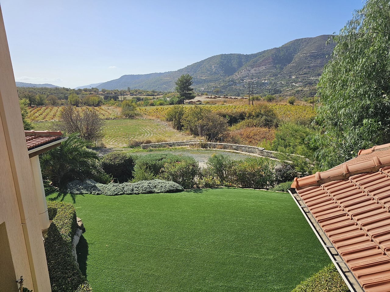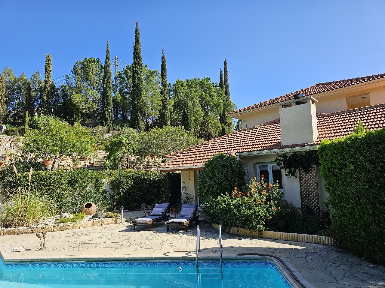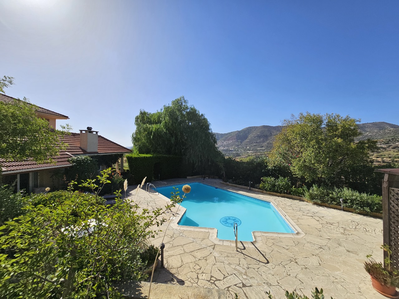 Detached duplex villa with pool for sale is located in the beautiful village of Laneia, Limassol district, just 600 meters west of the main Limassol – Trimiklini road. This area has a mild climate, pleasant environment and is located a 20-minute drive from Limassol. The covered area is 400 m2, the land area is 2,361 m2. The villa has an open and unobstructed view to the south. The house was built of very good quality reinforced concrete and brick materials, solid parquet floors, built-in carpet, ceramic tiles. Solid wood entrance door, interior wooden doors and wardrobes, double glazed windows, suspended ceiling with spot lighting and sloping pitched roof, fireplace, central oil heating, split air conditioning system in all living areas. Equipped kitchen with high-quality Gaggenau appliances, alarm system, automatic entrance gates. There is a swimming pool and a barbecue area. In the southern part of the plot there is a private driveway leading to a covered garage for two cars, an additional building and the entrance to the house. The vast area around the house, as well as in the northern part of the plot, is paved with paths made of Cypriot stone and landscaped with a beautifully planted mature garden. An automatic irrigation system has been installed, and it is also irrigated from its own well. The villa consists On the ground floor of an entrance hall, a dining room, a living room, a TV room / study, a kitchen with an informal sitting area and a dining room, an additional kitchen / laundry room, a guest toilet, covered verandas, a patio and a staircase leading to the second floor, The second floor consists of a corridor, a master bedroom with a dressing room, a bathroom with shower and toilet, bedroom with bathroom with toilet, bedroom with bathroom with shower and toilet and two verandas. An annex on the ground floor, consisting of an entrance hall, a bedroom, a kitchenette, a shower room with a toilet and a covered garage of 55 m2.An enclosed garage for two cars, three wooden storerooms, a swimming pool (45 m2), extensive paved paths and a well-maintained garden with lots of trees and plants,