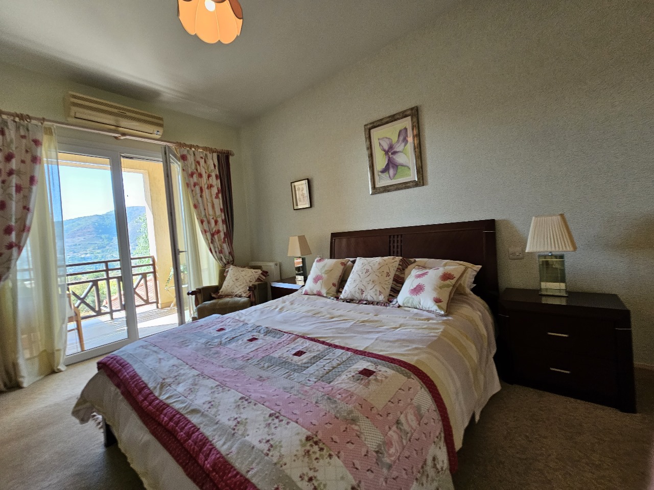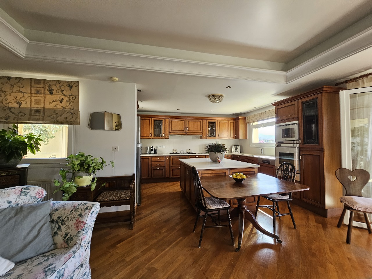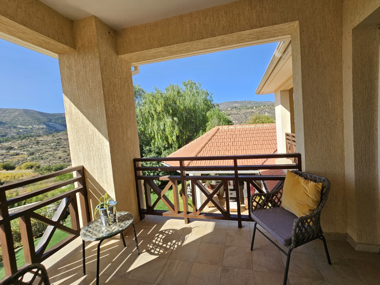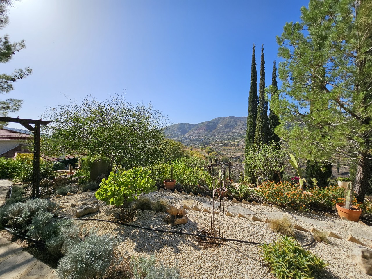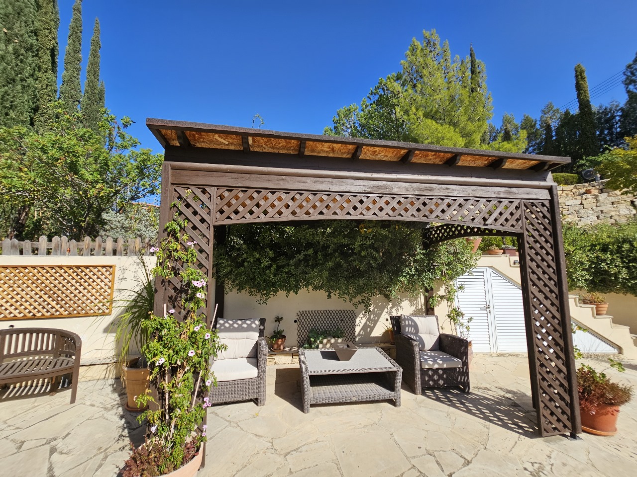 Detached duplex villa with pool for sale is located in the beautiful village of Laneia, Limassol district, just 600 meters west of the main Limassol – Trimiklini road. This area has a mild climate, pleasant environment and is located a 20-minute drive from Limassol. The covered area is 400 m2, the land area is 2,361 m2. The villa has an open and unobstructed view to the south. The house was built of very good quality reinforced concrete and brick materials, solid parquet floors, built-in carpet, ceramic tiles. Solid wood entrance door, interior wooden doors and wardrobes, double glazed windows, suspended ceiling with spot lighting and sloping pitched roof, fireplace, central oil heating, split air conditioning system in all living areas. Equipped kitchen with high-quality Gaggenau appliances, alarm system, automatic entrance gates. There is a swimming pool and a barbecue area. In the southern part of the plot there is a private driveway leading to a covered garage for two cars, an additional building and the entrance to the house. The vast area around the house, as well as in the northern part of the plot, is paved with paths made of Cypriot stone and landscaped with a beautifully planted mature garden. An automatic irrigation system has been installed, and it is also irrigated from its own well. The villa consists On the ground floor of an entrance hall, a dining room, a living room, a TV room / study, a kitchen with an informal sitting area and a dining room, an additional kitchen / laundry room, a guest toilet, covered verandas, a patio and a staircase leading to the second floor, The second floor consists of a corridor, a master bedroom with a dressing room, a bathroom with shower and toilet, bedroom with bathroom with toilet, bedroom with bathroom with shower and toilet and two verandas. An annex on the ground floor, consisting of an entrance hall, a bedroom, a kitchenette, a shower room with a toilet and a covered garage of 55 m2.An enclosed garage for two cars, three wooden storerooms, a swimming pool (45 m2), extensive paved paths and a well-maintained garden with lots of trees and plants,