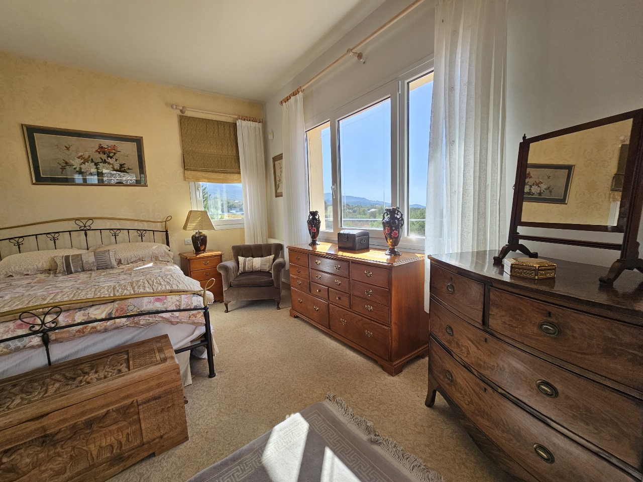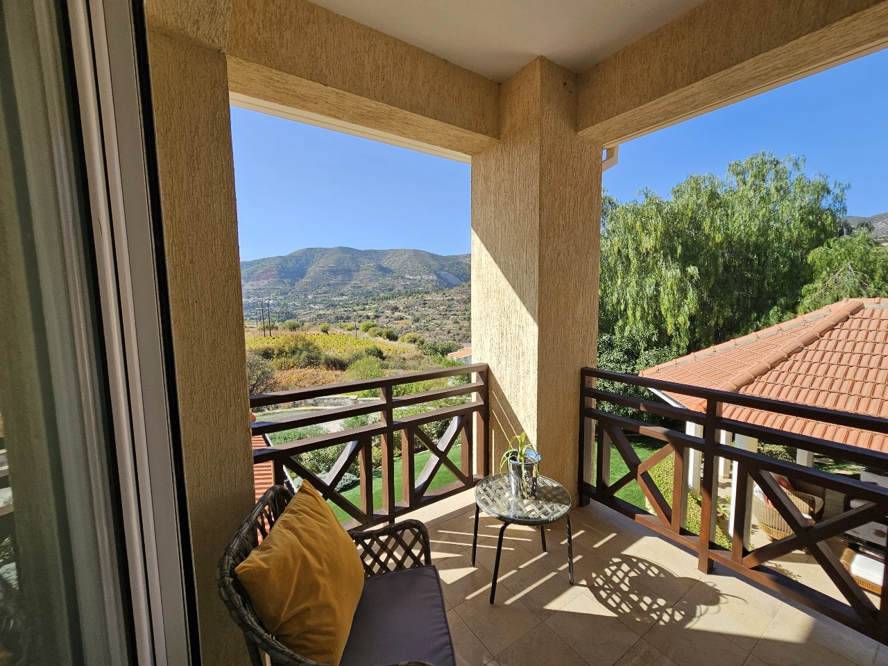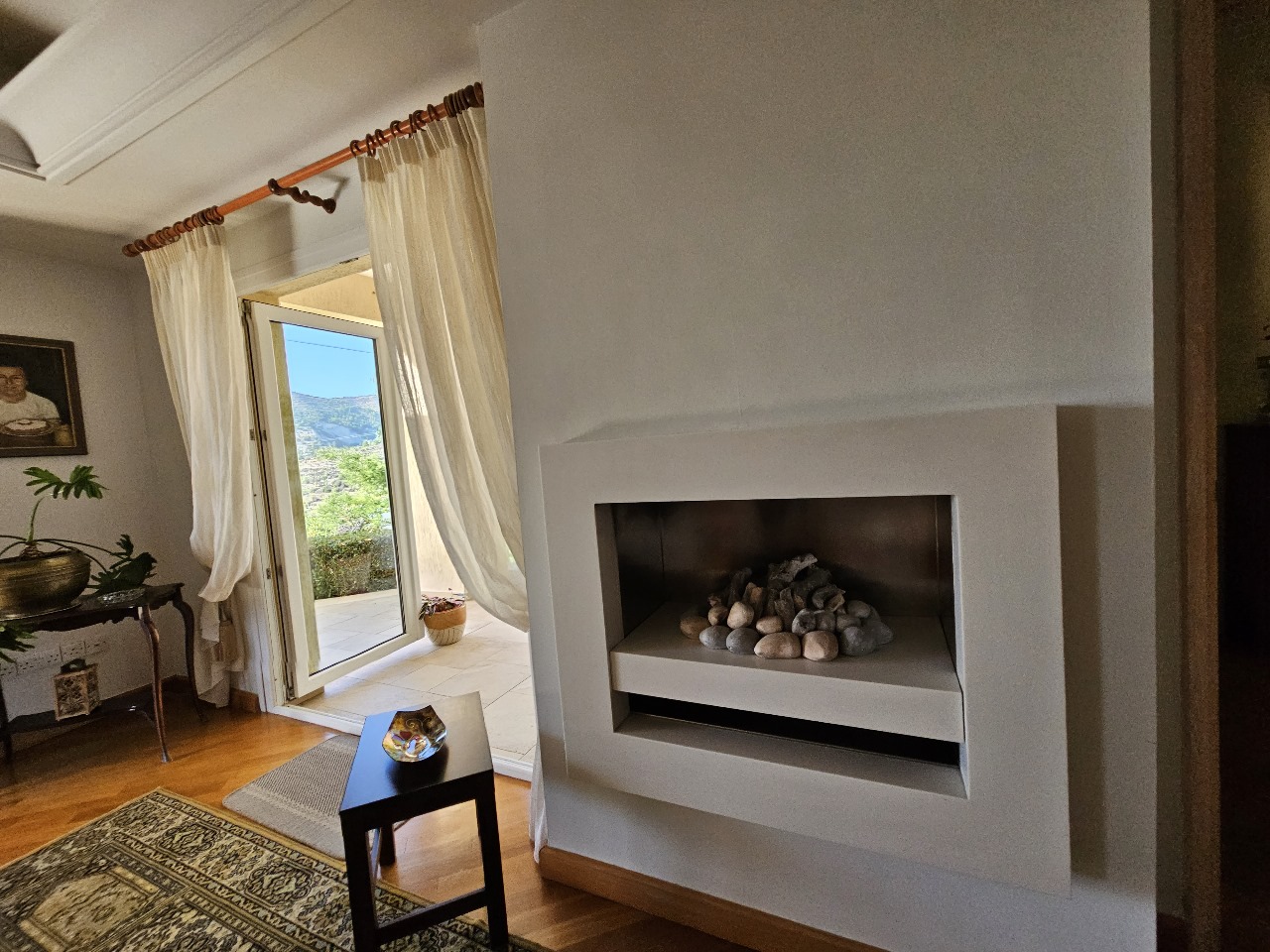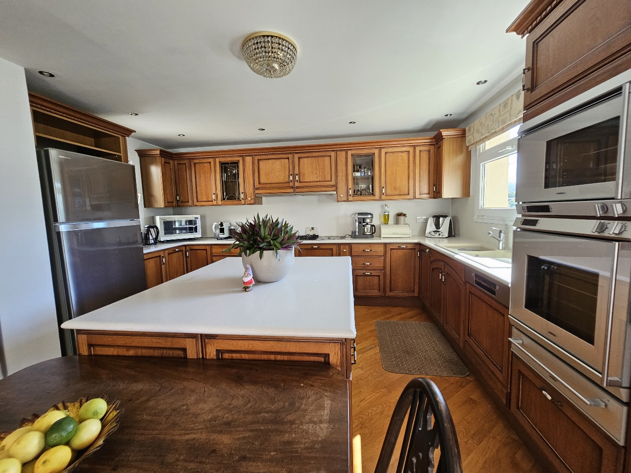 Detached duplex villa with pool for sale is located in the beautiful village of Laneia, Limassol district, just 600 meters west of the main Limassol – Trimiklini road. This area has a mild climate, pleasant environment and is located a 20-minute drive from Limassol. The covered area is 400 m2, the land area is 2,361 m2. The villa has an open and unobstructed view to the south. The house was built of very good quality reinforced concrete and brick materials, solid parquet floors, built-in carpet, ceramic tiles. Solid wood entrance door, interior wooden doors and wardrobes, double glazed windows, suspended ceiling with spot lighting and sloping pitched roof, fireplace, central oil heating, split air conditioning system in all living areas. Equipped kitchen with high-quality Gaggenau appliances, alarm system, automatic entrance gates. There is a swimming pool and a barbecue area. In the southern part of the plot there is a private driveway leading to a covered garage for two cars, an additional building and the entrance to the house. The vast area around the house, as well as in the northern part of the plot, is paved with paths made of Cypriot stone and landscaped with a beautifully planted mature garden. An automatic irrigation system has been installed, and it is also irrigated from its own well. The villa consists On the ground floor of an entrance hall, a dining room, a living room, a TV room / study, a kitchen with an informal sitting area and a dining room, an additional kitchen / laundry room, a guest toilet, covered verandas, a patio and a staircase leading to the second floor, The second floor consists of a corridor, a master bedroom with a dressing room, a bathroom with shower and toilet, bedroom with bathroom with toilet, bedroom with bathroom with shower and toilet and two verandas. An annex on the ground floor, consisting of an entrance hall, a bedroom, a kitchenette, a shower room with a toilet and a covered garage of 55 m2.An enclosed garage for two cars, three wooden storerooms, a swimming pool (45 m2), extensive paved paths and a well-maintained garden with lots of trees and plants,