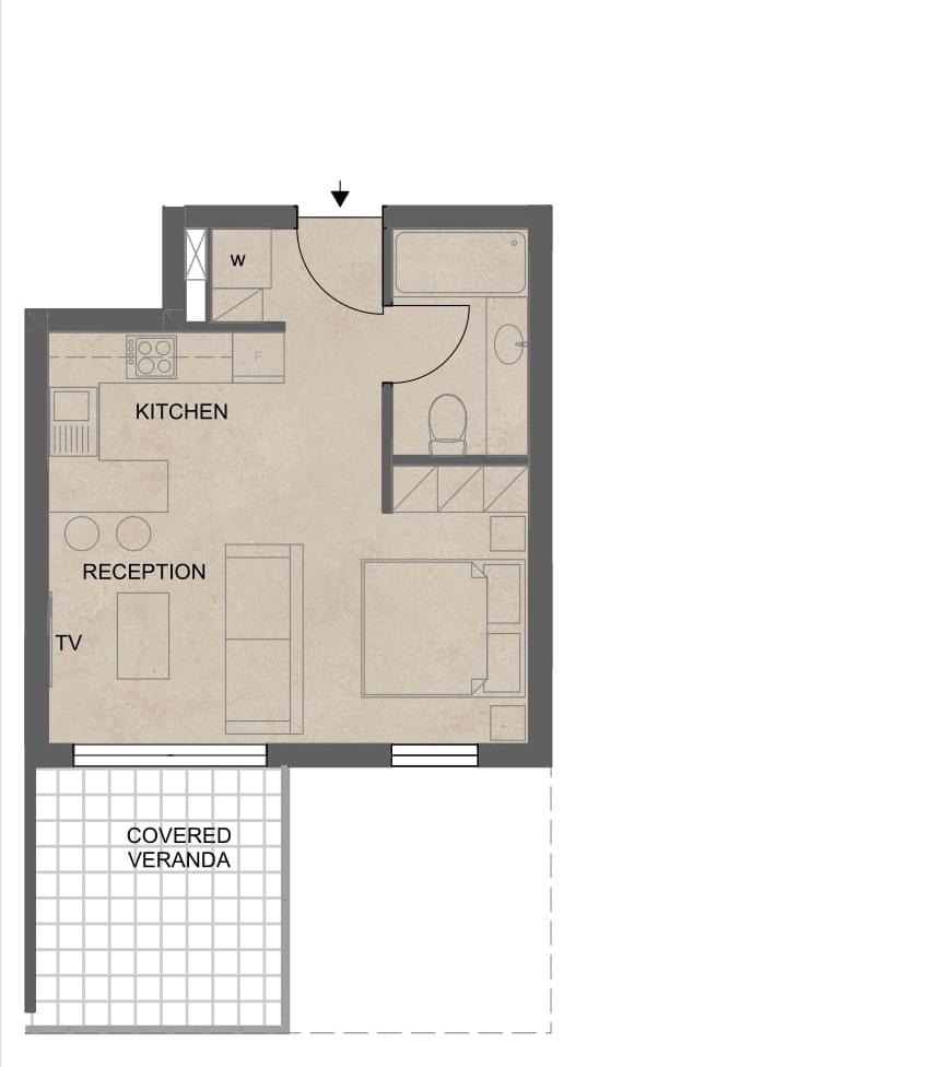 Studio for sale in a residential complex in the Livadia area, Larnaca. The complex includes 114 apartments and office spaces located around a green central courtyard.