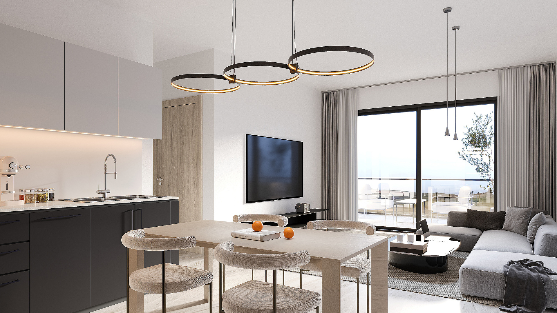 Each apartment in the complex is designed with maximum comfort in mind. The project includes an open-plan living room and kitchen, as well as a covered veranda. Parking and a private storage room are also available.