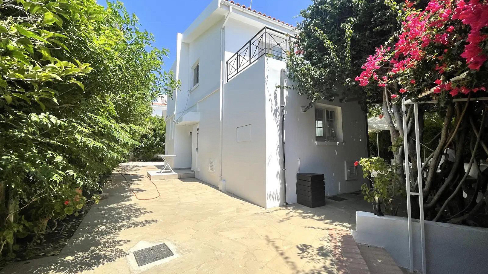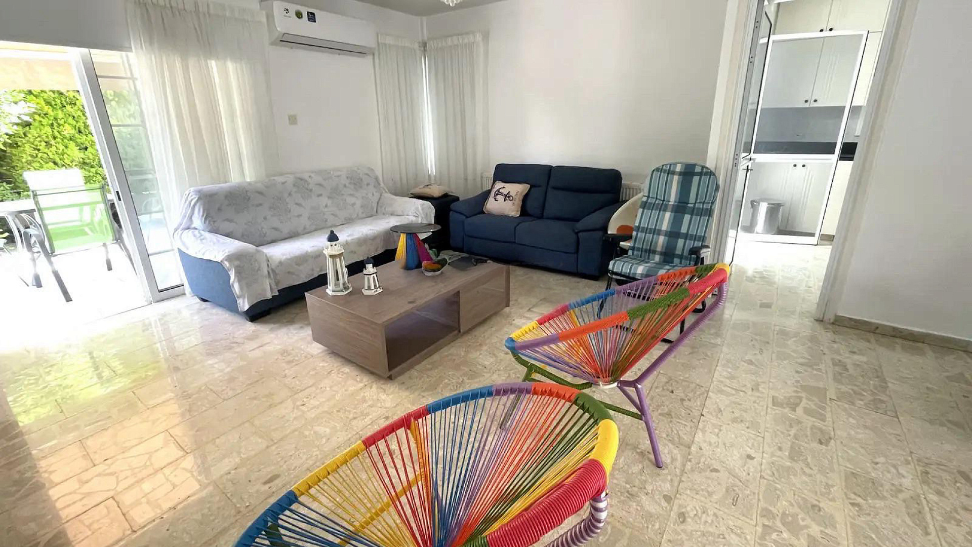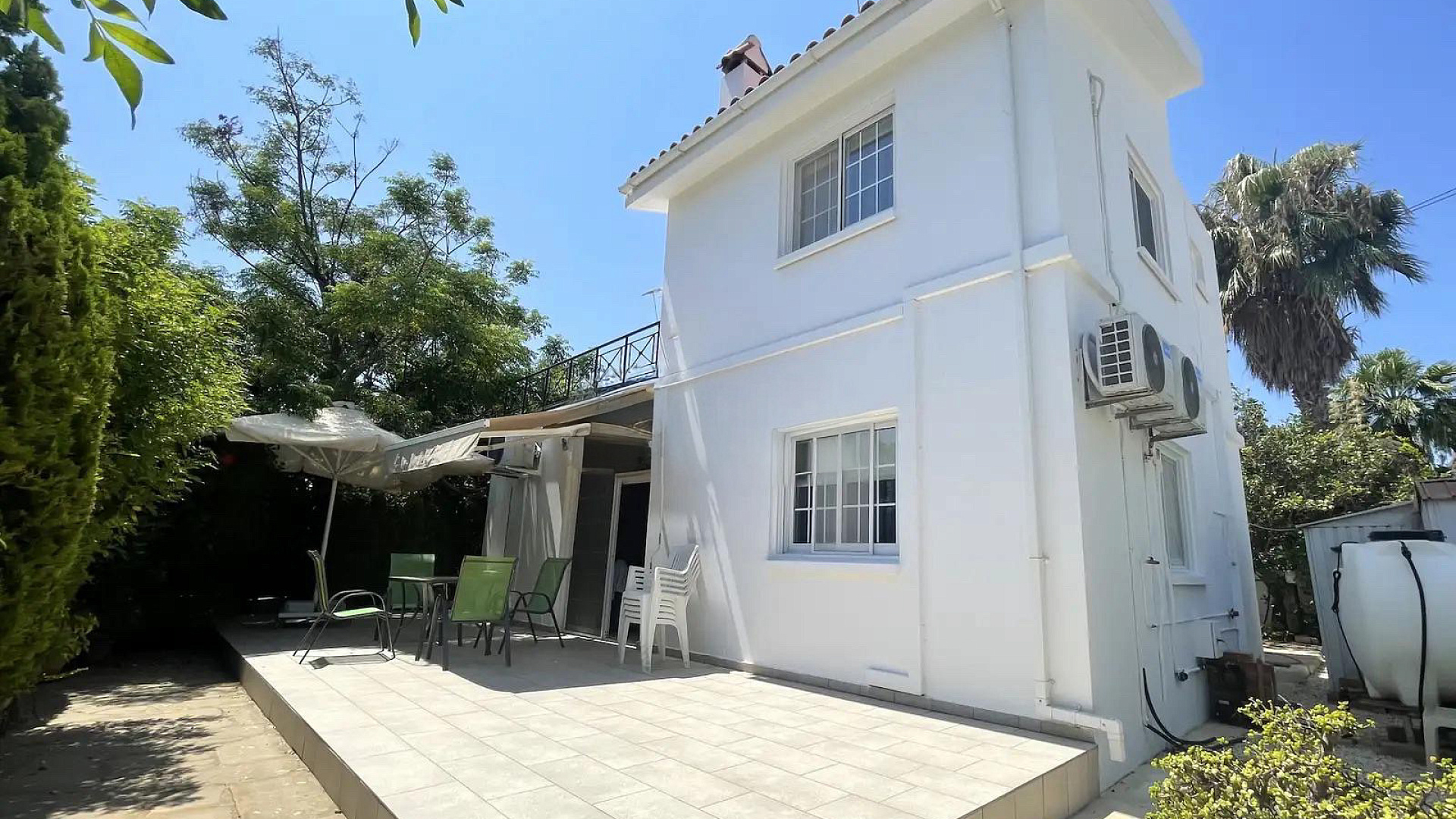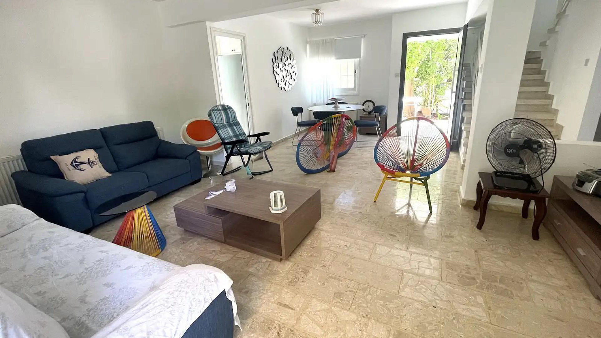 Three-bedroom 123 m2 villa for sale in Protaras, Famagusta. The villa includes a spacious living room with a fireplace combined with a dining area, a fully equipped kitchen with access to the terrace, three bedrooms and two bathrooms. On the first level there is a living room, a kitchen, a bedroom and a shower room, and on the second there are two bedrooms with a shared bathroom. The master bedroom has a private balcony with mountain views, as well as a shared large balcony for two rooms. The villa is fully furnished and equipped with household appliances. The interior is decorated with taste and comfort, creating an atmosphere of comfort and privacy. On the territory of the house there is a well-maintained garden with mature trees, a barbecue area and a spacious veranda, ideal for relaxing and meeting friends. The location of the property is one of the best in Protaras: just a 5—minute walk from Protaras main street and 10 minutes from Fig Tree Bay beach. Shops, restaurants, bus routes and all necessary amenities are within walking distance.