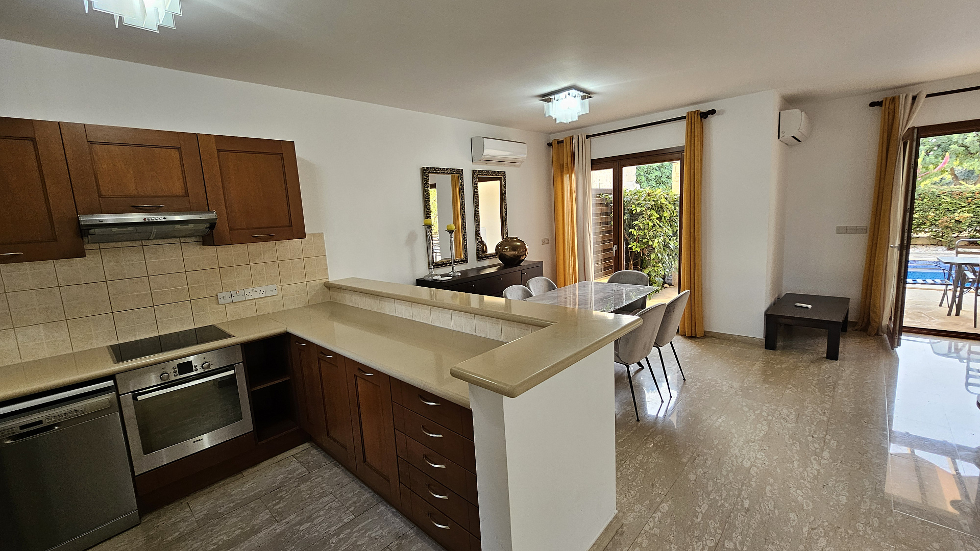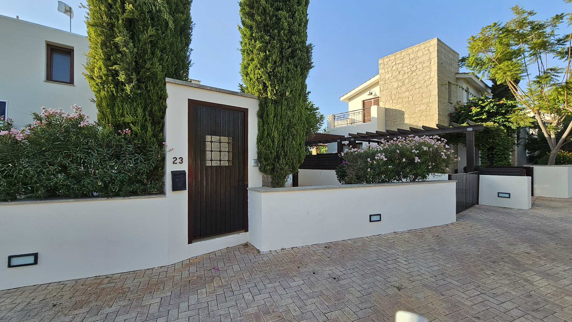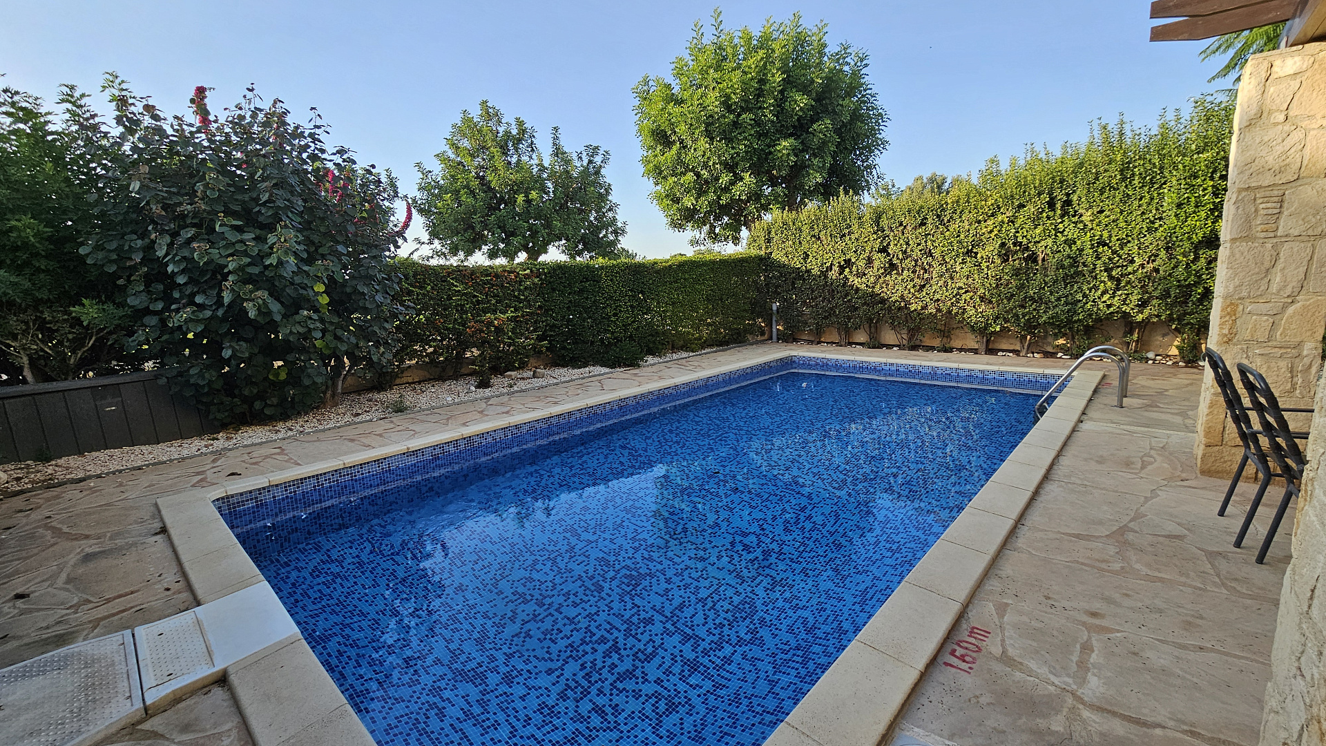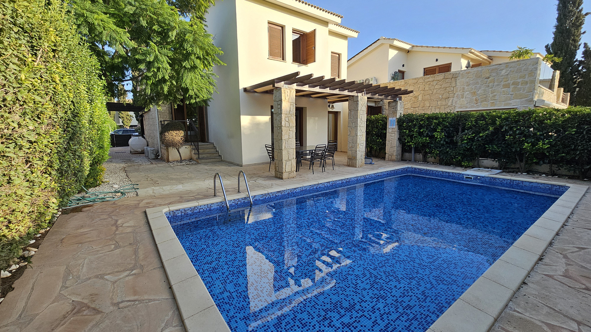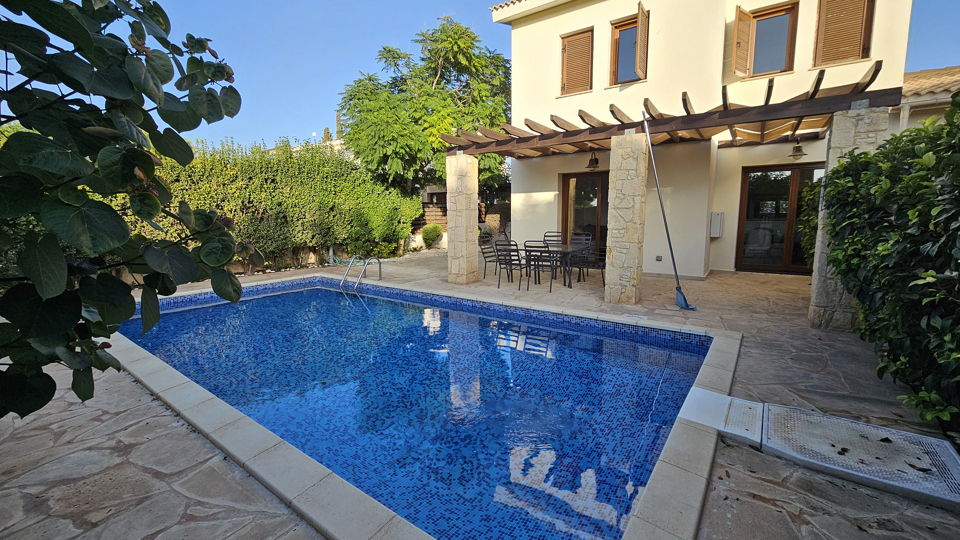 A three-bedroom semi-detached house is for sale in Kouklia, Paphos, with a total area of 180 m² on a 315 m² plot. The house is fully furnished and includes three bedrooms, two bathrooms, a storage room, a private pool, and a garden. There is uncovered parking and full air conditioning in all rooms. Built in 2005, energy efficiency class C. Available for rent from October 1, 2025.